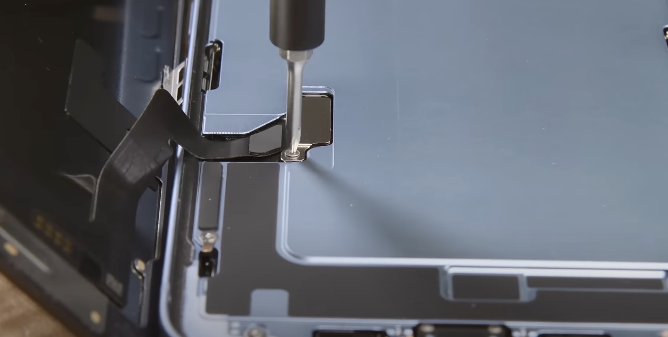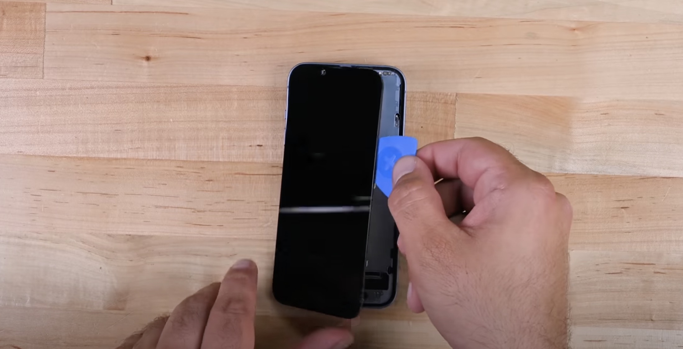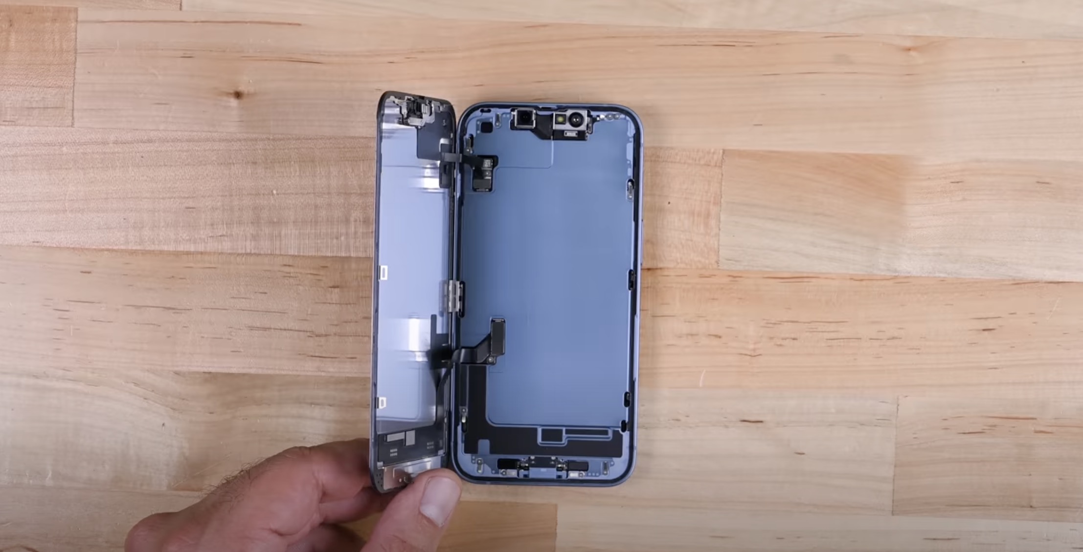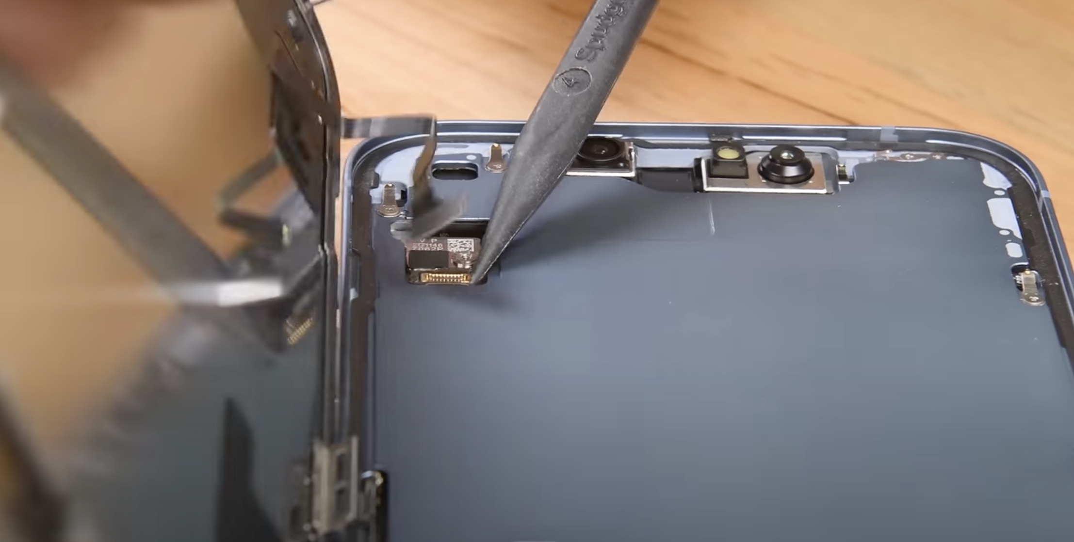 Tímto ale změny v útrobách nekončí. Zatímco u starších iPhonů jsme veškeré útroby v podobě hardwaru mohli vidět po odinstalování displeje, tak u iPhonů 14 (Plus) jsou tyto útroby viditelné právě po sejmutí zadního skla, tudíž došlo k jakémusi „překlopení“. K tomuto kroku se Apple uchýlil taktéž z důvodu zjednodušení oprav, v tomto případě displeje. Ten se na klasických „čtrnáctkách“ stále opravuje klasickým sejmutím, každopádně už pod ním nejsou vidět útroby, ale pouze kovový plát, který odděluje vnitřnosti z druhé strany. Po otevření ze strany displeje jdou ve zmíněném plátu vidět prakticky pouze dva výřezy, skrze které je displej zezadu připojen k základní desce. Stačí tedy odšroubovat dva ochranné plíšky konektorů, odpojit displej a jednoduše ho vyměnit, samozřejmě s nutností přenesení horního ústrojí na nový displej, viz video níže.