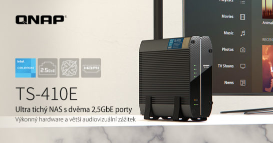 Tisková zpráva: Společnost QNAP® Systems, Inc., přední inovátor v oblasti počítačových, síťových a úložných řešení, představila nový profesionální NAS TS-410E, navržený pro multimediální centra a prostředí citlivá na hluk. Model TS-410E s chlazením bez ventilátorů nabízí vysokorychlostní I/O zahrnující dva porty 2,5GbE, sloty SATA SSD, porty USB 3.2 Gen 2 (10 Gb/s) a 4K výstup přes HDMI. Uspokojuje tak požadavky náročných aplikací, jako jsou přenos a streamování objemných souborů, virtuální počítače či přenos pracovních ploch virtuálních počítačů nebo záznamů z dozorování.