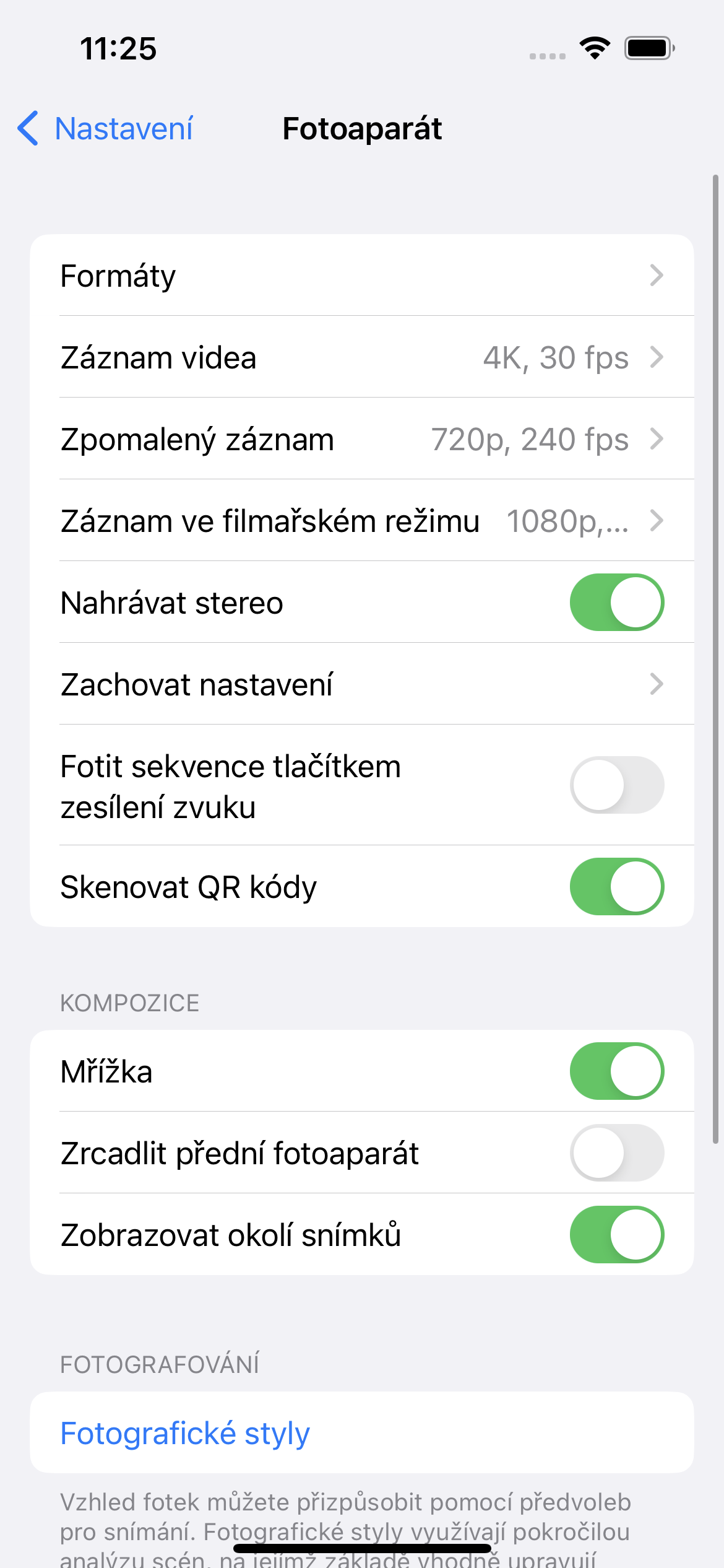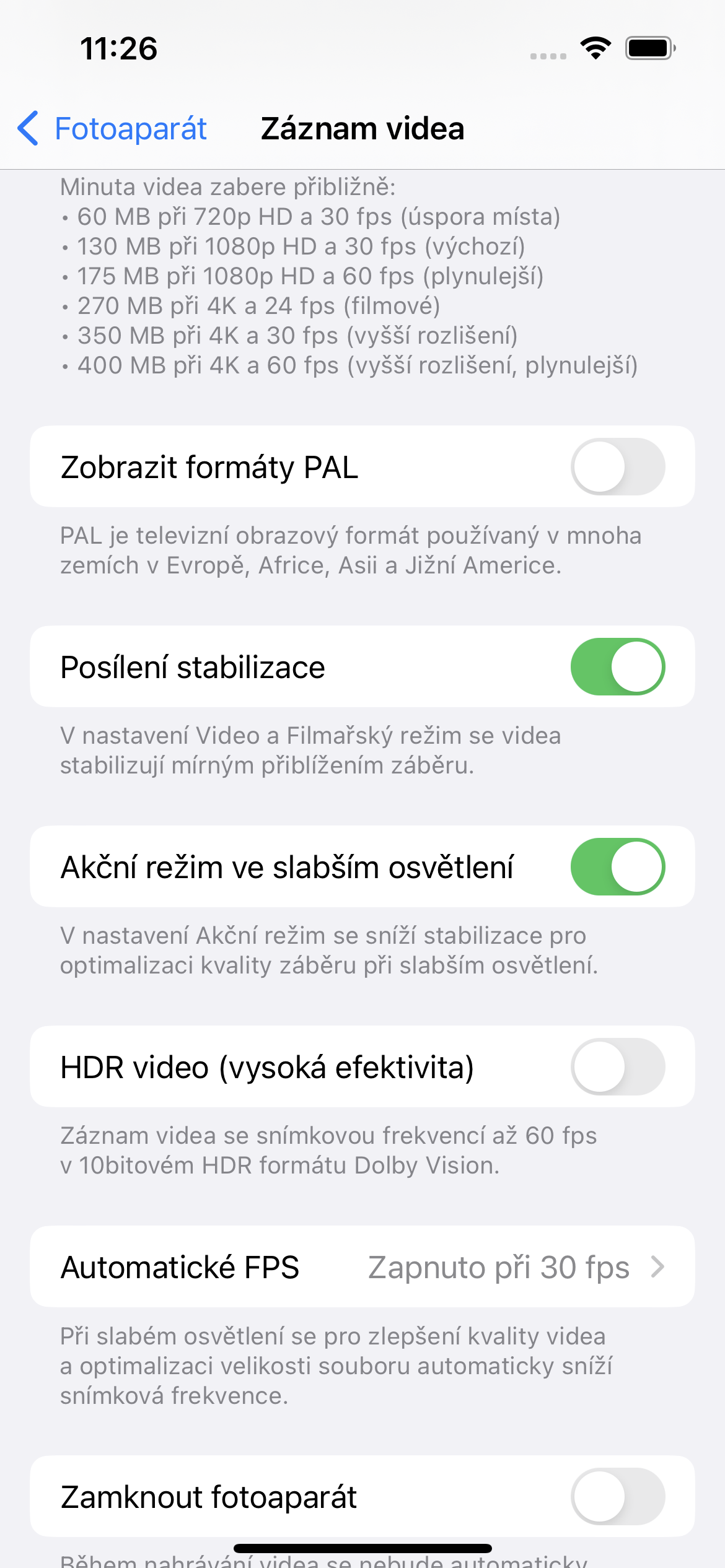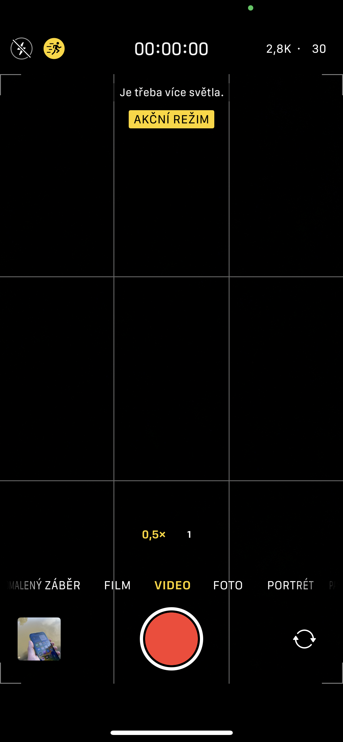 Filmařský režim konečně dosahuje svého potenciálu, když mu Apple přidal rozlišení 4K, a to při 24 nebo 30 fps. Jenže tento režim už nikoho nezajímá, když je žhavou novinkou režim akční. Ten se vám zobrazuje jen v režimu videa u symbolu blesku. Po jeho aktivaci jste v přílišném šeru upozorněni, že máte nedostatek světa, takže se samozřejmě hodí mít ho dostatek. V Nastavení -> Fotoaparát -> Záznam videa si nicméně můžete zapnout možnost Akční režim ve slabším osvětlení. Tato volba pak snižuje účinnost stabilizace vůči množství dostupného světla.