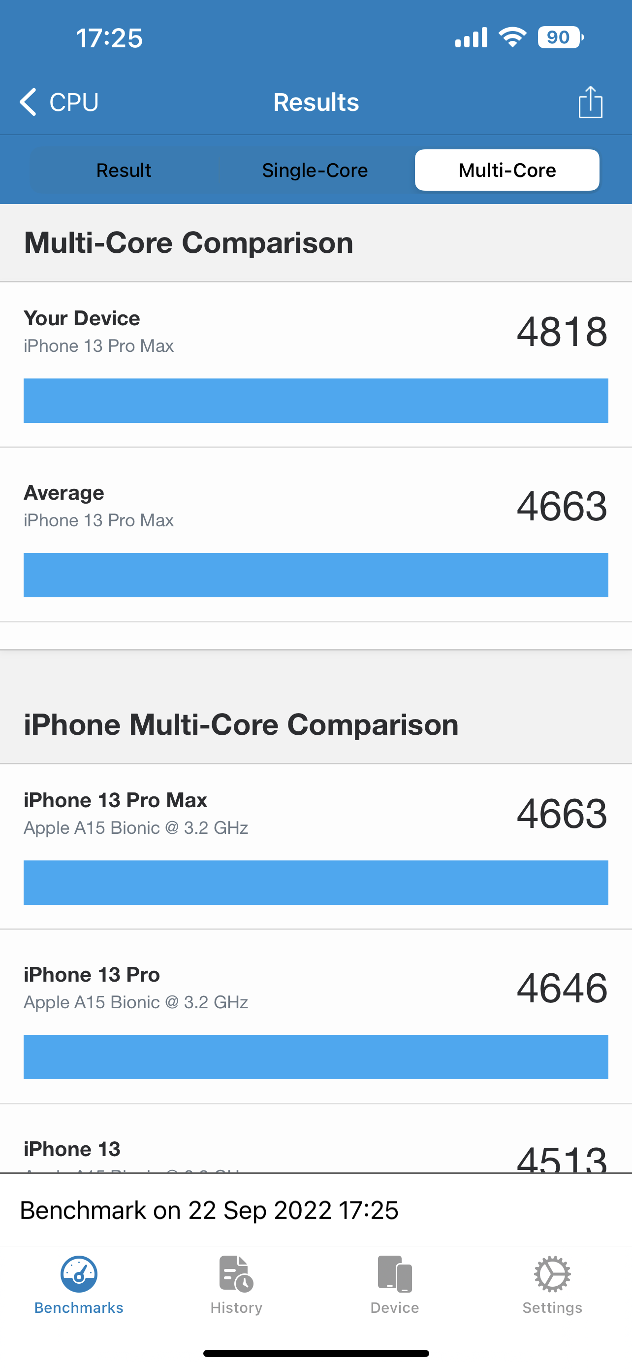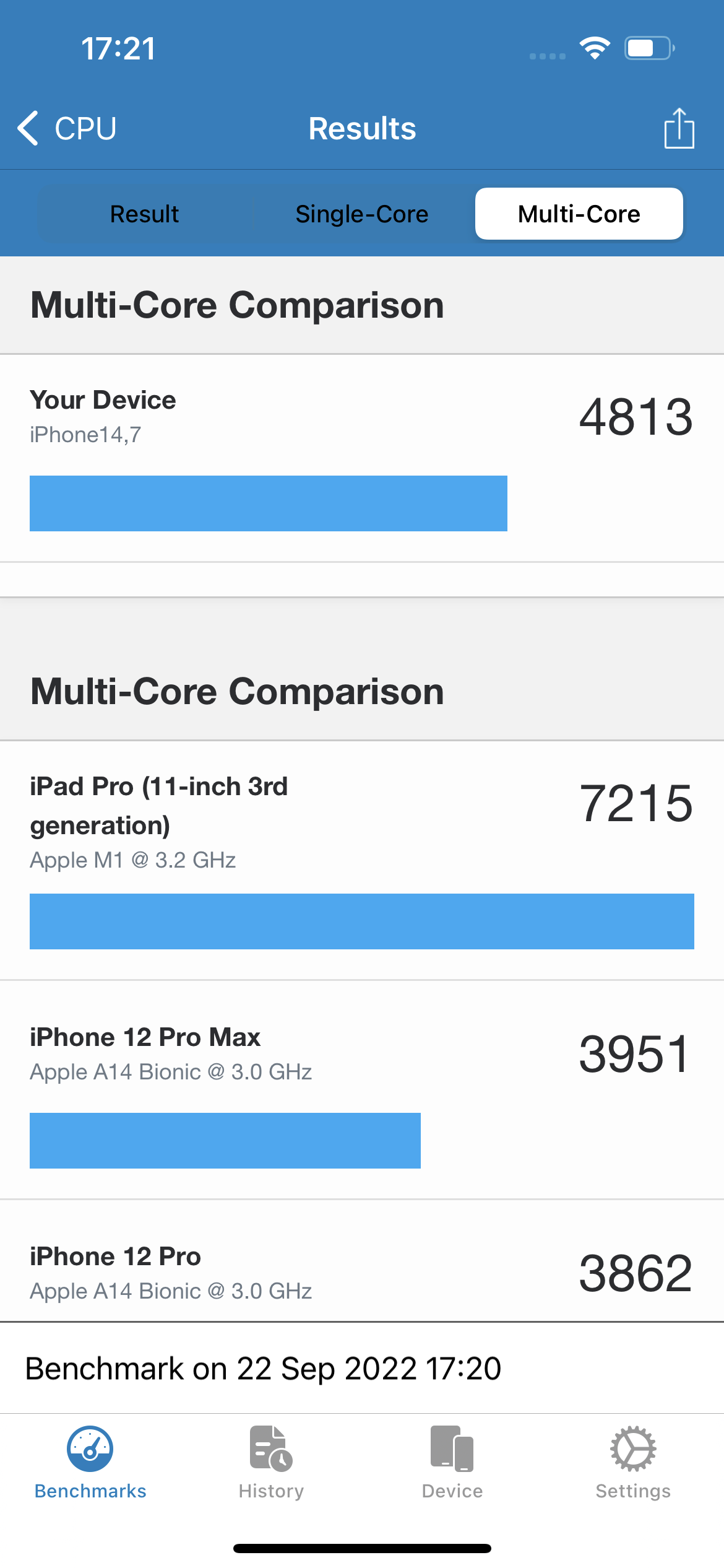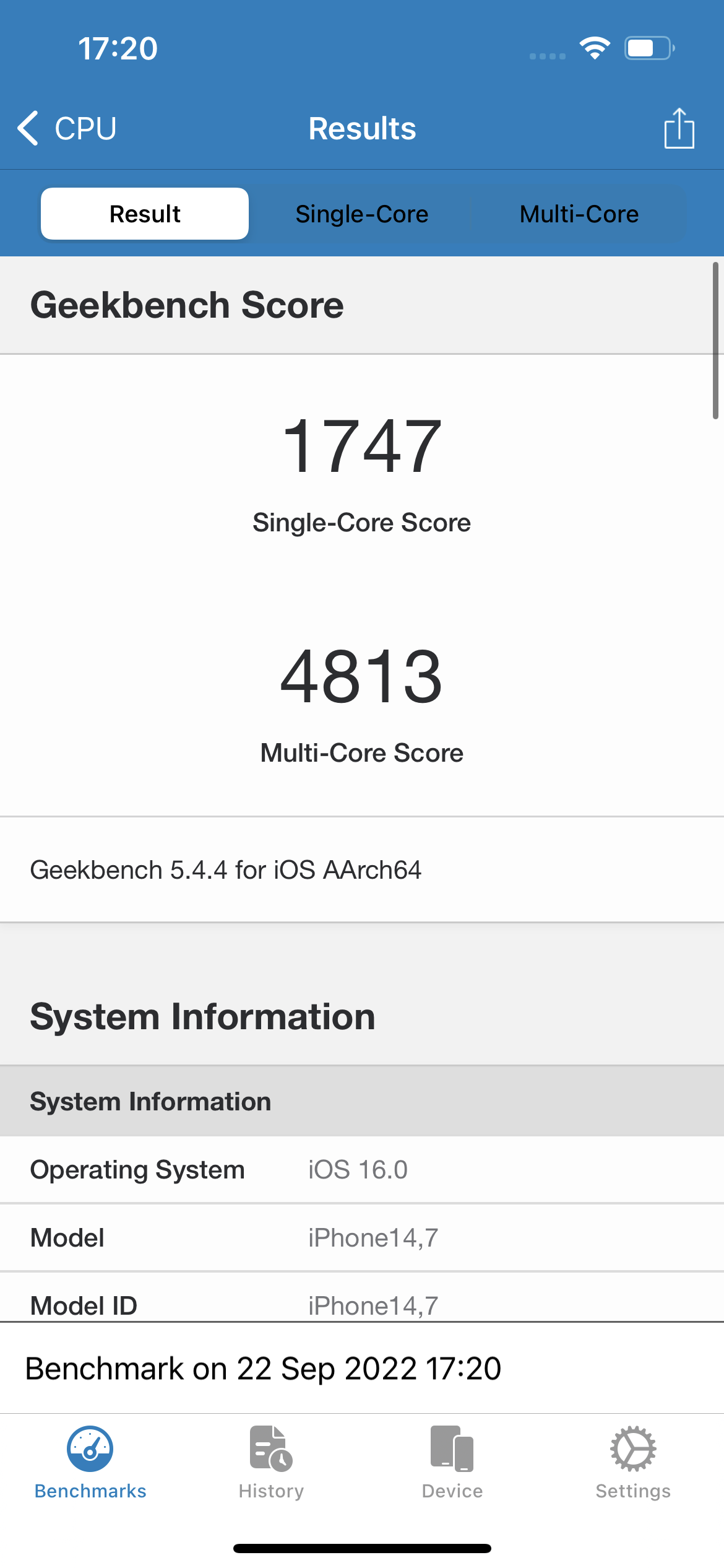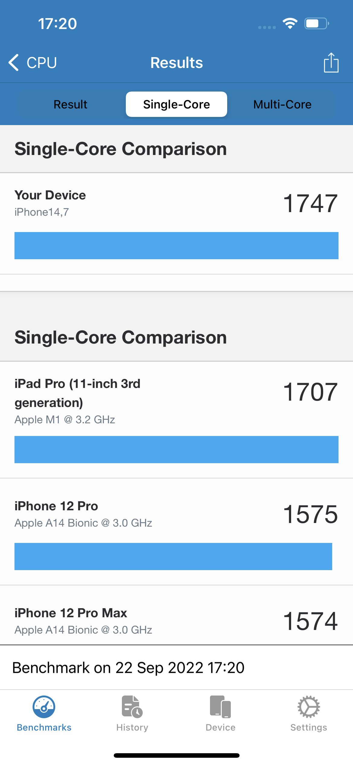 Protože rok používám iPhone 13 Pro Max, zatím jsem nenarazil na jeho výkonnostní strop. Vše jede pořád příkladně a vlastně v přímém porovnání s iPhonem 14 Pro Max nepoznáte rozdíl. Ten může přijít až s postupem času. Aktuálně je to tedy opravdu jedno, že má iPhone 14 rok starý čip, za 5 let to ale může být palčivější problém. Výše v galerii najdete benchmark Geekbench iPhonu 14, níže je pak ten iPhonu 13 Pro Max. Jen pro pořádek uveďme, že RAM je zde 6 GB, i když na tomto údaji dle Applu vůbec nezáleží.