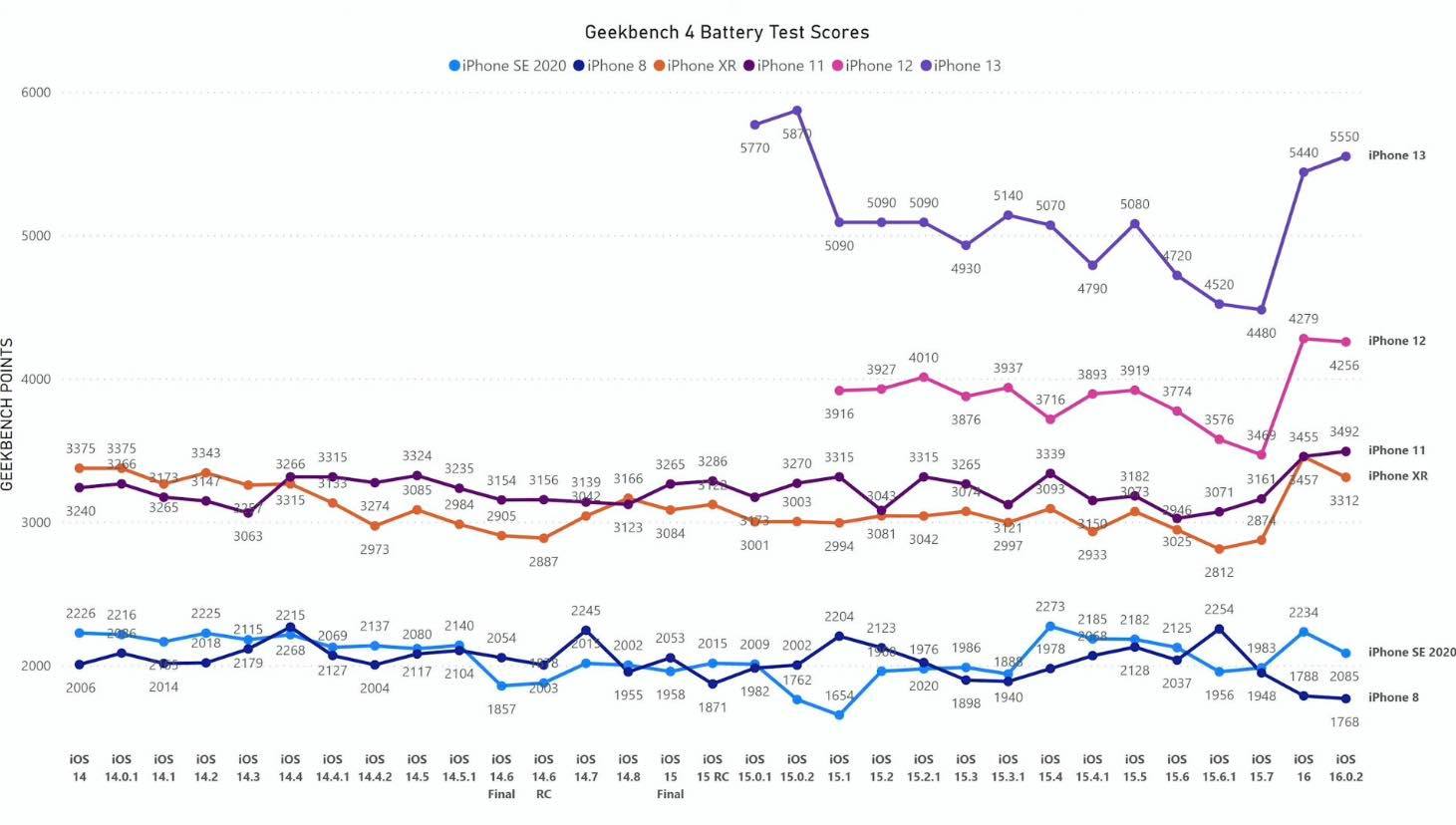 V minulém týdnu na naše iPhony dorazila minoritní aktualizace v podobě iOS 16.0.2. Ta příliš novinek neukázala a soustředila se především na opravy porodních bolestí, které přinesla ostrá verze iOS 16. Jak už ale víme z minulosti, i sebemenší aktualizace dokáže nějakým způsobem „zamávat“ s aspekty rychlosti či výdrže. Dnes se tedy podíváme, jakým způsobem se změnila výdrž baterie u iPhonů 8, SE 2020, XR, 11, 12 a 13. Test jako obvykle provedl kanál iAppleBytes v aplikaci Geekbench 4. Celý test můžete nalézt pod odstavcem, abyste si na něj mohli udělat obrázek sami.