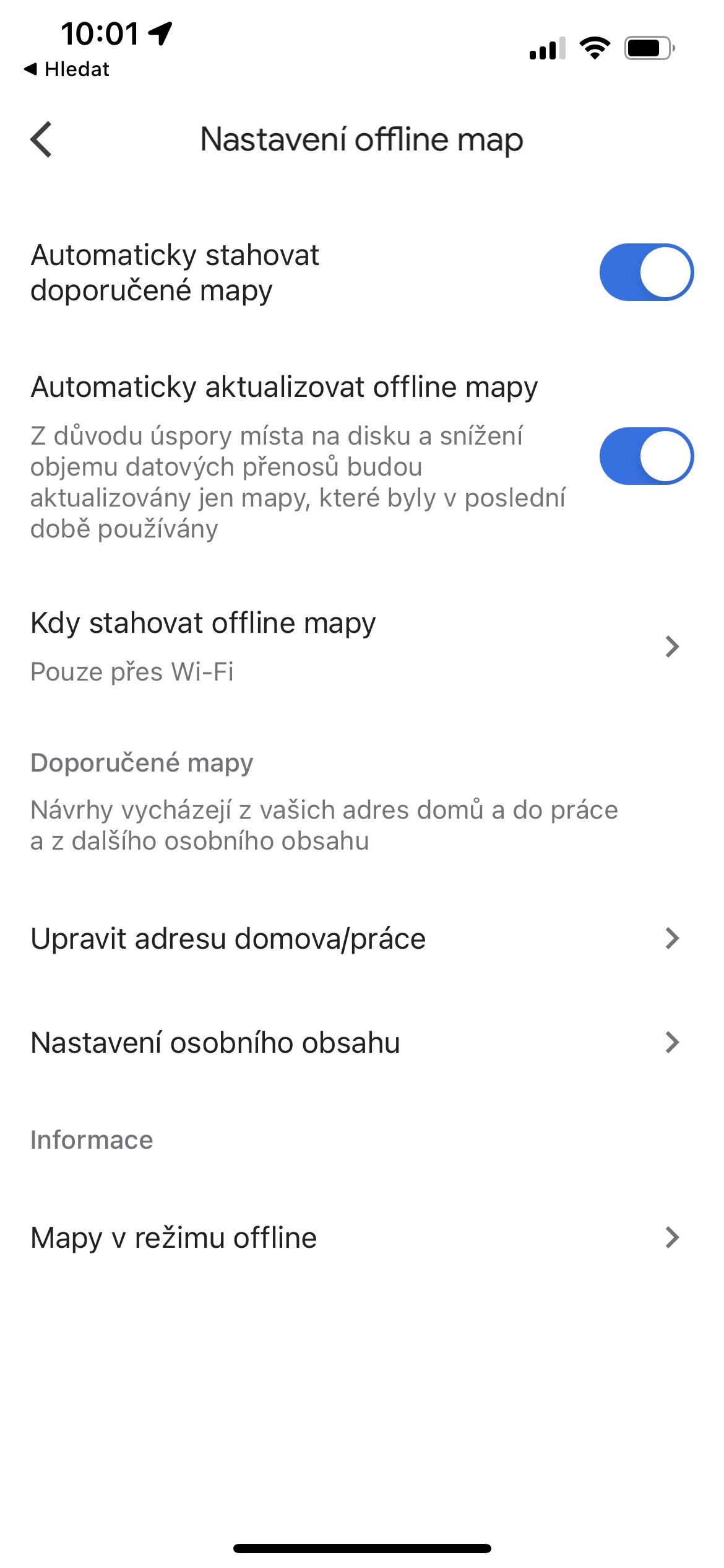 Aby vás nemuselo trápit vaše internetové připojení, je zde možnost si stáhnout vybrané mapy do paměti svého iPhone. Nemusíte pak řešit, zda nejste zrovna v místě, kde není signál, což se navíc většinou nachází tam, kde zrovna opravdu mapy potřebujete. Ideální je mít staženo ve svém telefonu alespoň oblasti, kam se například chystáte na dovolenou nebo pokud to kapacita vašeho telefonu umožňuje, klidně celou Evropu. Stažené mapy se pak mohou automaticky aktualizovat, můžete je vymazat, editovat, přejmenovat nebo si můžete dokonce povolit automatické stahování oblíbených map do offline režimu.