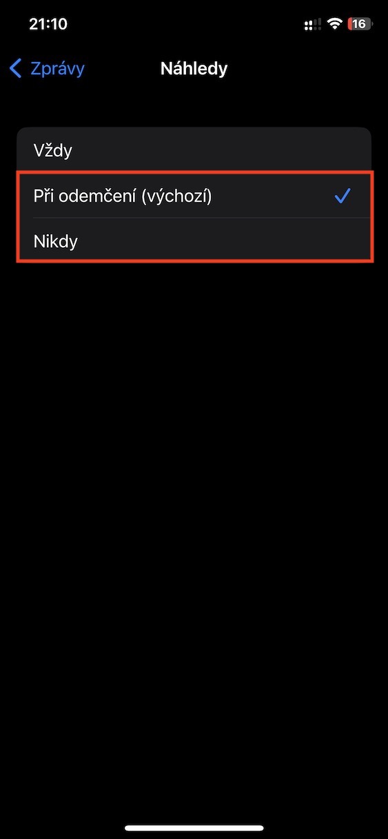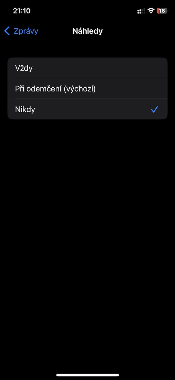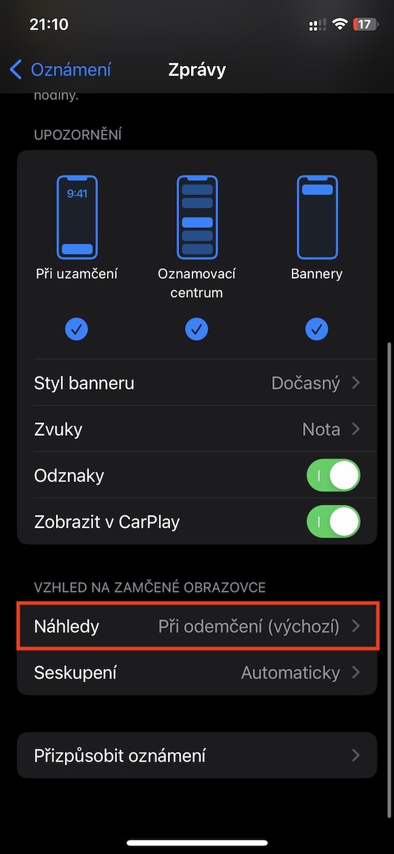 V případě, že máte iPhone s Face ID, tak jsou ve výchozím nastavení veškeré náhledy oznámení vypnuté. To znamená, že když se vám doručí oznámení, tak se zobrazí, z jaké pochází aplikace, avšak samotný obsah se objeví až po autorizaci. U starších iPhonů s Touch ID se pak ve výchozím nastavení náhledy zobrazují i na zamknuté obrazovce. Pokud chcete zachovat soukromí, tak je nutné náhledy nastavit tak, aby se zobrazily právě až po odemčení, anebo vůbec. Toho docílíte v Nastavení → Obecné → Zprávy → Náhledy.