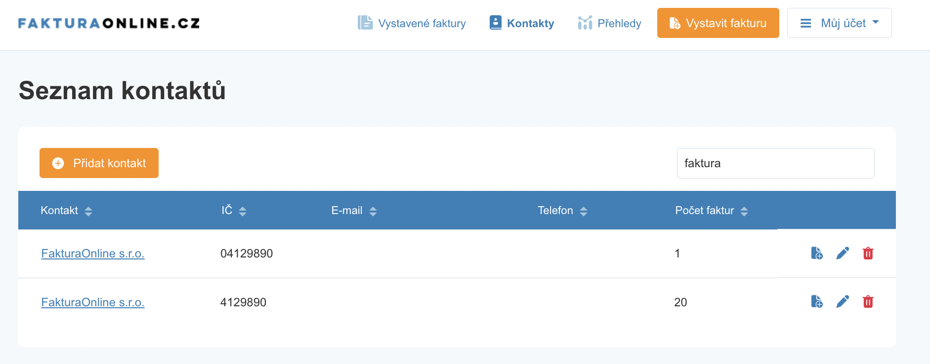 Při vystavování faktur na stejné IČO nemusíte vyplňovat fakturační údaje vždy znovu. Systém si ukládá všechny podrobnosti do administrace kontaktů. V této sekci lze následně kontakty spravovat, nebo přidat nové a to i v případě, že jste danému odběrateli ještě fakturu nevystavovali. Nástroj umožňuje například i vyfiltrování všech vystavených faktur danému odběrateli. Vše je přehledné a intuitivní.