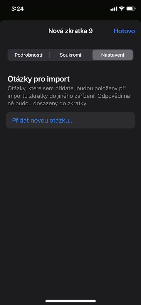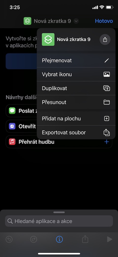 Pokud na liště ve spodní části klepnete na malé i v kroužku, můžete nastavit podrobnosti zkratky – například přidat zkratku na plochu, přidat ji na list sdílení, na Apple Watch, nebo ji umístit na lištu nabídek v horní části obrazovky vašeho Macu. Pokud chcete přizpůsobit ikonku, název a další parametry zkratky, klepněte na její název v horní části displeje iPhonu. V menu, které se vám zobrazí, můžete podle potřeby zvolit přejmenování zkratky, výběr ikonky, vybrat umístění pro uložení zkratky, duplikovat zkratku nebo ji třeba exportovat. Pro uložení zkratky klepněte na Hotovo v pravém horním rohu displeje vašeho iPhonu. Pro dodatečnou úpravu zkratky poté, co danou zkratku uložíte, klepněte na Zkratky v levém dolním rohu displeje vašeho iPhonu. Následně stačí jen najít panel s danou zkratkou a klepnout na ikonku tří teček v kolečku v pravém horním rohu tohoto panelu.