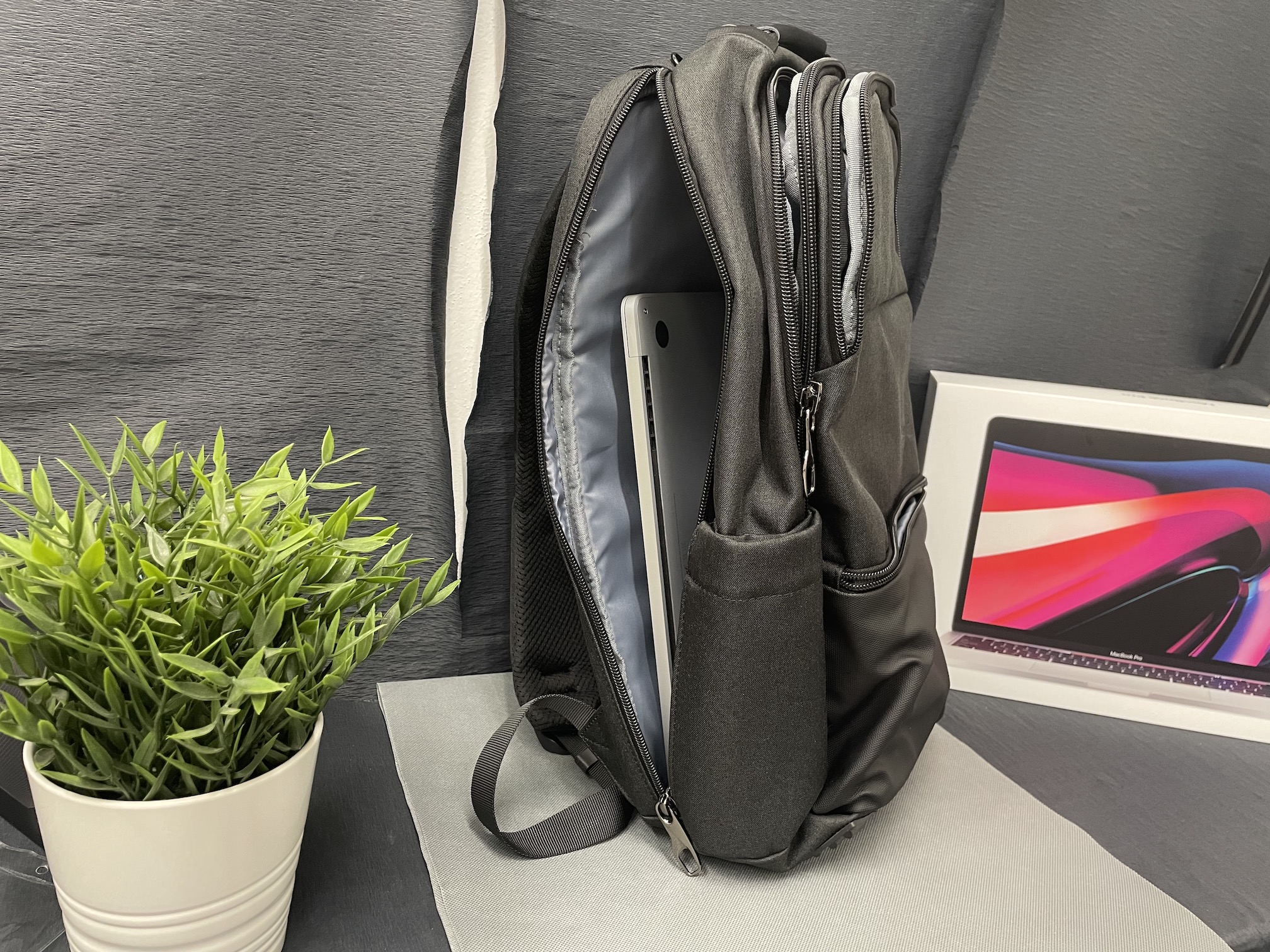 Za uchem batohu nahoře se nachází ještě jedna menší kapsa na osobní věci a drobnosti. Na jedné boční straně se nachází kapsa pro uschování dalších drobností, na druhé straně pak roztažitelná kapsa, do které vložíte bez problémů i větší pití. Vzhledem k tomu, že je tato kapsa na gumě, tak zajistí, že pořádně pití přitáhne a nedojde tak k jeho vypadnutí, jak to je často u jiných batohů. Dostáváme se k zadní části batohu, kde samozřejmě nechybí boční kapsa na přenosný počítač. Nejbezpečnější kapsa se pak nachází vzadu dole, ta má velmi nenápadné zapínání a vložit do ní můžete třeba peněženku či cokoliv jiného, u čeho nechcete riskovat ukradení. Navíc k tomu tato kapsa blokuje RFID. Poslední kapsa se pak nachází na levém popruhu batohu, do kterého se vleze třeba AirTag či další drobnosti. Zadní strana batohu je jinak polstrovaná, takže jej můžete nosit i delší dobu v různých podmínkách, nechybí na něm ani guma k připevnění na kufr pro cestování.