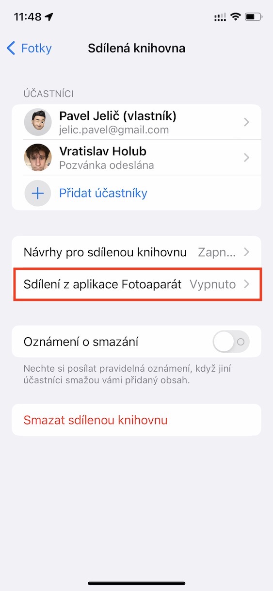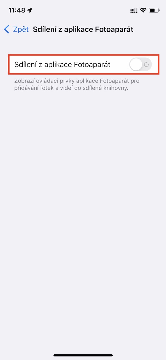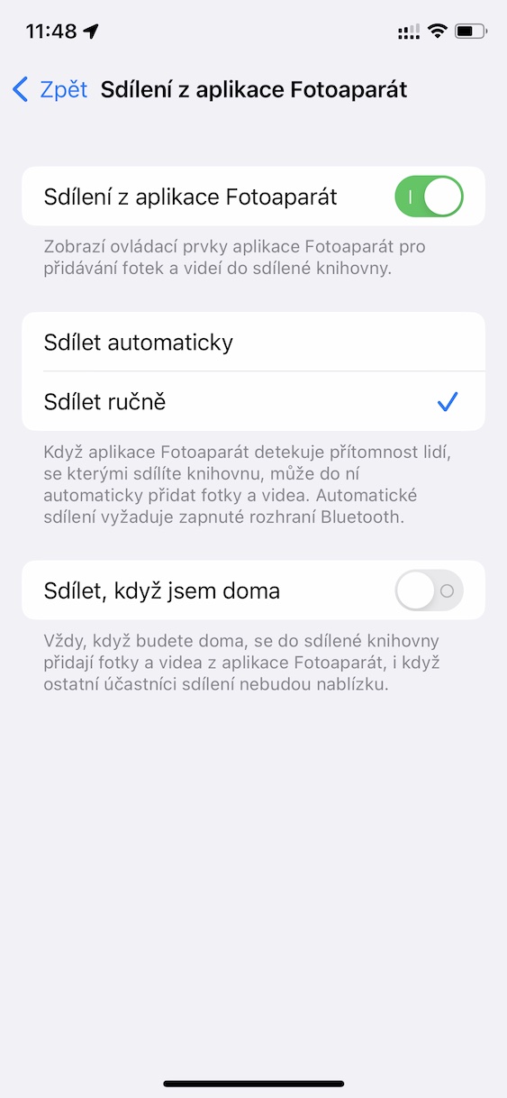 Pokud jste tuto funkci aktivovali, tak si přímo ve Fotoaparátu můžete jediným klepnutím nastavit, do které knihovny se mají nově pořízené fotografie a videa uložit. Stačí jen, abyste v levém horním rohu klepnuli na ikonu dvou panáčků. Pokud se nachází v žlutém kruhu, je aktivní ukládání do sdílené knihovny, a pokud jsou panáčci přeškrtnutí, tak se využívá k ukládání obsahu osobní knihovna. Pokud byste chtěli tuto funkci sdílení z Fotoaparátu vypnout, tak stačí přejít do Nastavení → Fotky → Sdílená knihovna → Sdílení z aplikace Fotoaparát.