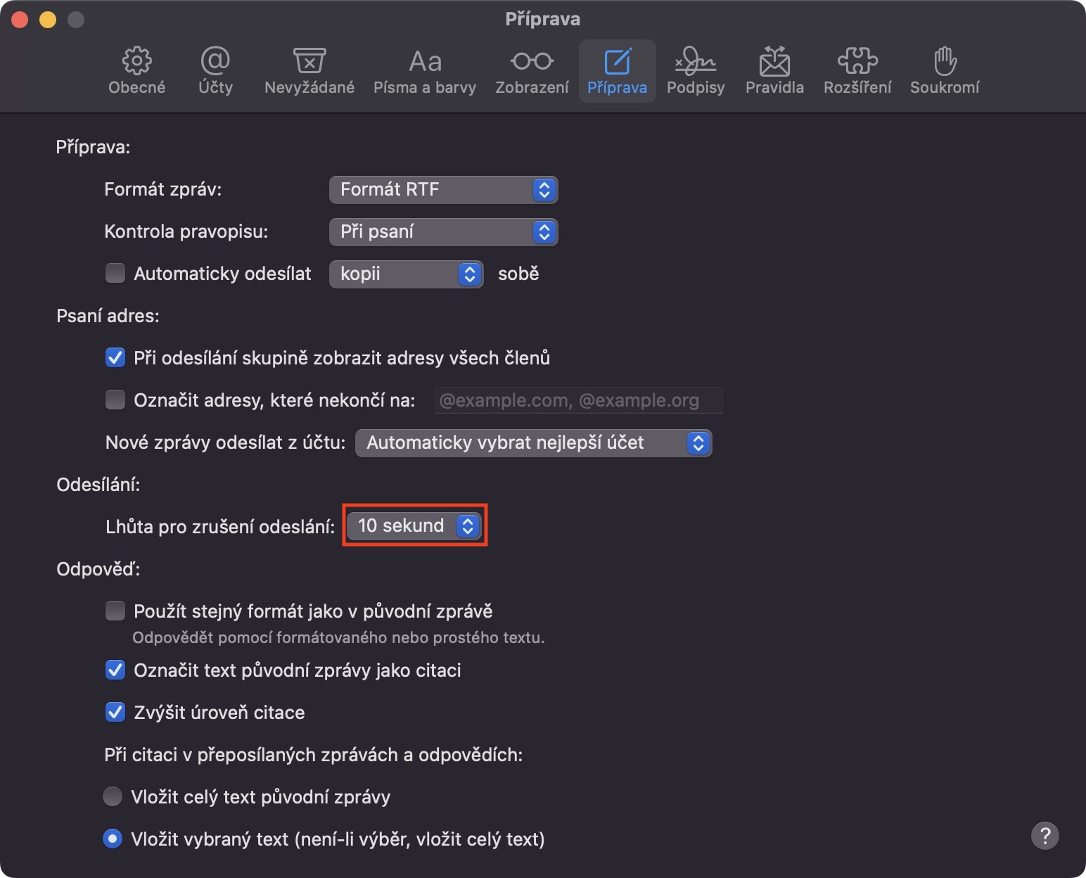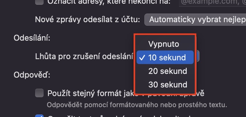 Na předchozí stránce jste se mohli dozvědět více o tom, jakým způsobem lze zrušit odeslání e-mailu. Ve výchozím nastavení máte na zrušení odeslání celých 10 sekund. Každopádně, pokud vám tato doba nedostačuje a chtěli byste ji zvýšit, abyste měli na rozmyšlenou více času, tak můžete. Stačí, abyste přešli do Mailu, a poté v horní liště rozklikněte Mail → Nastavení… → Příprava, kde v kategorii Odesílání rozklikněte menu vedle Lhůta pro zrušení odeslání. Zde už si můžete vybrat lhůtu 10 sekund, 20 sekund a 30 sekund, popřípadě můžete funkci naopak úplně vypnout.