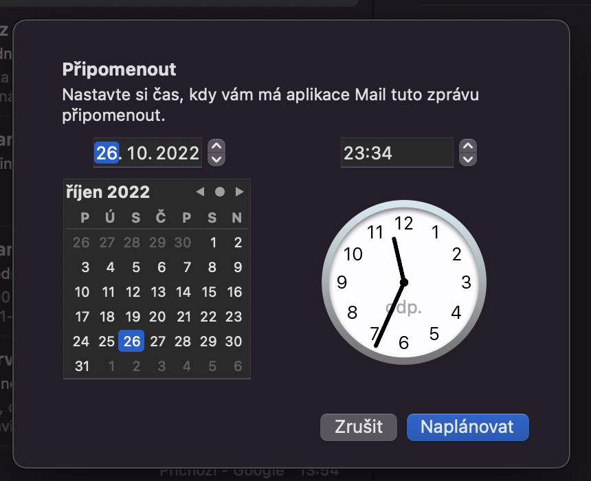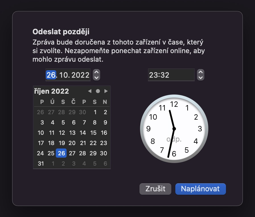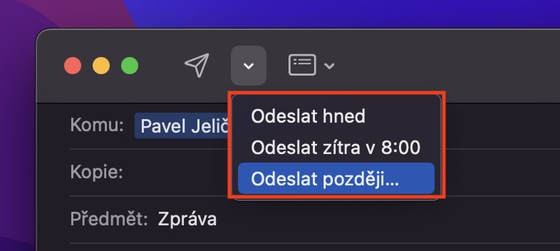 Jednou z hlavních novinek v Mailu z macOS Ventura je bezesporu plánování odeslání e-mailů. Tato funkce je v konkurenčních e-mailových klientech k dispozici již opravdu dlouhou dobu, takže je rozhodně fajn, že s ní konečně Apple přišel. Hodit se může hned v několika situacích, například pokud rádi odpovídáte na e-maily v pozdních večerních hodinách, ale nechcete je v tuto dobu odesílat. Pro naplánování odeslání se klasicky přesuňte do rozhraní nového e-mailu či odpovědi, kde pak napravo od tlačítka odeslání klepněte na ikonu malé šipky. Pak už si stačí vybrat buď jednu ze dvou předpřipravených dob odeslání, anebo klepněte na Odeslat později… a vyberte si přesný den a čas.