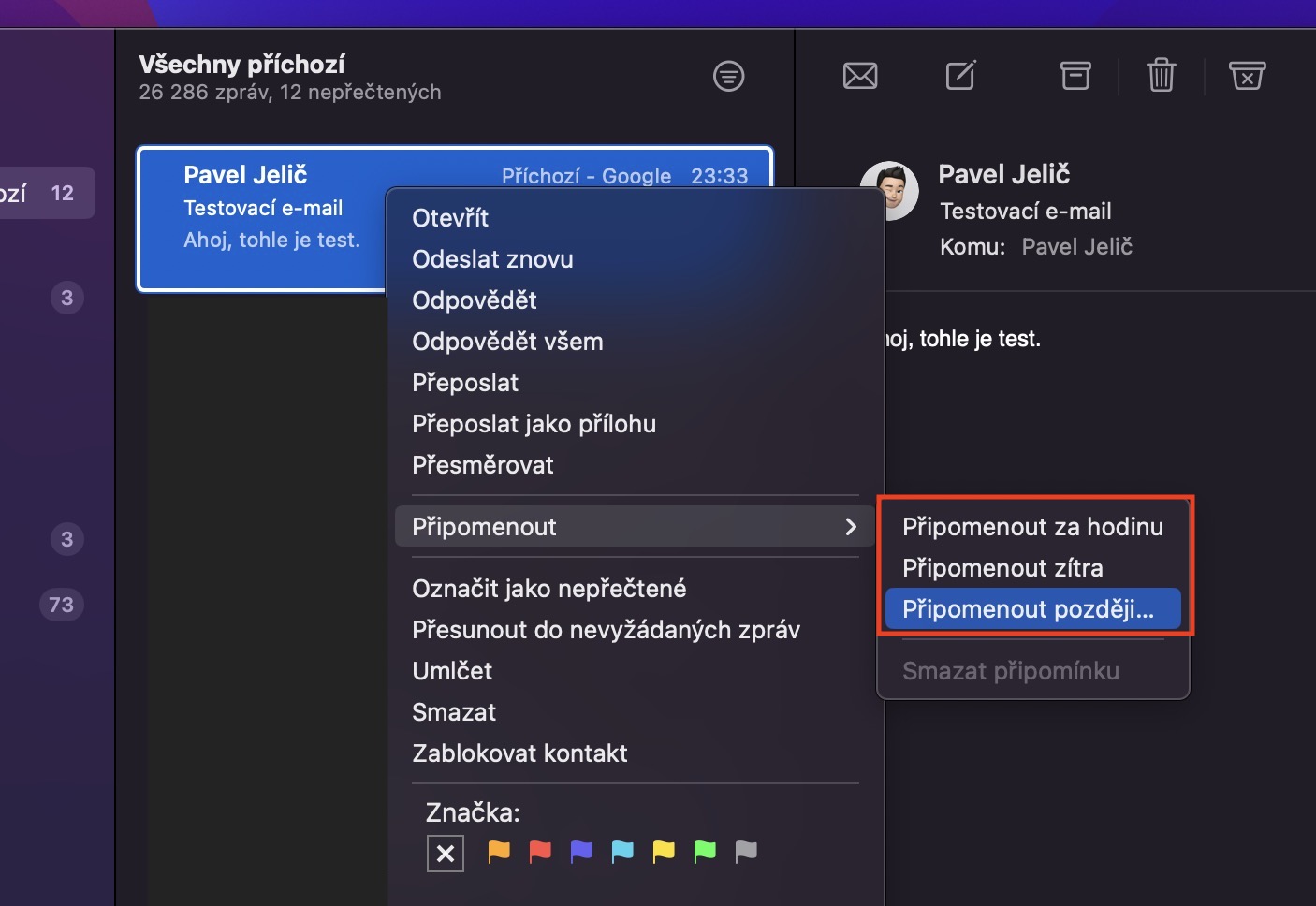 Stalo se vám někdy, že jste si nechtěně v nesprávnou chvíli přečetli nějaký příchozí e-mail a řekli jste si, že se na něj podíváte později? Jestliže ano, tak mi jistě dáte zapravdu když řeknu, že na něj jednoduše zapomenete, což následně můžete zjistit několika způsoby. V novém macOS Ventura si však můžete u e-mailů nastavit opětovně připomenutí prostřednictvím notifikace, takže na něj nezapomenete. Pro nastavení stačí, abyste na e-mail klepnuli pravým tlačítkem (dvěma prsty), a poté najeli v menu na Připomenout. Zde už si stačí vybrat buď předpřipravenou možnost, anebo klepnout na Připomenout později… a vybrat si přesný den a čas.