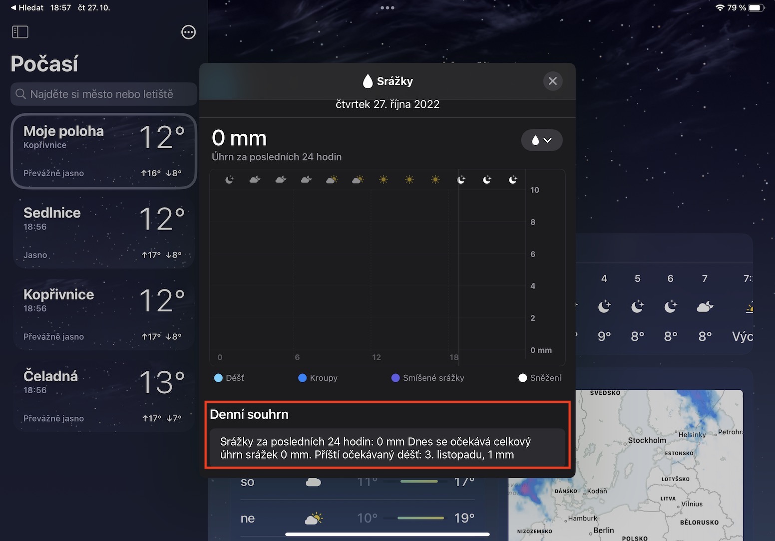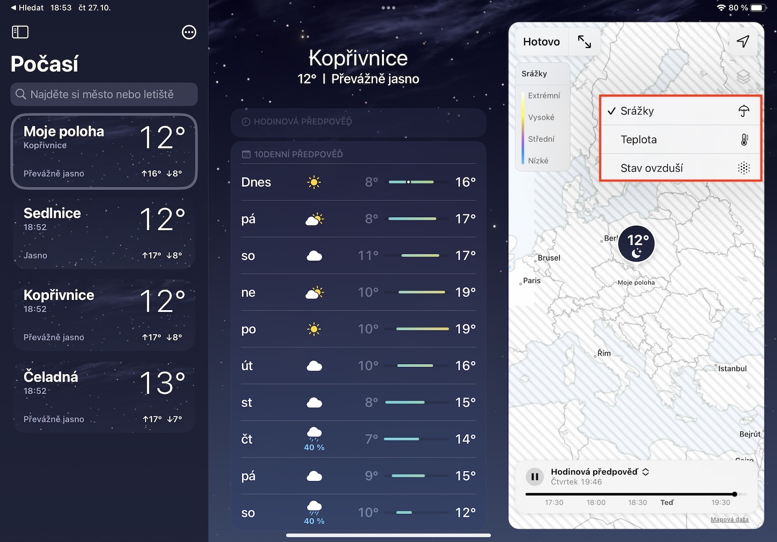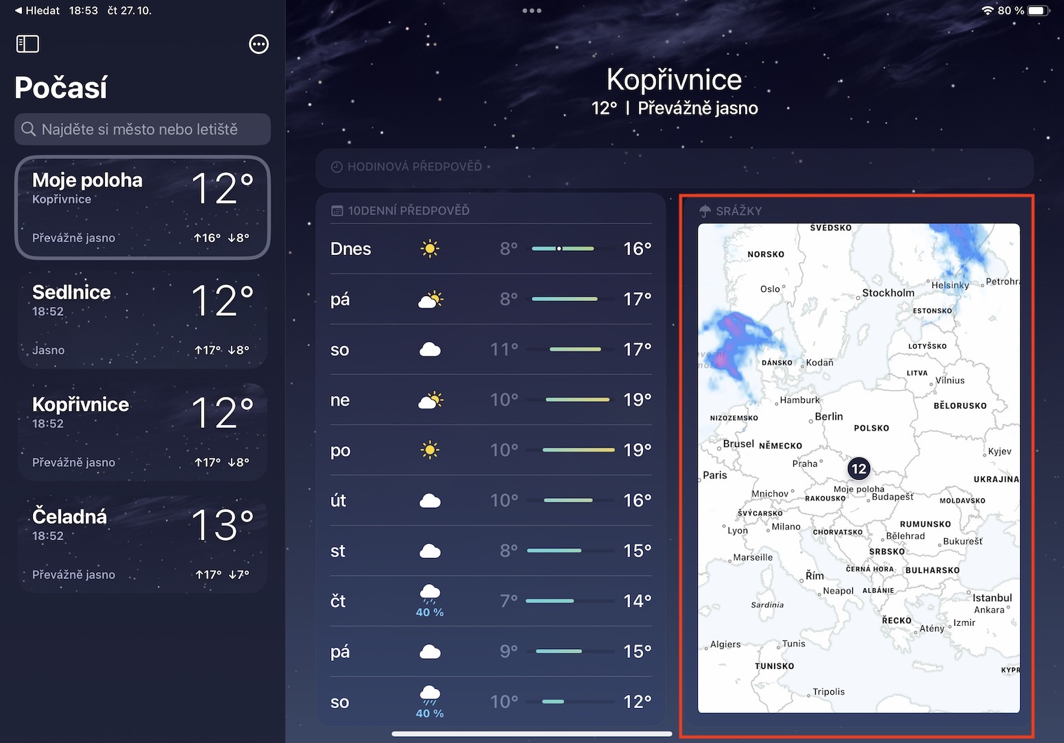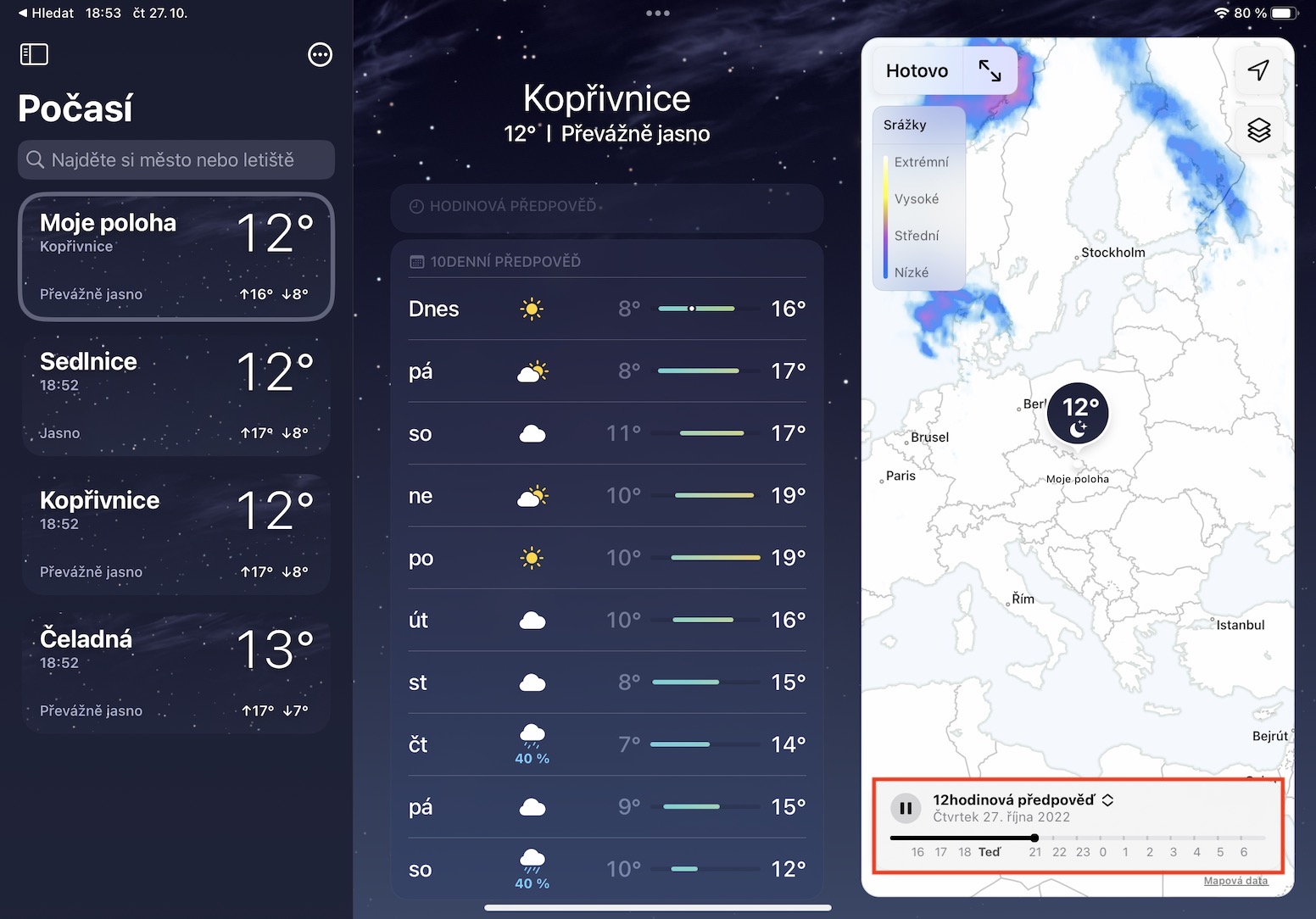Mnoho z nás sleduje pro předpověď počasí také srážkové radary, na kterých můžeme pěkně vidět, jak se srážky pohybují a kdy by se mohly dostat na naše místo. Co kdybych vám řekl, že i takový srážkový radar je v Počasí z iPadOS 16 k dispozici? Jeho zobrazení opět není složité. Stačí se v Počasí nalevo přesunout na konkrétní místo, a poté sjeďte níže, kde najdete a klepněte na dlaždici s názvem Srážky. Tímto už se srážkový radar s předpovědí na další hodinu či na 12 hodin zobrazí. Klepnutím na ikonu vrstvy vpravo nahoře můžete ještě změnit radar na Teplotu a Stav ovzduší, každopádně informace o stavu ovzduší nejsou v Česku k dispozici.