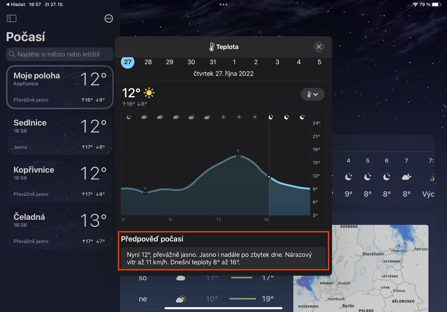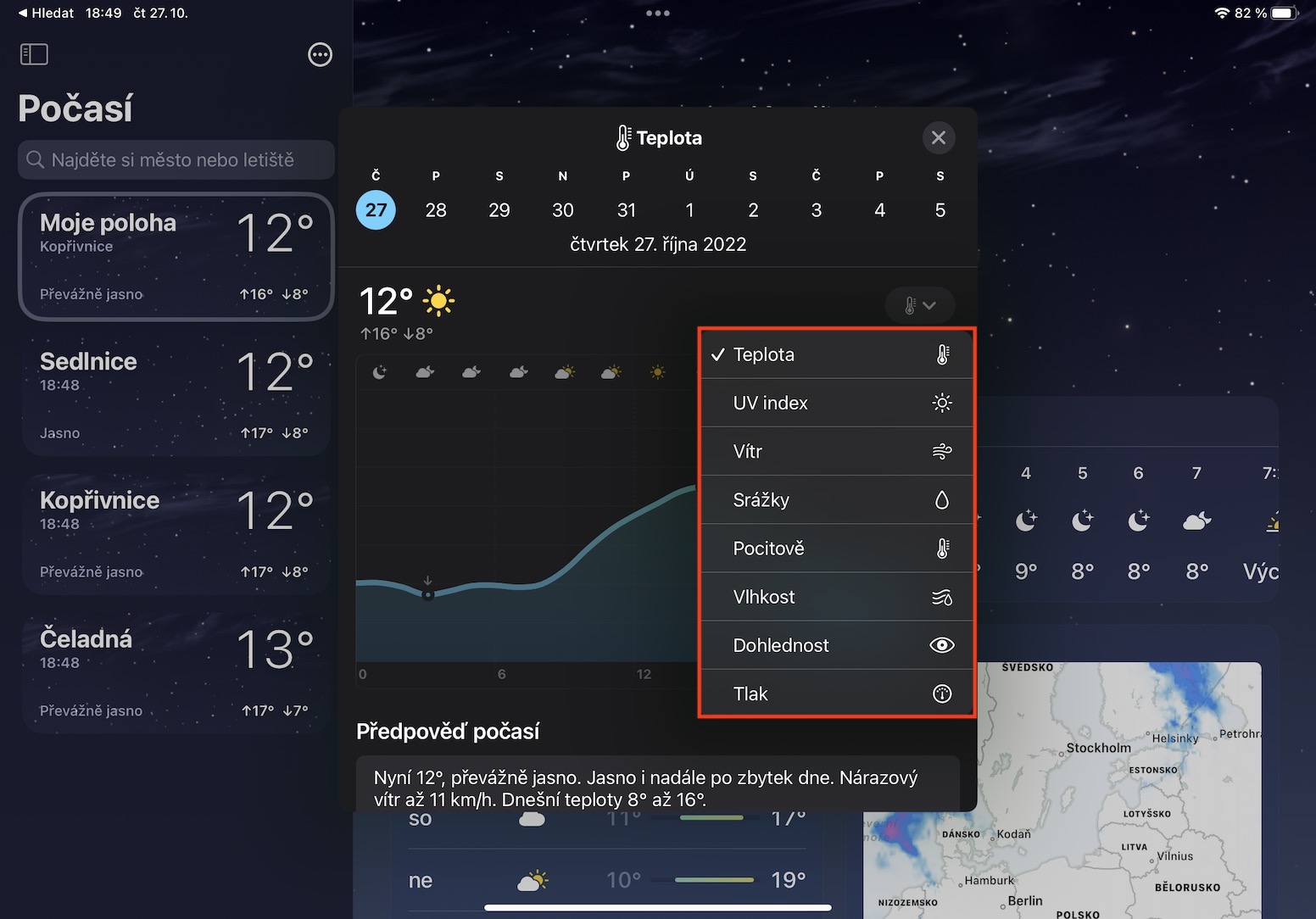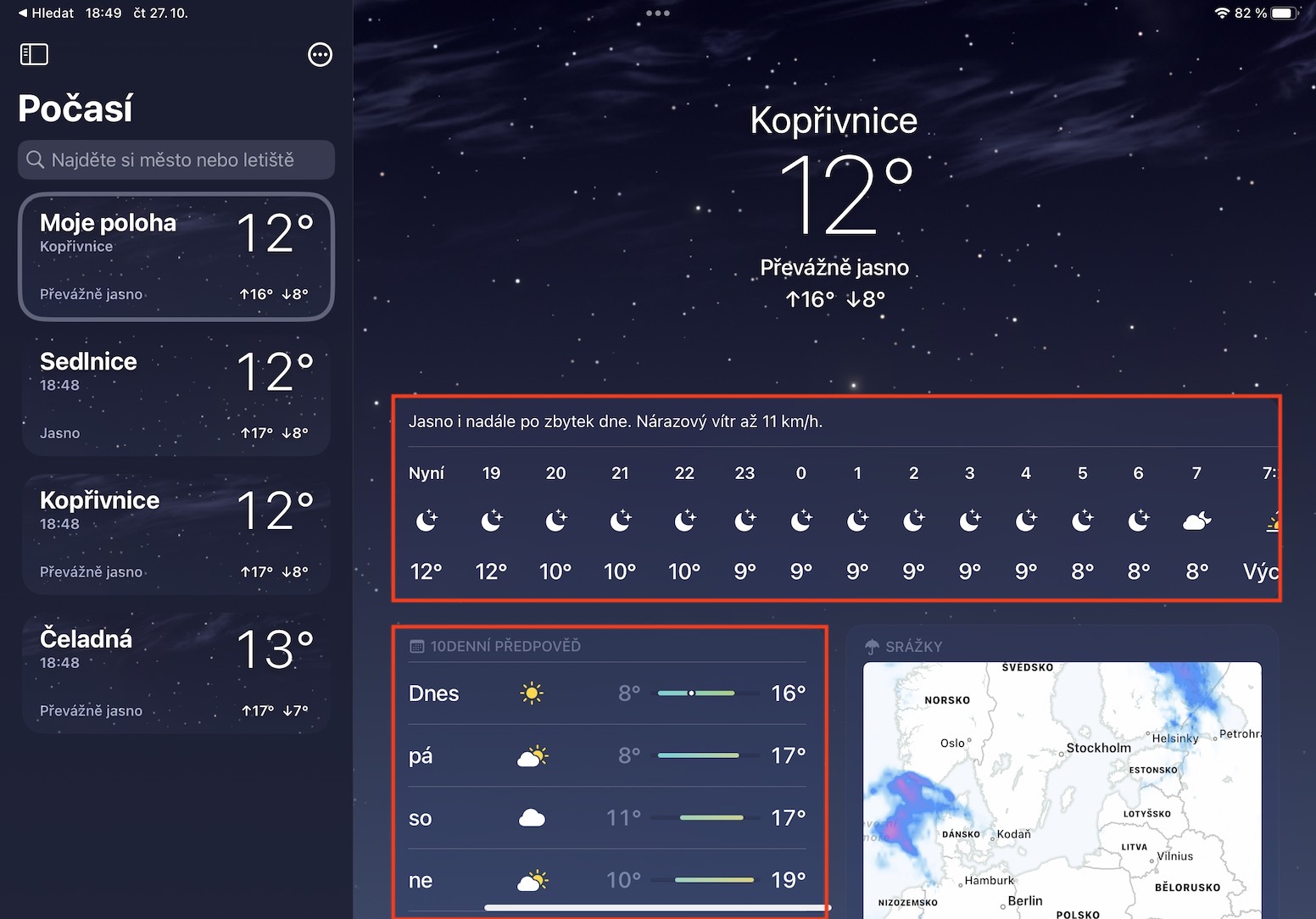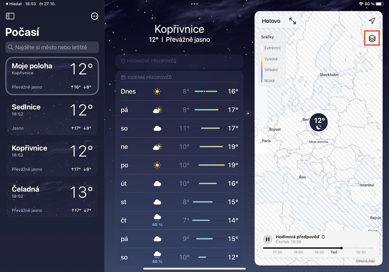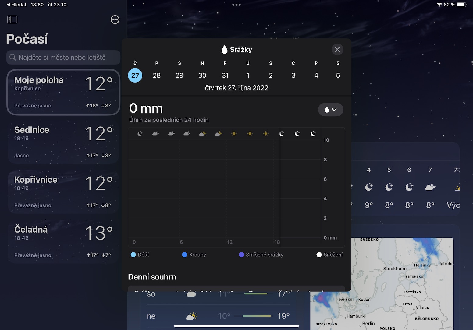 Mnoho z nás sleduje pro předpověď počasí také srážkové radary, na kterých můžeme pěkně vidět, jak se srážky pohybují a kdy by se mohly dostat na naše místo. Co kdybych vám řekl, že i takový srážkový radar je v Počasí z iPadOS 16 k dispozici? Jeho zobrazení opět není složité. Stačí se v Počasí nalevo přesunout na konkrétní místo, a poté sjeďte níže, kde najdete a klepněte na dlaždici s názvem Srážky. Tímto už se srážkový radar s předpovědí na další hodinu či na 12 hodin zobrazí. Klepnutím na ikonu vrstvy vpravo nahoře můžete ještě změnit radar na Teplotu a Stav ovzduší, každopádně informace o stavu ovzduší nejsou v Česku k dispozici.