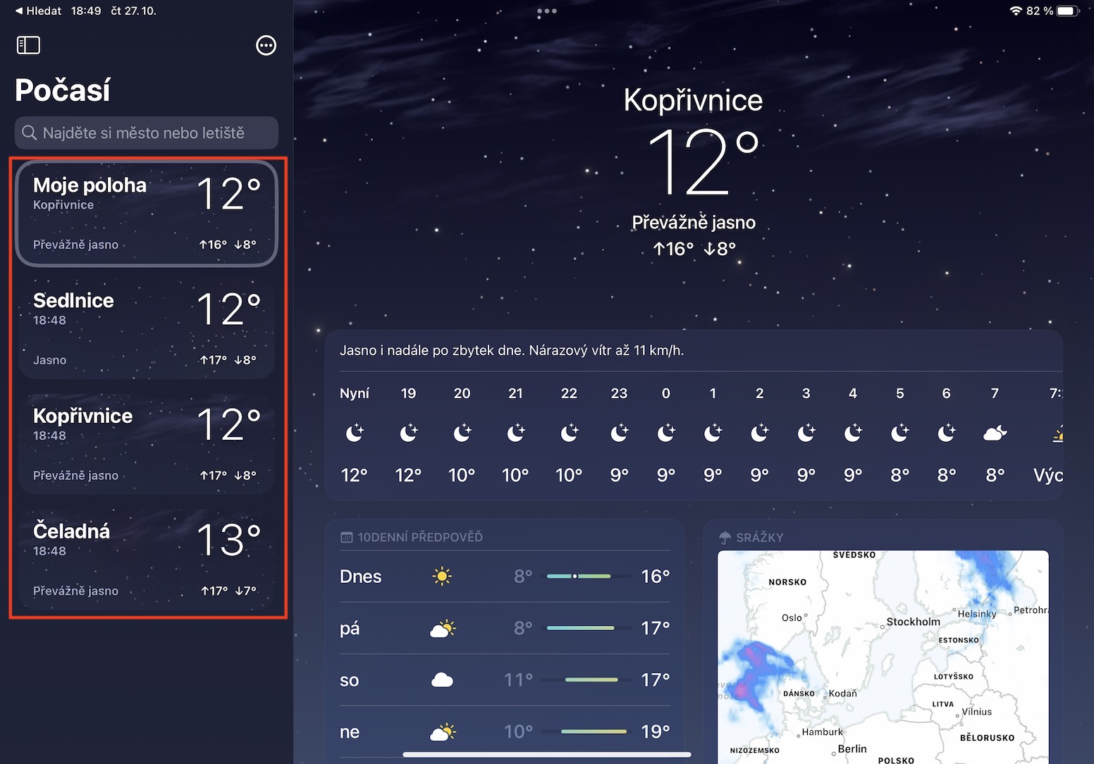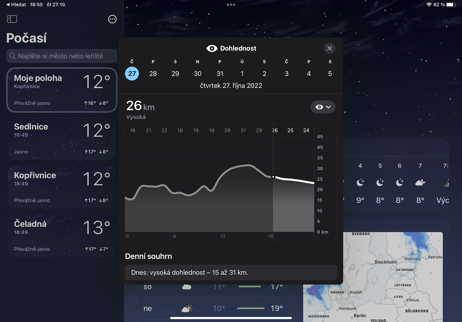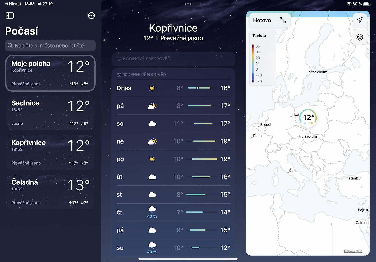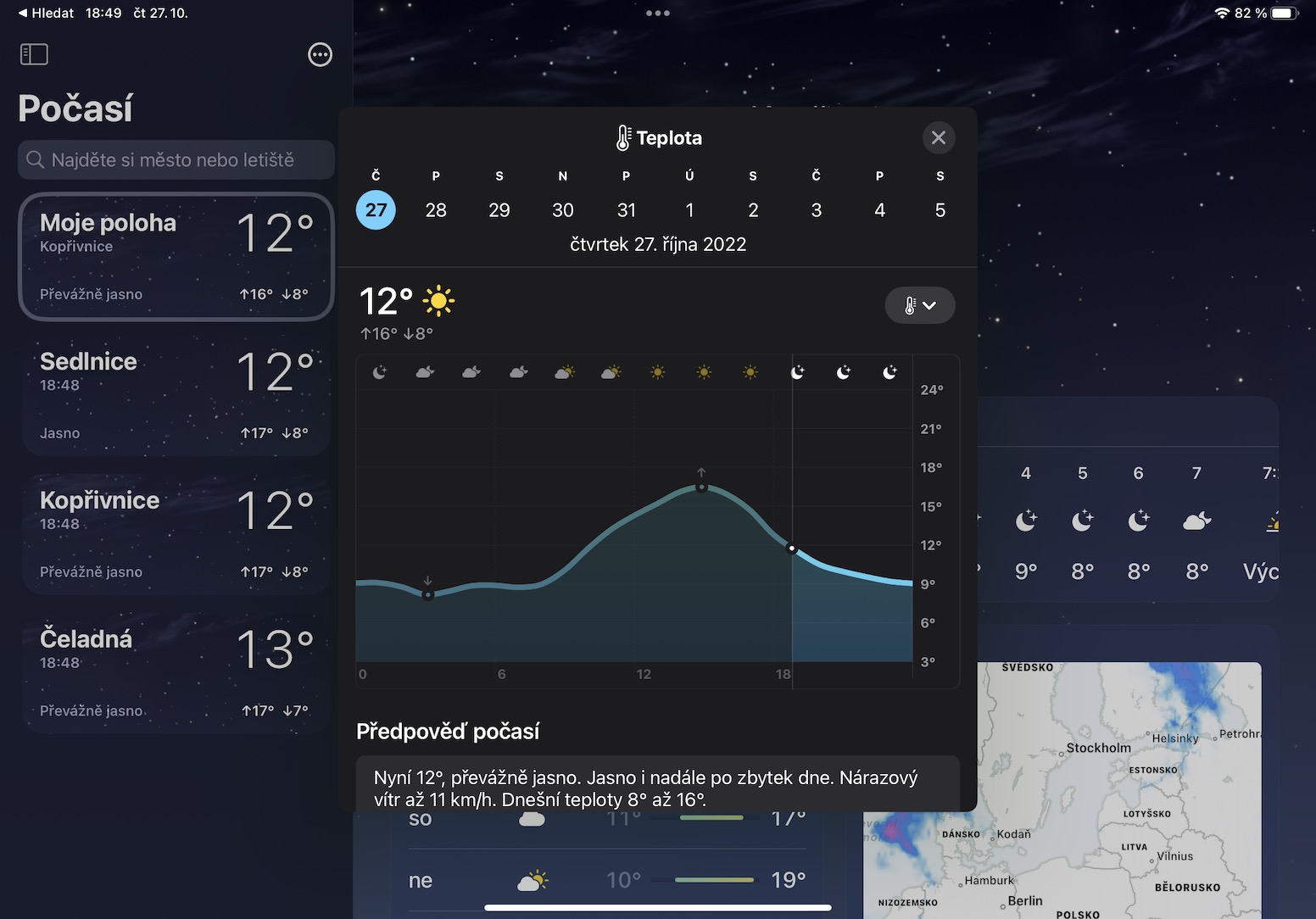 Mnoho z nás sleduje pro předpověď počasí také srážkové radary, na kterých můžeme pěkně vidět, jak se srážky pohybují a kdy by se mohly dostat na naše místo. Co kdybych vám řekl, že i takový srážkový radar je v Počasí z iPadOS 16 k dispozici? Jeho zobrazení opět není složité. Stačí se v Počasí nalevo přesunout na konkrétní místo, a poté sjeďte níže, kde najdete a klepněte na dlaždici s názvem Srážky. Tímto už se srážkový radar s předpovědí na další hodinu či na 12 hodin zobrazí. Klepnutím na ikonu vrstvy vpravo nahoře můžete ještě změnit radar na Teplotu a Stav ovzduší, každopádně informace o stavu ovzduší nejsou v Česku k dispozici.
