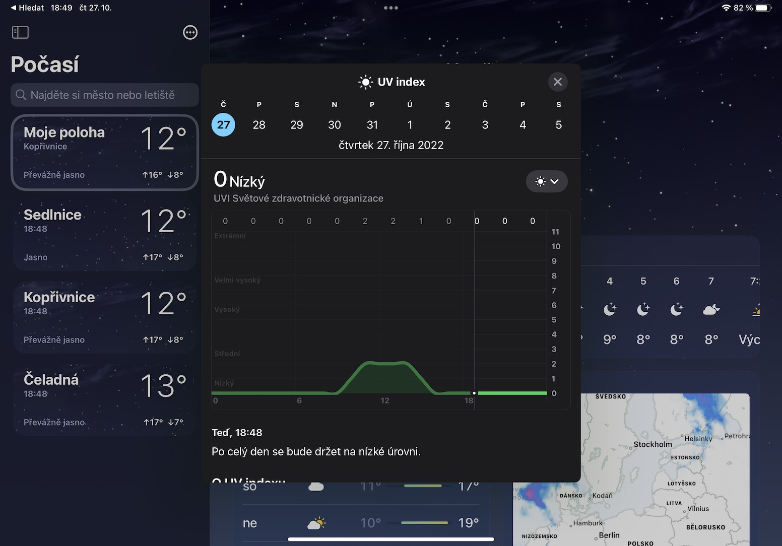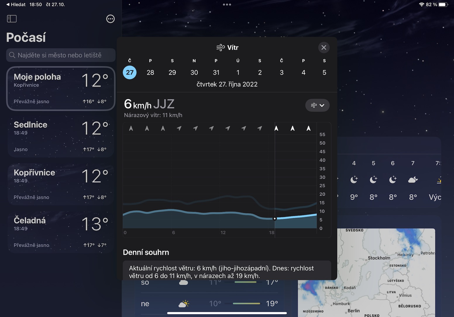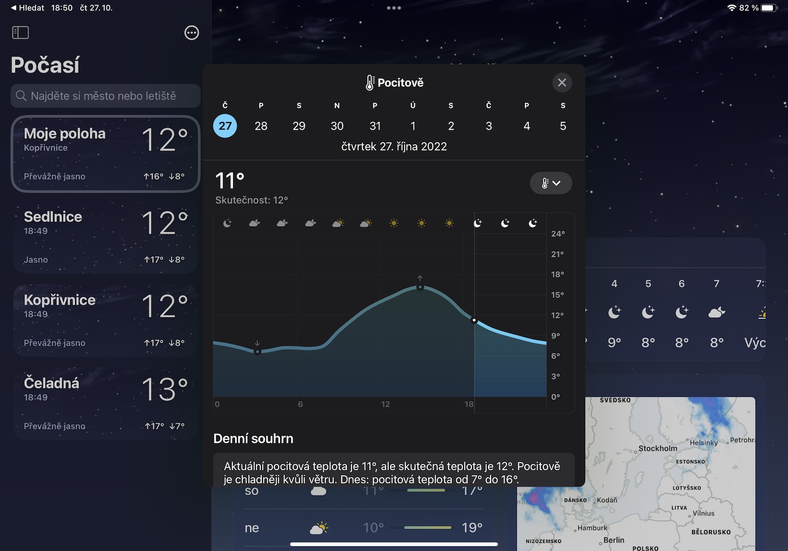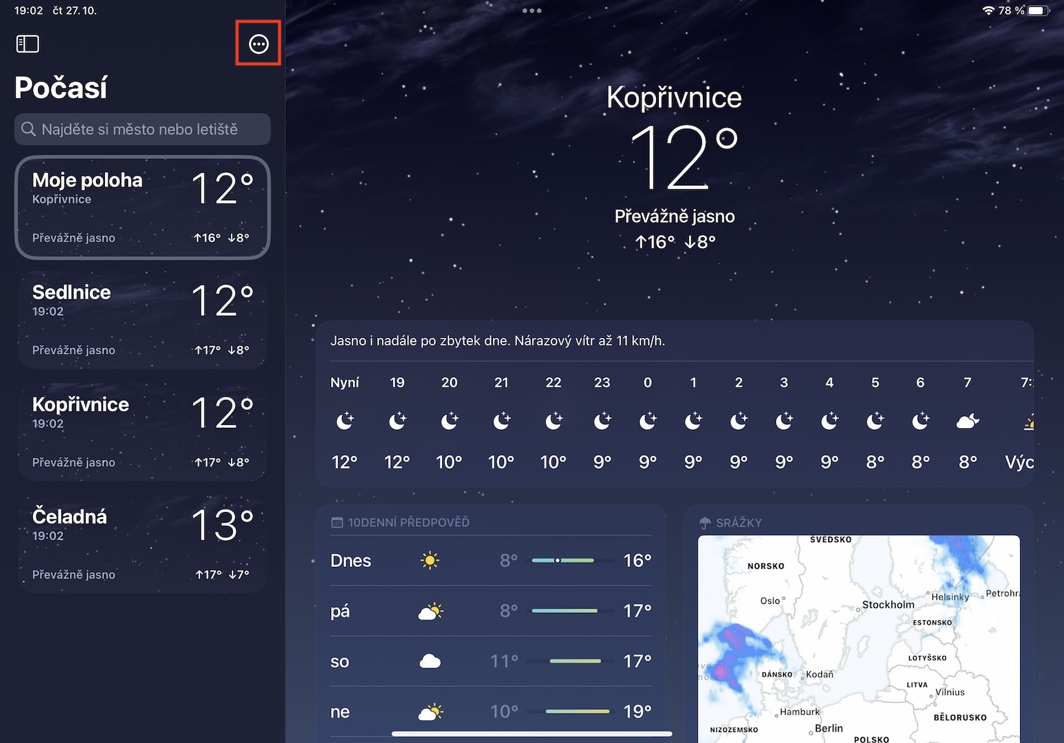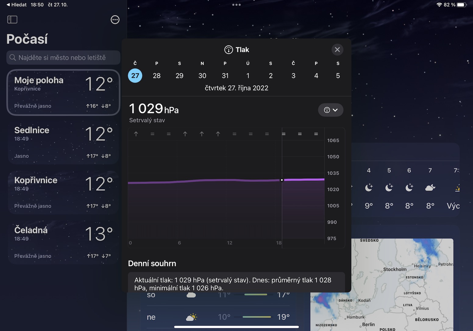 Mnoho z nás sleduje pro předpověď počasí také srážkové radary, na kterých můžeme pěkně vidět, jak se srážky pohybují a kdy by se mohly dostat na naše místo. Co kdybych vám řekl, že i takový srážkový radar je v Počasí z iPadOS 16 k dispozici? Jeho zobrazení opět není složité. Stačí se v Počasí nalevo přesunout na konkrétní místo, a poté sjeďte níže, kde najdete a klepněte na dlaždici s názvem Srážky. Tímto už se srážkový radar s předpovědí na další hodinu či na 12 hodin zobrazí. Klepnutím na ikonu vrstvy vpravo nahoře můžete ještě změnit radar na Teplotu a Stav ovzduší, každopádně informace o stavu ovzduší nejsou v Česku k dispozici.