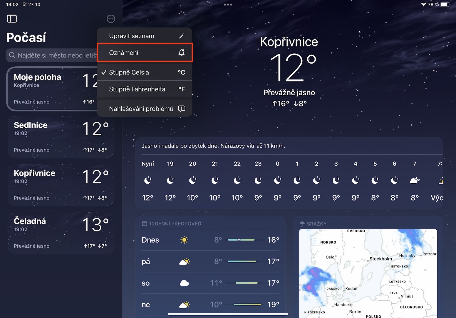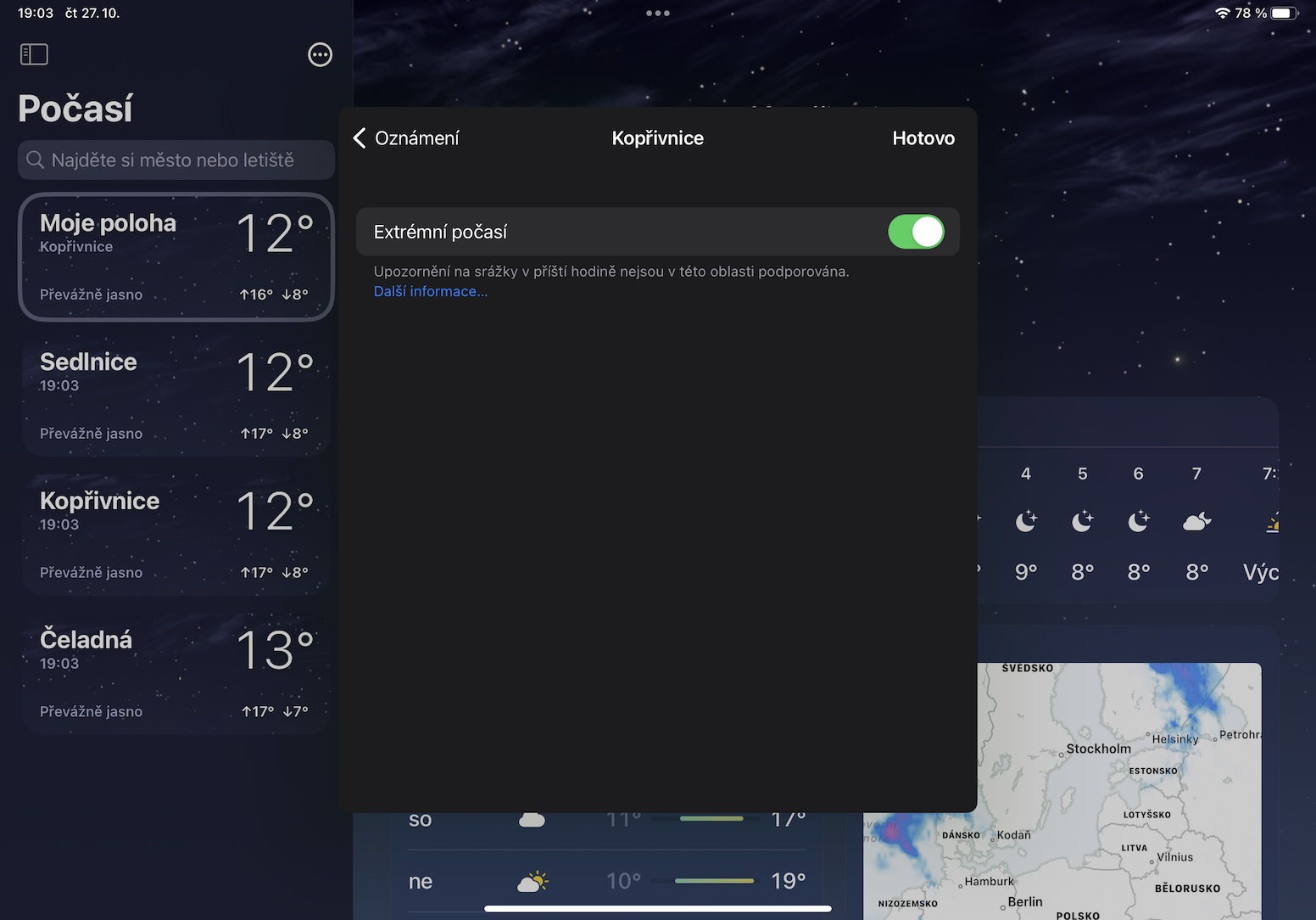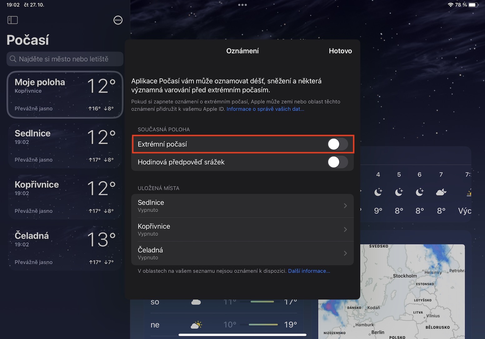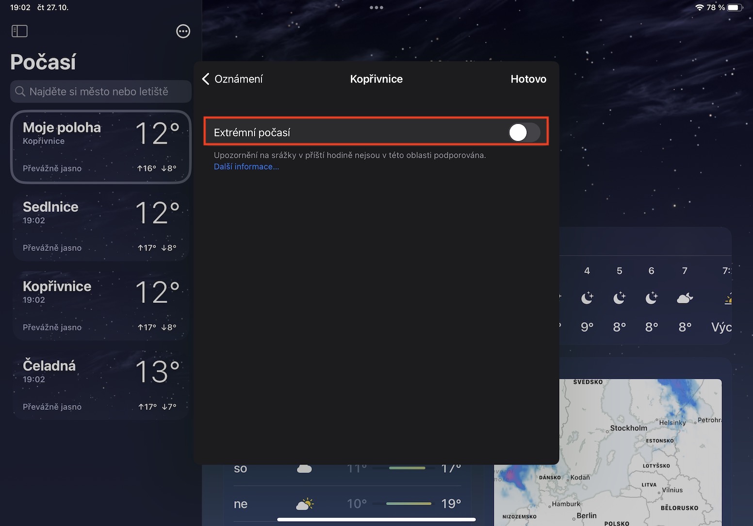 Chtěli byste být o výstrahách počasí informováni jako první, abyste se případně mohli připravit? Tak i přesně tohle je v Počasí z iPadOS 16 možné. Aktivovat si konkrétně můžete kritická oznámení s výstrahami, které vás informují i v případě, že budete mít zapnuté soustředění. Pro nastavení těchto upozornění klepněte v levé horní části Počasí na ikonu tří teček v kroužku, a poté z menu vyberte Oznámení. Zde už jen stačí aktivovat Extrémní počasí pro současnou polohu, anebo se níže přesuňte do jednoho z vašich uložených míst, kde je možné Extrémní počasí aktivovat zvlášť. Co se týče hodinové předpovědi srážek, tak ta bohužel není v Česku k dispozici.