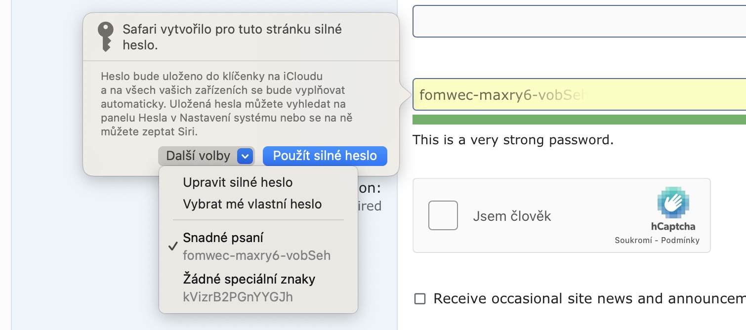 Pokaždé, když se na Macu v Safari rozhodnete pro vytvoření nového účtu, tak vám může být vygenerováno bezpečné a silné heslo, které byste měli využít. Problém byl však donedávna v tom, že jste tohle silné heslo nemohli jednoduše upravit, což způsobovalo problém na portálech s různými požadavky na heslo. Dobrou zprávou je, že v macOS Ventura už si při vytváření hesla můžete zvolit z několika možností, které dokáží heslo pozměnit. Kromě klasického silného hesla si ještě můžete vybrat heslo ve formátu snadného psaní či bez speciálních znaků, viz obrázek níže.