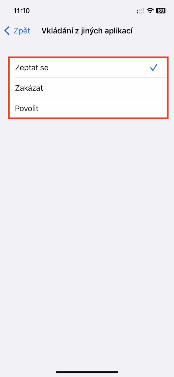 Výše uvedeným způsobem je tedy možné na iPhonu nastavit, které aplikace budou moci přistupovat ke schránce. Znovu opakuji, že je tato možnost k dispozici jen v iOS 16.1 a novějším. Zároveň je důležité zmínit, že pro zobrazení řádku Vkládání z jiných aplikací vás konkrétní aplikace musí alespoň jednou požádat o přístup ke schránce, v opačném případě se tato předvolba nezobrazí. Pokud zvolíte Zeptat se, aplikace se na přístup bude i nadále ptát, jestliže nastavíte Zakázat, tak aplikace nebude moci přistupovat ke schránce vůbec, a v případě zvolení Povolit bude aplikace schopna ke schránce přistupovat neomezeně.