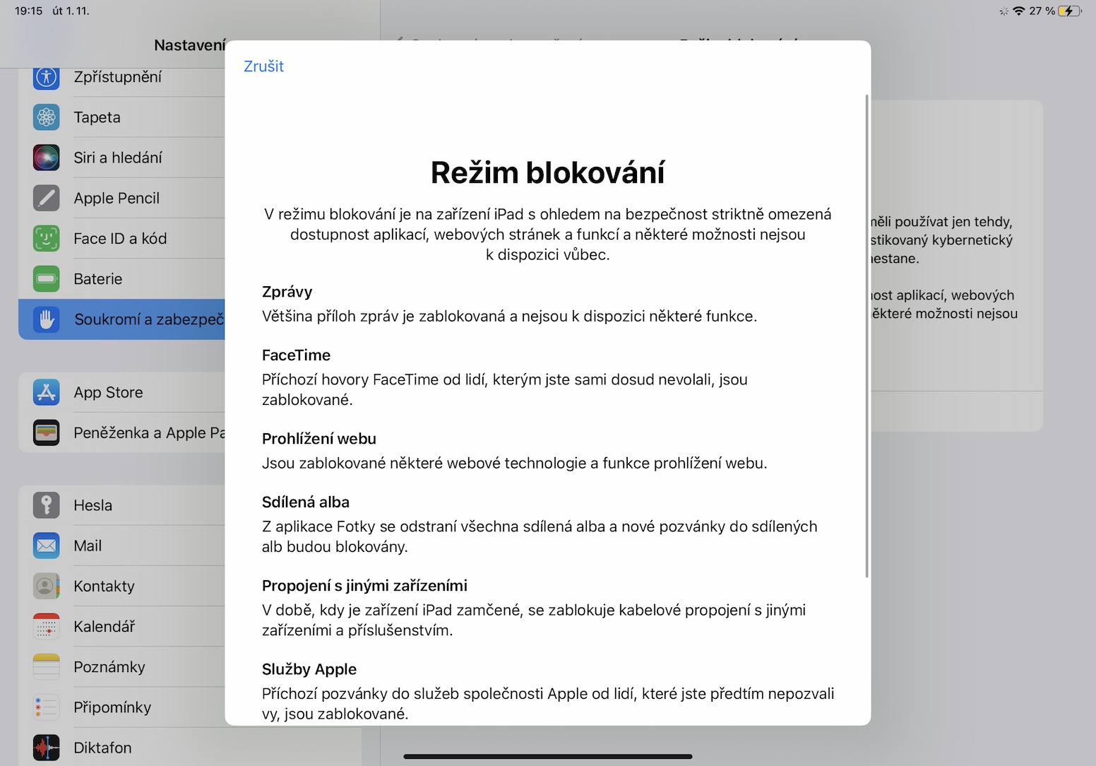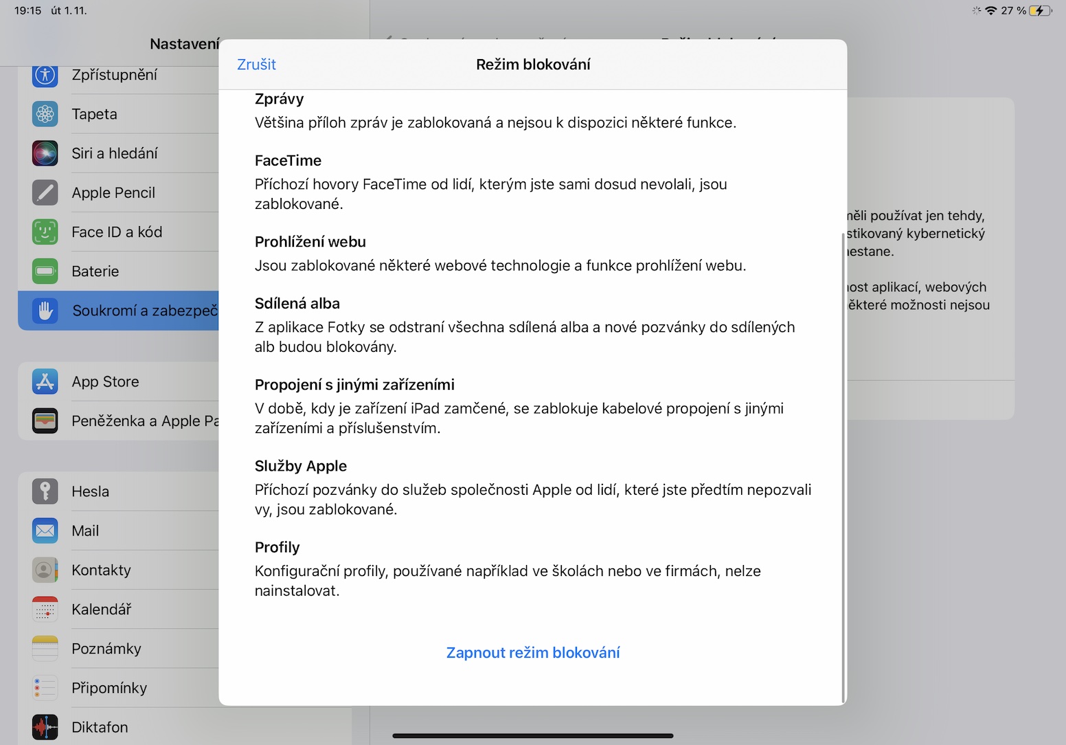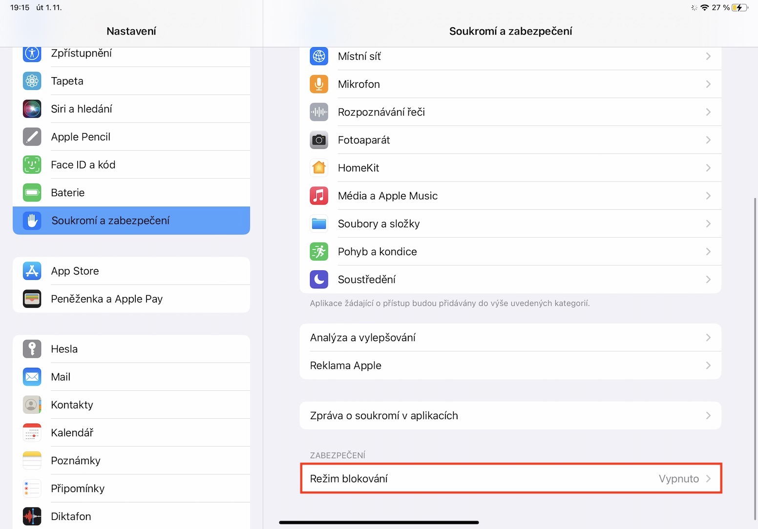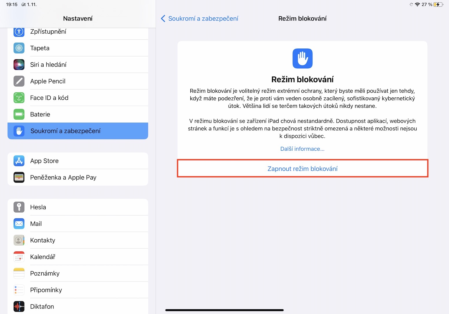 Stejně jako v iOS 16, tak i v iPadOS 16 je k dispozici zbrusu nový Režim blokování. V případě, že tento režim aktivujete, tak se z vašeho iPadu stane nedobytný hrad, který by měl být odolný proti veškerým útokům, vládnímu šmírování apod. Není to ale jen tak – přijdete o mnoho základních funkcí, které iPad nabízí. Přesně proto je Režim blokování určený především pro společensky významné uživatele v podobě politiků, celebrit, novinářů apod., nikoliv pro obyčejné uživatele. Pro zapnutí Režimu blokování stačí přejít do Nastavení → Soukromí a zabezpečení → Režim blokování.