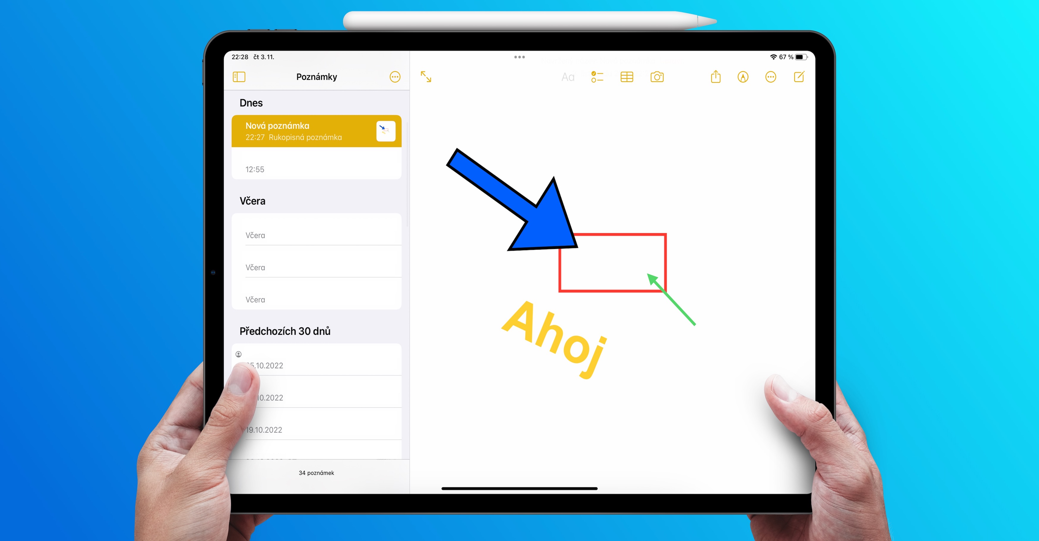 Do jednotlivých poznámek můžete na iPadu také všemožně kreslit, což může přijít vhod, pokud si například chcete udělat nějaký náčrtek či cokoliv jiného. I v této oblasti však došlo v rámci iPadOS 16 k vylepšení. Nově si totiž můžete do poznámek vkládat také tvary a šipky. Stačí, abyste vpravo nahoře klepnuli na ikonu anotací, čímž se dole otevře panel nástrojů. V jeho pravé části pak klepněte na ikonu tvarůvyberte si, které chcete vložit. Následně můžete měnit jeho barvu, šířku okrajů, velikost a další.