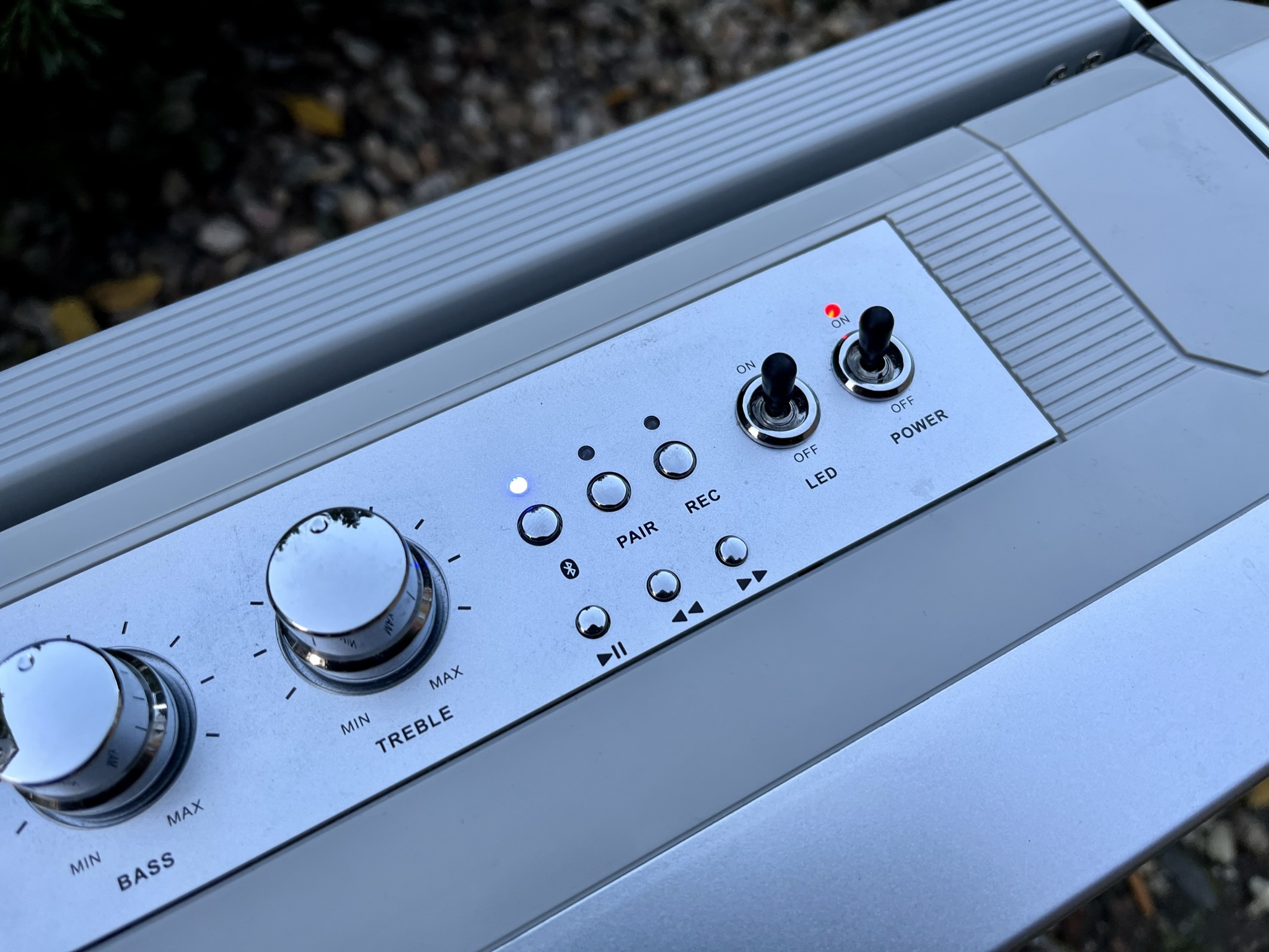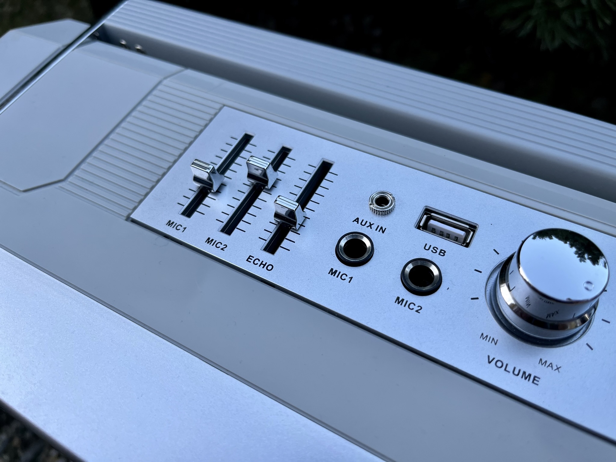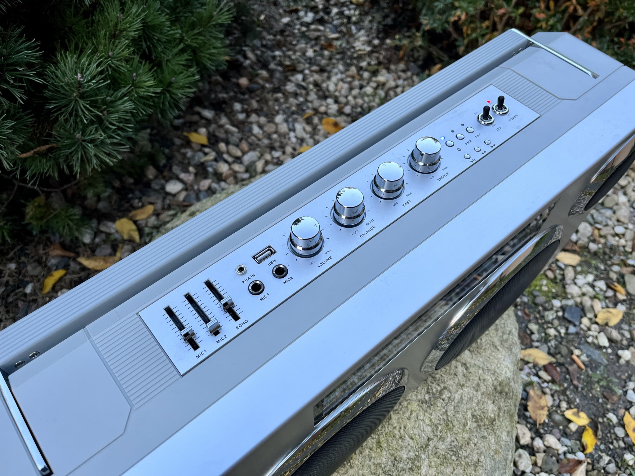 Jak již padlo výše, veškeré ovládací prvky najdeme na horní straně boomboxu. Zleva doprava se zde nachází trojice posuvných jezdců pro ovládání připojených mikrofonů (gain 1, gain 2 a echo), vedle najdeme čtveřici konektorů (USB, 3,5mm jack a 2x 6,3 mm jack), následují čtyři potenciometry, jejichž prostřednictvím se ovládá charakter zvuku (volume, balance, bass a treble), vedle nich je šestice klasických tlačítek pro párování, nahrávání a ovládání přehrávané hudby (play, pause, skip) no a na úplném konci ovládacího panelu najdeme dva dvoupolohové přepínače pro vypnutí/zapnutí boomboxu a vypnutí/zapnutí displeje (v obou případech se stavovými diodami nad nimi). Z hlediska ovládání není moc co dodat a manipulace s boomboxem je velmi snadná. Při procesu párování reproduktor komunikuje dámským hlasem s asijskou angličtinou, ovšem s párováním jako takovým nebyl během testování žádný problém.