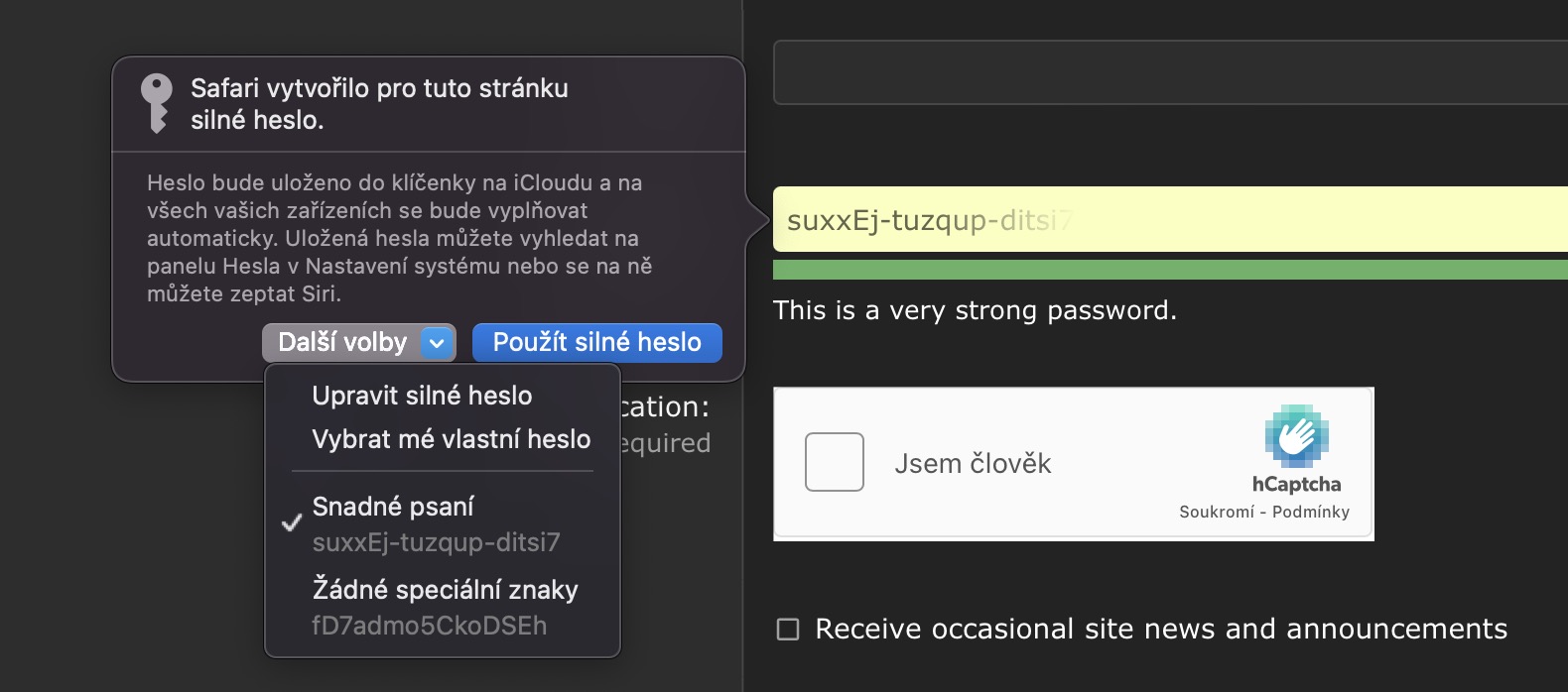 Pokaždé, když v Safari vytváříte nějaký nový uživatelský účet, tak dojde k automatickému vyplnění bezpečného hesla. Následně se tohle heslo samozřejmě uloží do klíčenky, kde k němu máte přístup ze všech zařízení. Ve starších verzích macOS jste navržené heslo mohli pouze potvrdit či upravit, v novém macOS Ventura však došlo k vylepšení, kdy si lze vybrat z několika navržených hesel různého typu. Konkrétně si můžete nastavit heslo pro snadné psaní (jen malá písmena a číslice) či bez speciálních znaků, což se může hodit na některých stránkách, které je nepodporují. V dialogovém okně s vyplněným heslem stačí klepnout na Další volby a vybrat si.