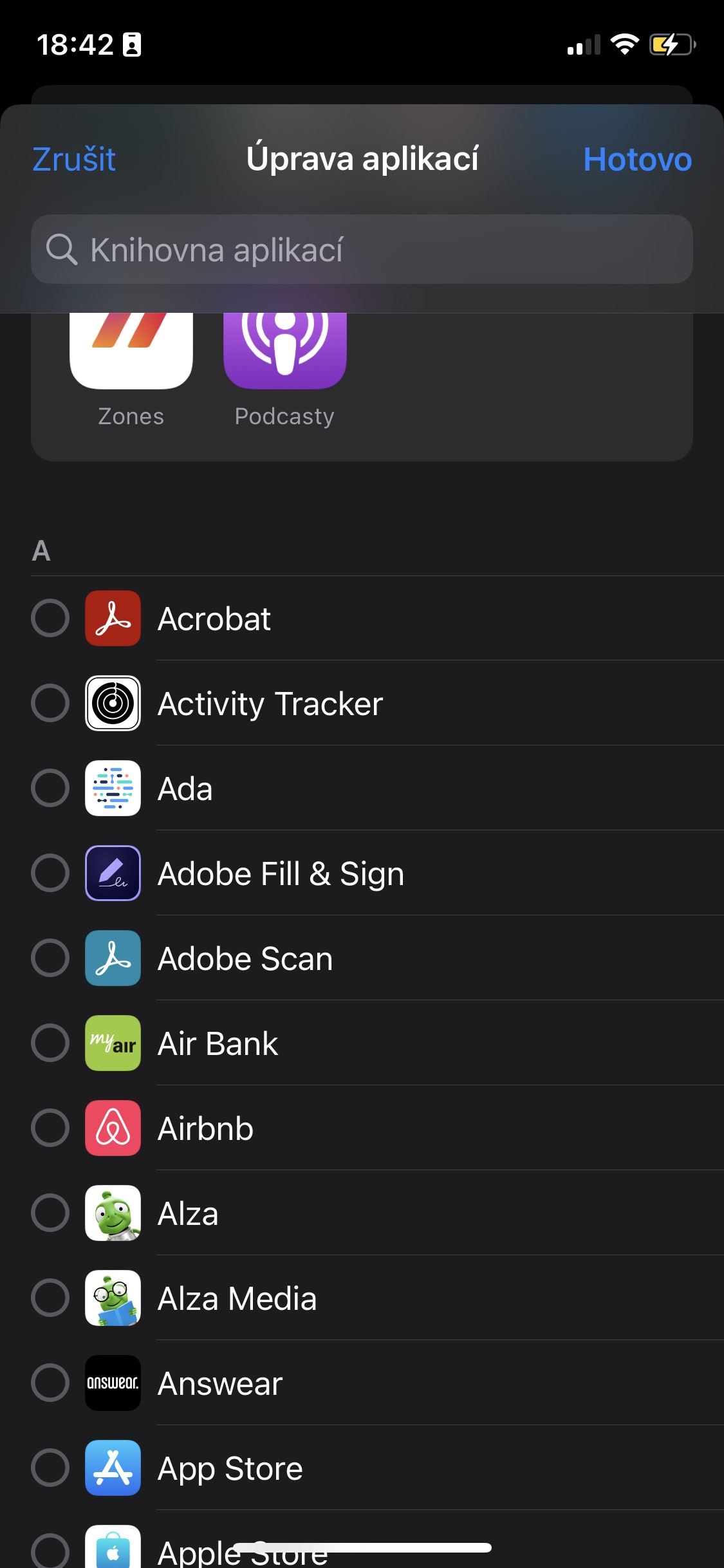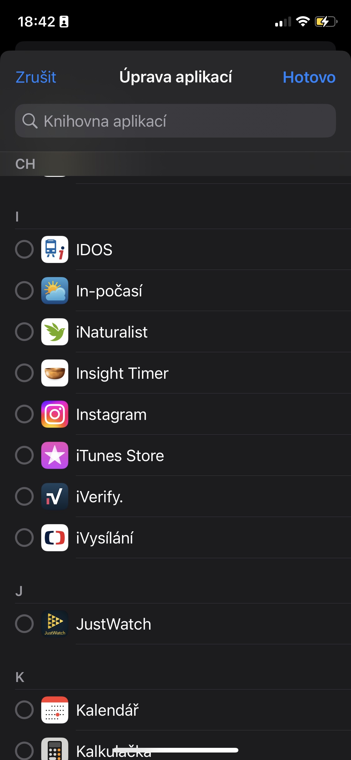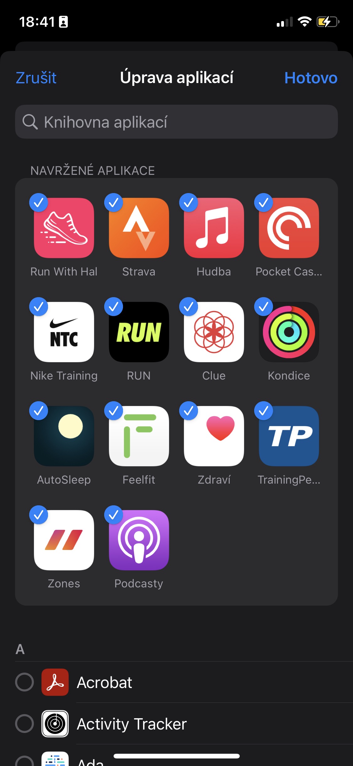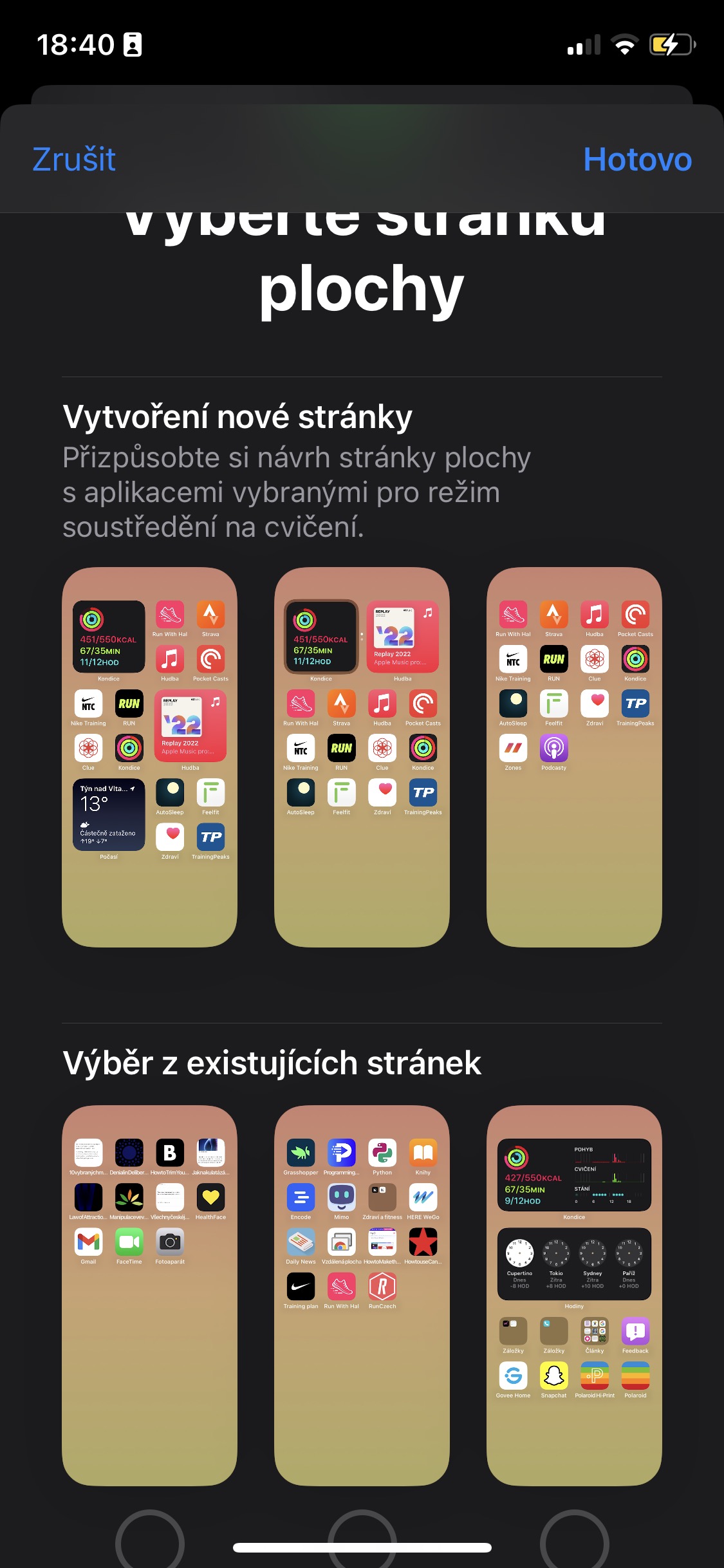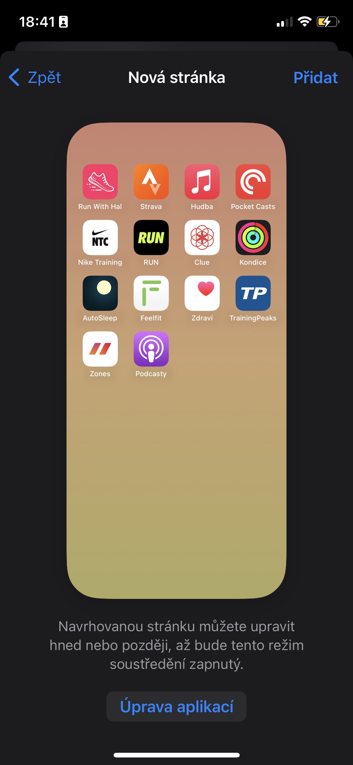 Pokud si chcete nastavit zcela novou skupinu aplikací, které se mají po dobu vybraného režimu Soustředění nacházet na ploše, klepněte na některý z náhledů v sekci Vytvoření nové stránky. Nyní ve spodní části displeje klepněte na Úprava aplikací. Následně můžete zrušit zaškrtnutí u navržených aplikací, nebo případně vybrat novou aplikaci pro vybraný režim Soustředění ze seznamu ve spodní části obrazovky. Pro dokončení klepněte na Hotovo v pravém horním rohu displeje.