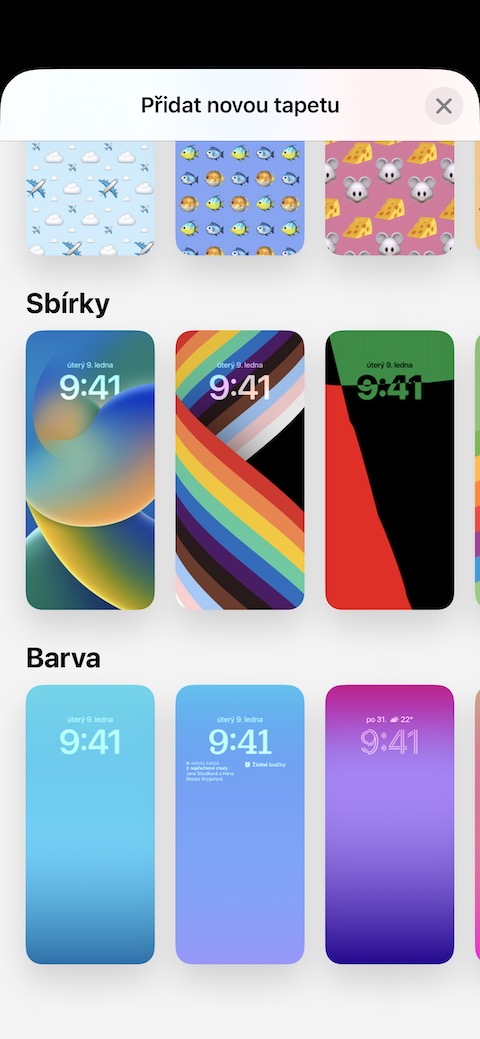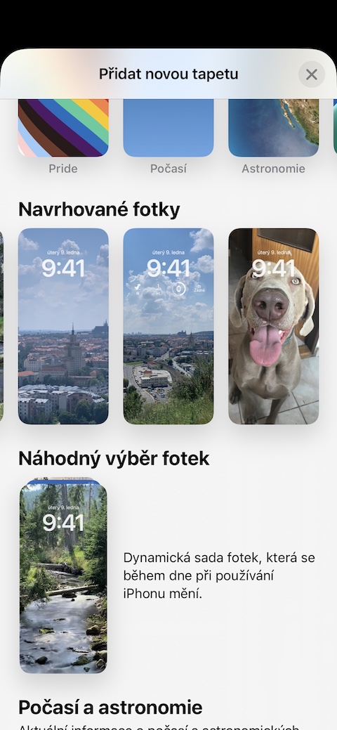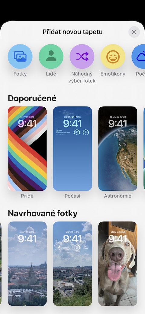 Přizpůsobení zamknuté obrazovky se smyslu nastavení widgetů jsme se věnovali hned v několika starších článcích. Tentokrát se zaměříme na výběr a přizpůsobení tapety a další náležitosti. Vytvoření zamčené obrazovky můžete zahájít tak, že při odemčeném iPhonu potáhnete prstem směrem dolů a poté dlouze stisknete náhled zamčené obrazovky. Nakonec klepněte na + v modrém kroužku vpravo dole. Na výběr máte z několika různých kategorií: Doporučené, navrhované fotky z vaší fotogalerie, náhodný výběr fotek, a přednastavené tapety z následujících kategorií: Počasí a astronomie, Emotikony, Sbírky a Barva.