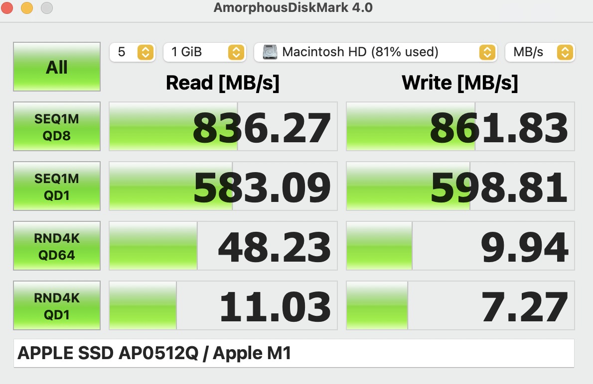 Výsledky, které jsem naměřil, sice nebyly vyloženě takové, jaké uvádí výrobce jako maximální v technických specifikacích produktů, je nicméně třeba jedním dechem dodat, že tato měření probíhají v ideálních (de facto laboratorních) podmínkách a za cíl mají logicky vymáčknout z disku naprosté maximum bez ohledu na to, že realita bude trochu jiná. A jaké jsou tedy výsledky? Když jsem ASOME SuperSpeed prohnal přes nástroj BlackMagicDesign pro měření rychlosti disků, naměřil jsem zhruba 525 MB/s při zápisu a 592 MB/s při čtení. (Jen pro zajímavost, interní disk v Macu měl rychlost zápisu 3,2x vyšší, rychlost čtení pak 4,5x vyšší.) Když jsem však pak začal přetahovat soubory z Macu na disk a naopak, dostal jsem se až na čtení 939 MB/s a zápis 891 MB/s, tedy alespoň podle nativní utility Monitor aktivity v macOS. Velmi ale samozřejmě závisí na tom, jaké soubory přetahujete, kolik jich je a tak podobně. Pokud jsou to „drobky“, rychlost byla trochu nižší než v případě, když člověk přetahoval například velké ZIPy a tak podobně. Obecně ale platí, že pod výsledky naměřené v BlackMagic se disk rychlostně při žádném z mých měření nedostal a to jsem přetahoval snad vše, co je běžné. Kromě fotek, videí a filmů to byly právě ZIPy, RARy, textové soubory a tak podobně. Pokud vás pak zajímá, jak si vedl SSD disk v propojení s Windows, tam jsem se dostal na 1024 MB/s při zápisu a 958 MB/s při čtení.