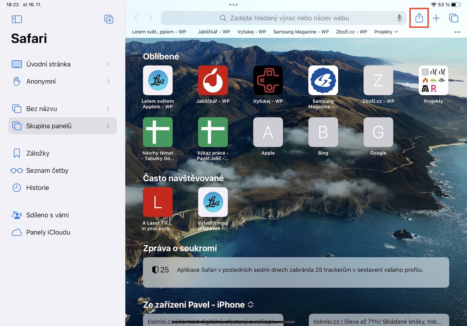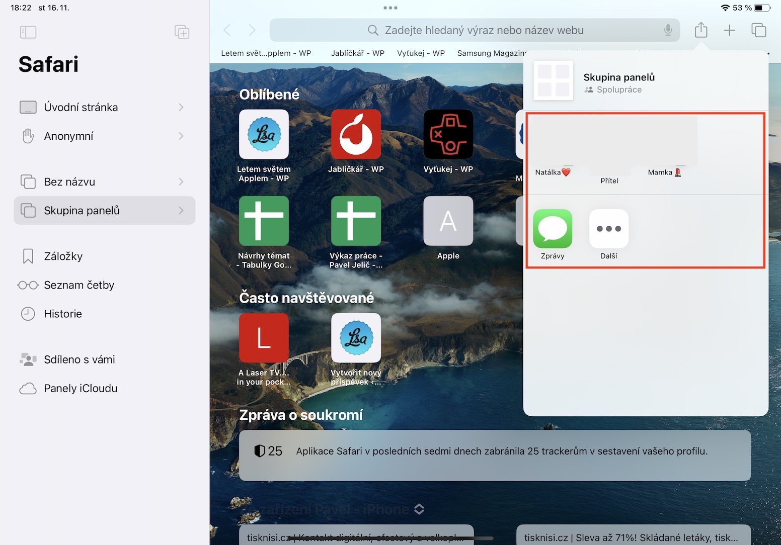 Před nedávnem přidal Apple do Safari tzv. skupiny panelů, díky kterým můžete jednoduše rozdělit například domácí a pracovní panely, popřípadě panely nějakého projektu, a jednoduše se mezi nimi přepínat. V novém iPadOS 16 jsme se každopádně dočkali možnosti sdílení skupin panelů, takže v praxi díky tomu může v Safari najednou pracovat více uživatelů najednou. Pro zahájení sdílení stačí klepnout na ikonu bočního panelu a do skupiny panelů přejít, anebo vytvořit novou. Pak už jen vpravo nahoře stiskněte ikonu sdílenívyberte uživatele.