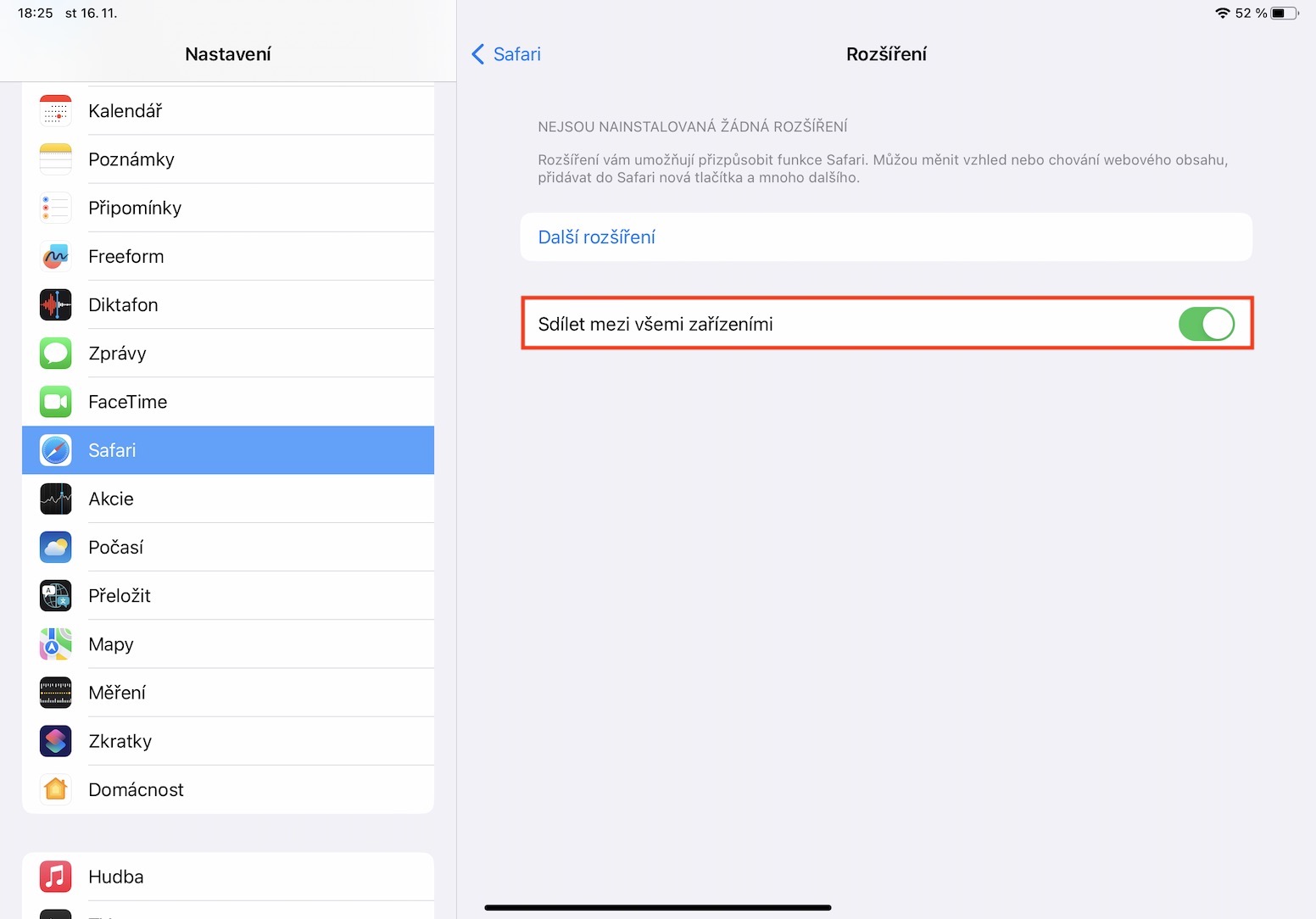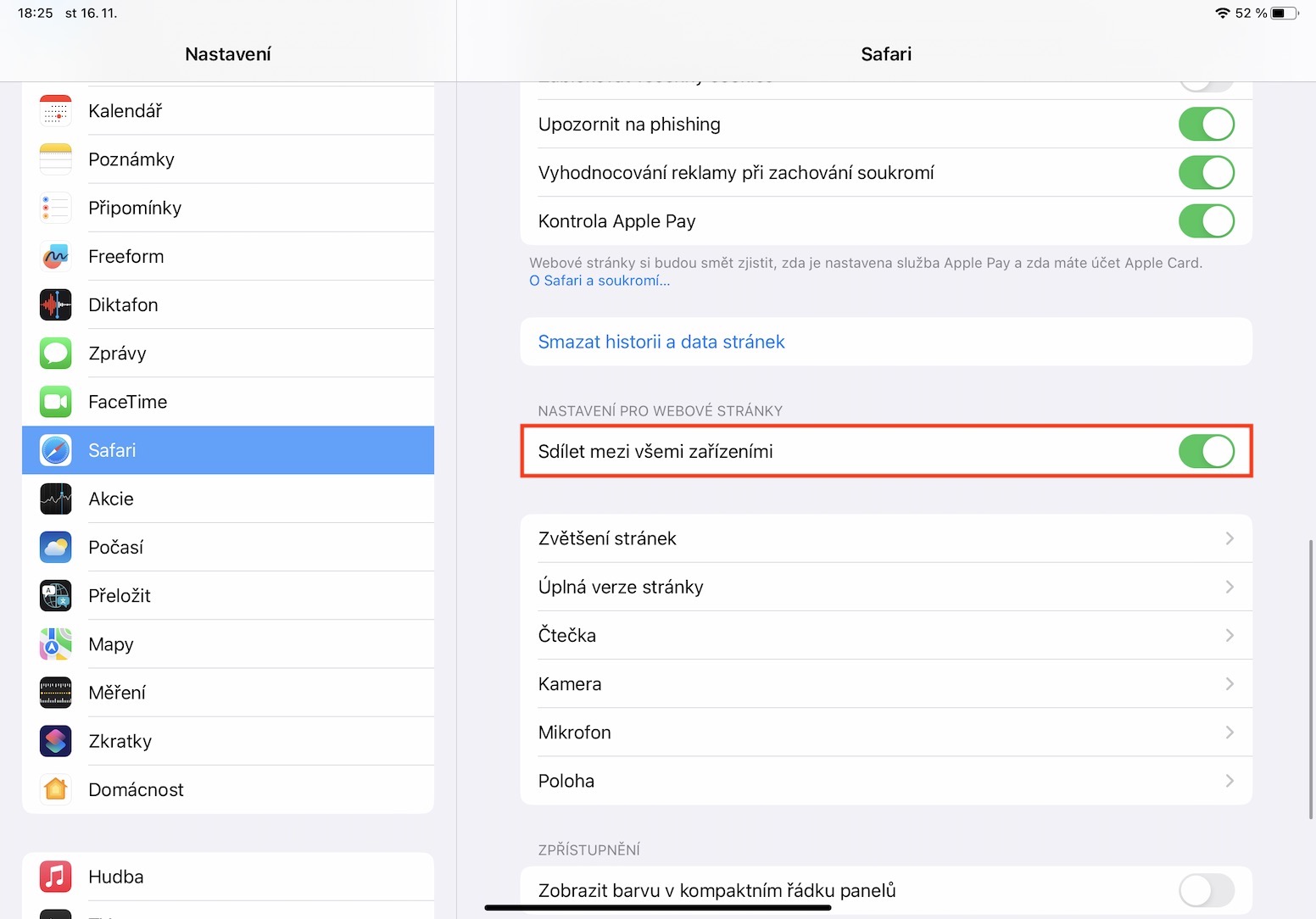 U jednotlivých webů, které procházíte, si můžete nastavit různé předvolby – jedná se například o zobrazení desktopové/mobilní verze stránky, automatické spuštění čtečky či přístup ke kameře, mikrofonu a poloze. Zatímco donedávna jsme všechny tyto předvolby museli na našich zařízeních aplikovat zvlášť, tak v iPadOS 16 a dalších nových systémech už jsou synchronizovaná. Naprosto stejně jsou synchronizovaná i rozšíření, takže je nemusíte stahovat vždy na každé Apple zařízení zvlášť. Funkce jsou ve výchozím nastavení aktivní, případně je však můžete vypnout nebo zapnout v Nastavení → Safari v kategorii Nastavení pro webové stránky, respektive v sekci Rozšíření.