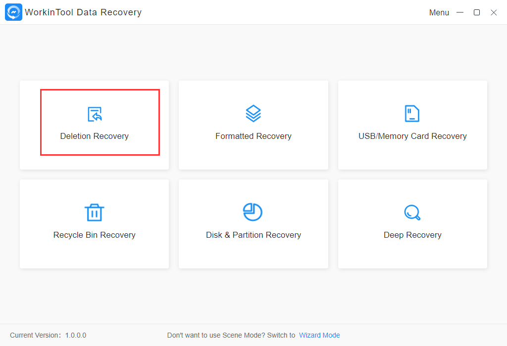Stačí jej zdarma stáhnout a pustit. Poté klepněte na možnost Deletion Recovery scénu. (Můžete také vybrat možnost scény Format Recovery, Disk Paritition Recovery a Deep Recovery).