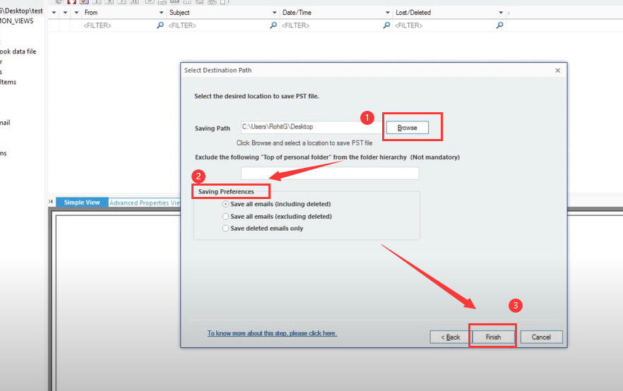 Jakmile vyberete lokaci pro uložení klepnutím na ikonku Browse a vyberete Saving Preferences > Save all emails (including deleted). Závěrem stačí potvrdit tlačítkem Finish pro obnovu dat.
