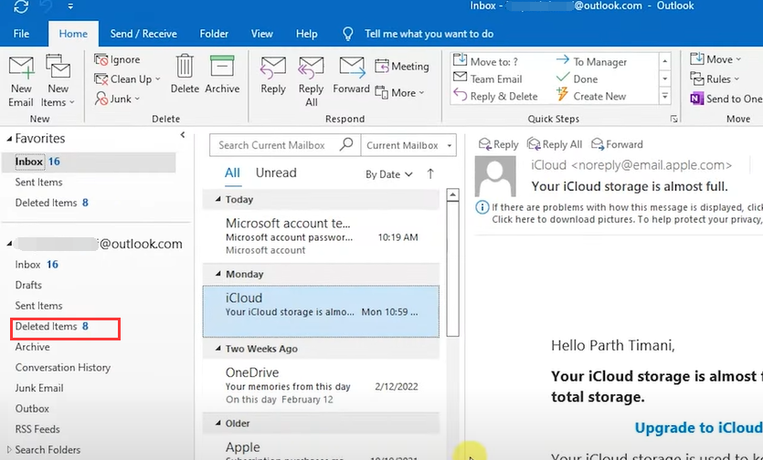 Přihlaste se do svého Outlook účtu a najděte list složek na levé straně. Následně klepněte na Deleted Items.