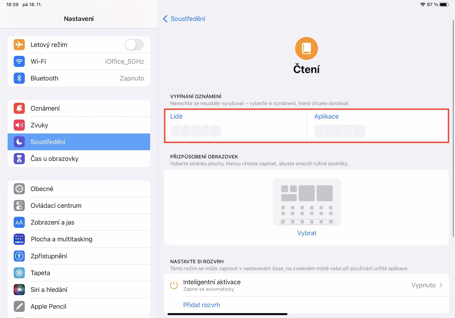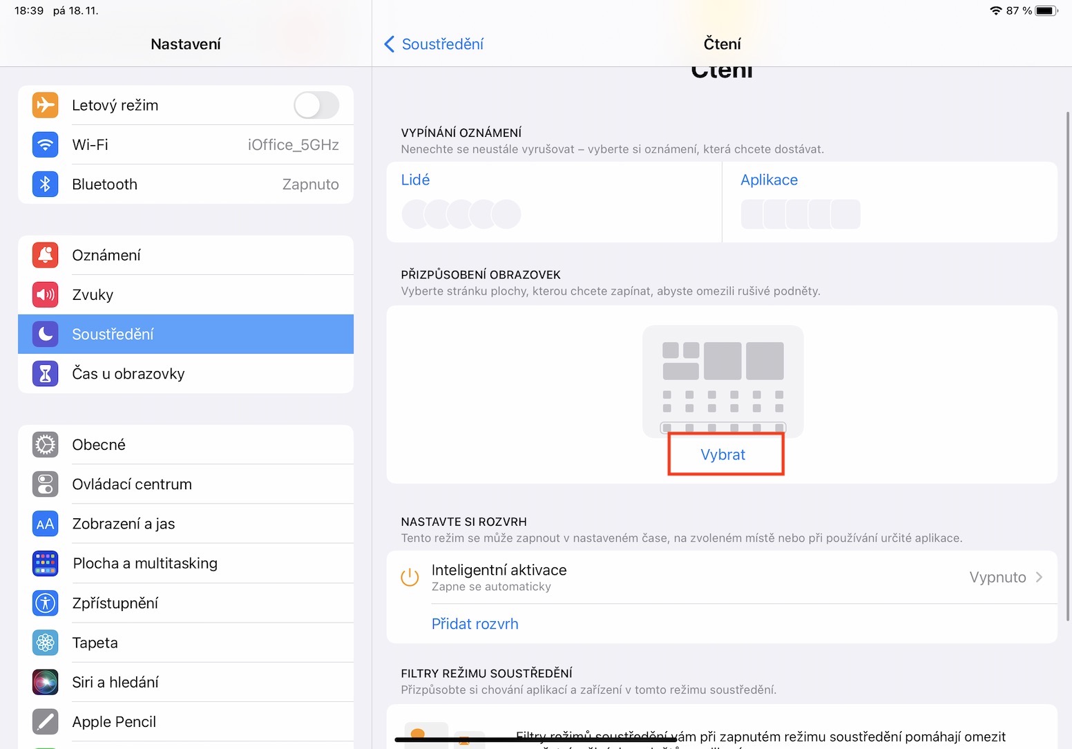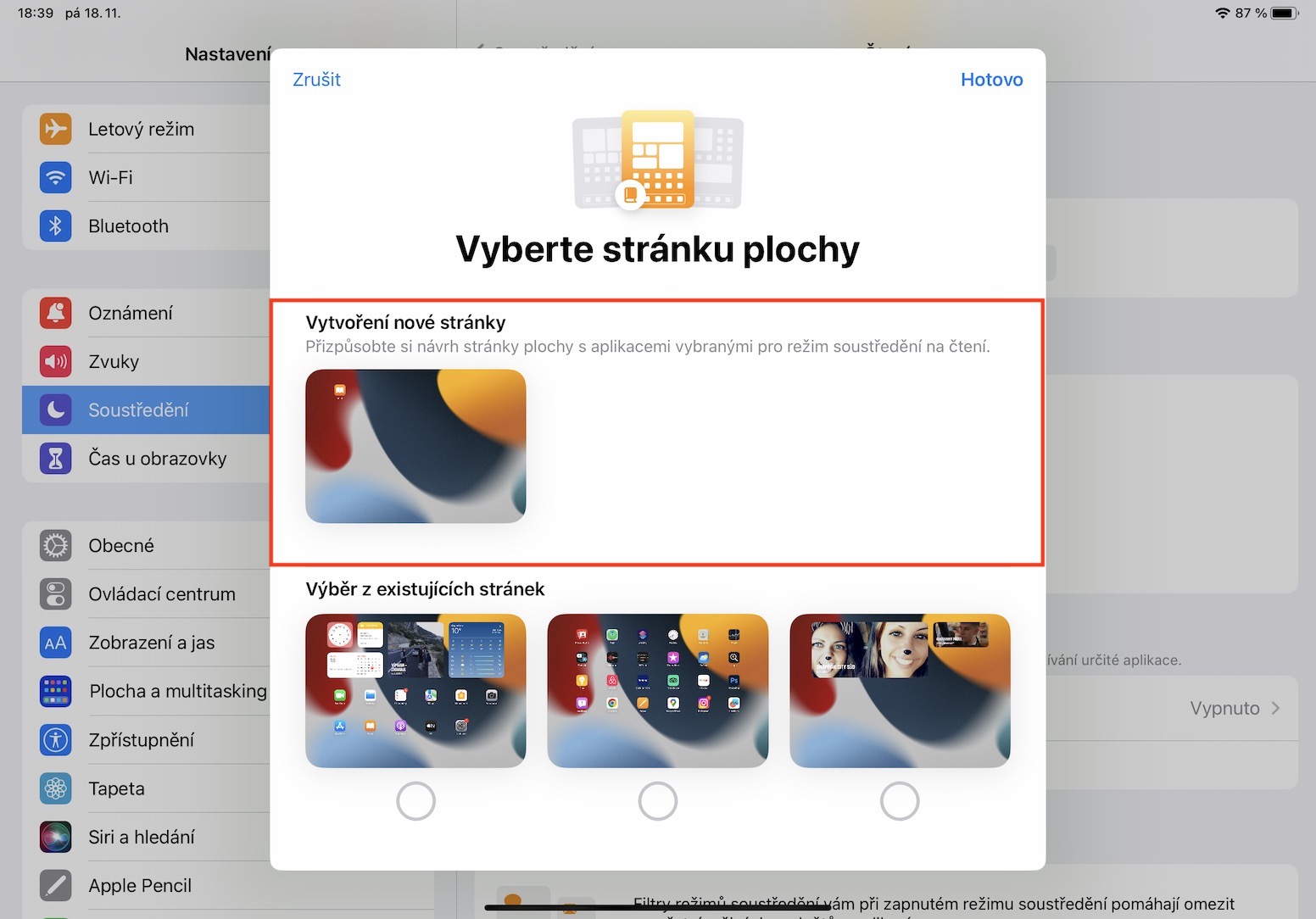 Ke každému režimu soustředění si můžete vybrat stránky plochy, které se po jeho aktivaci budou zobrazovat. V novém iPadOS 16 však přibyla funkce, která vám dokáže rovnou navrhnout plochy, které se hodí ke konkrétnímu režimu soustředění. To znamená, že pro režim čtení vám bude navrhnuto zobrazení pouze plochy se čtecími aplikacemi, u soustředění na hraní zase jen plocha s hrami apod. Pro výběr plochy stačí přejít do Nastavení → Soustředění, kde otevřete konkrétní režim a v kategorii Přizpůsobení obrazovek klepněte na Vybrat. Zde už se vám zobrazí i návrhy plochy.