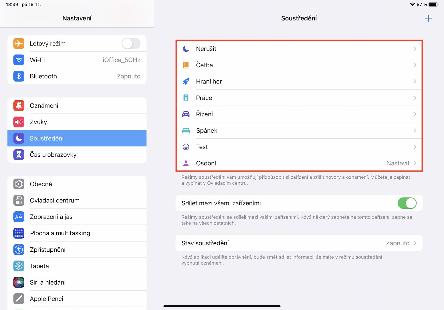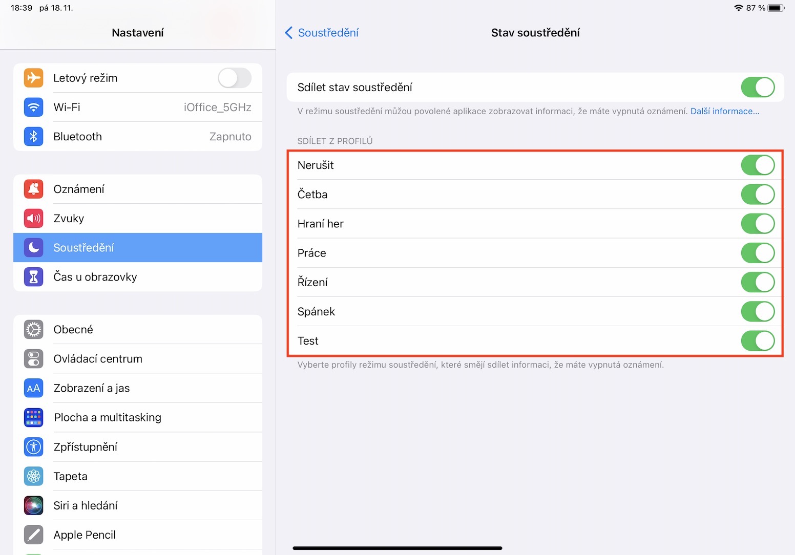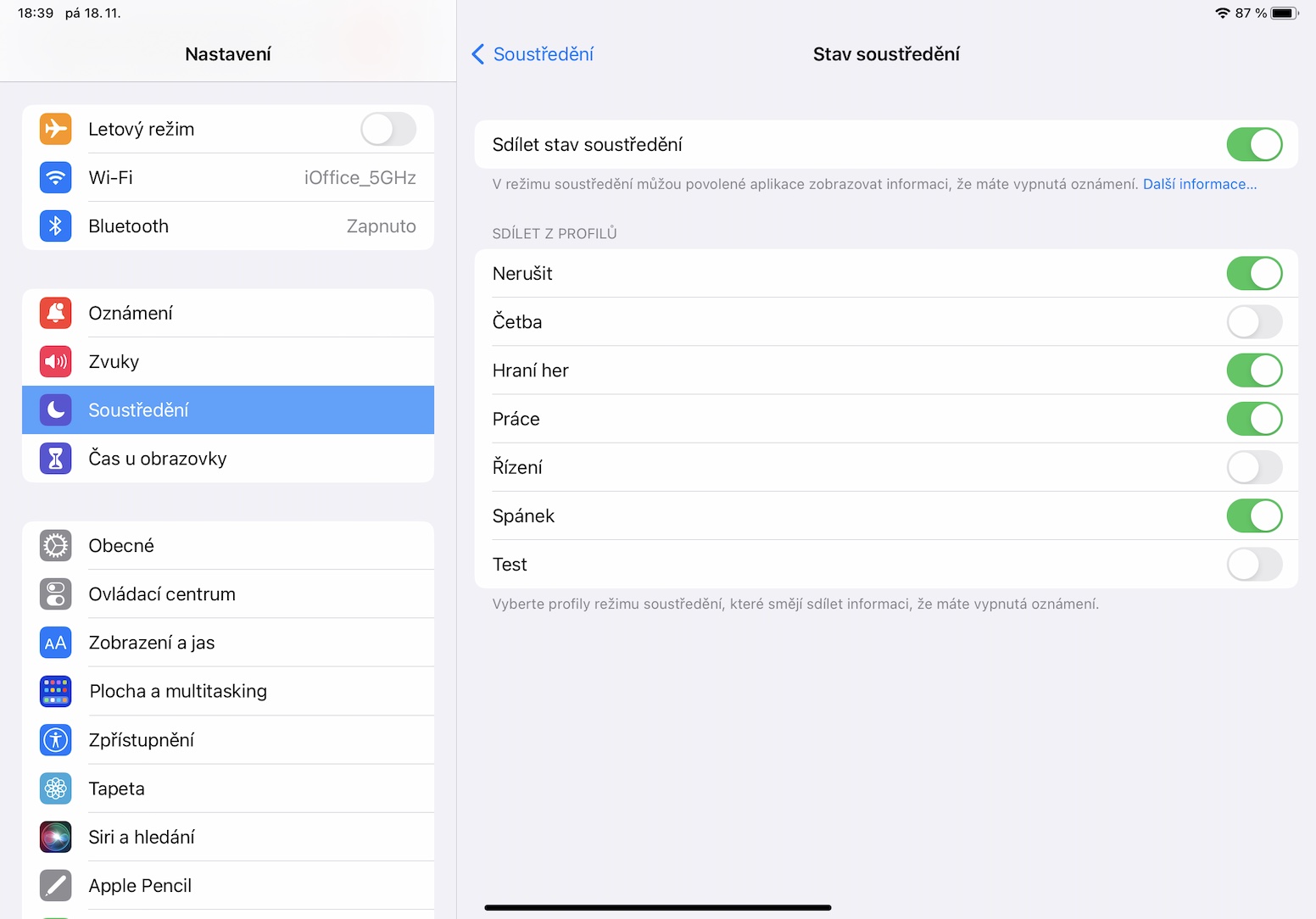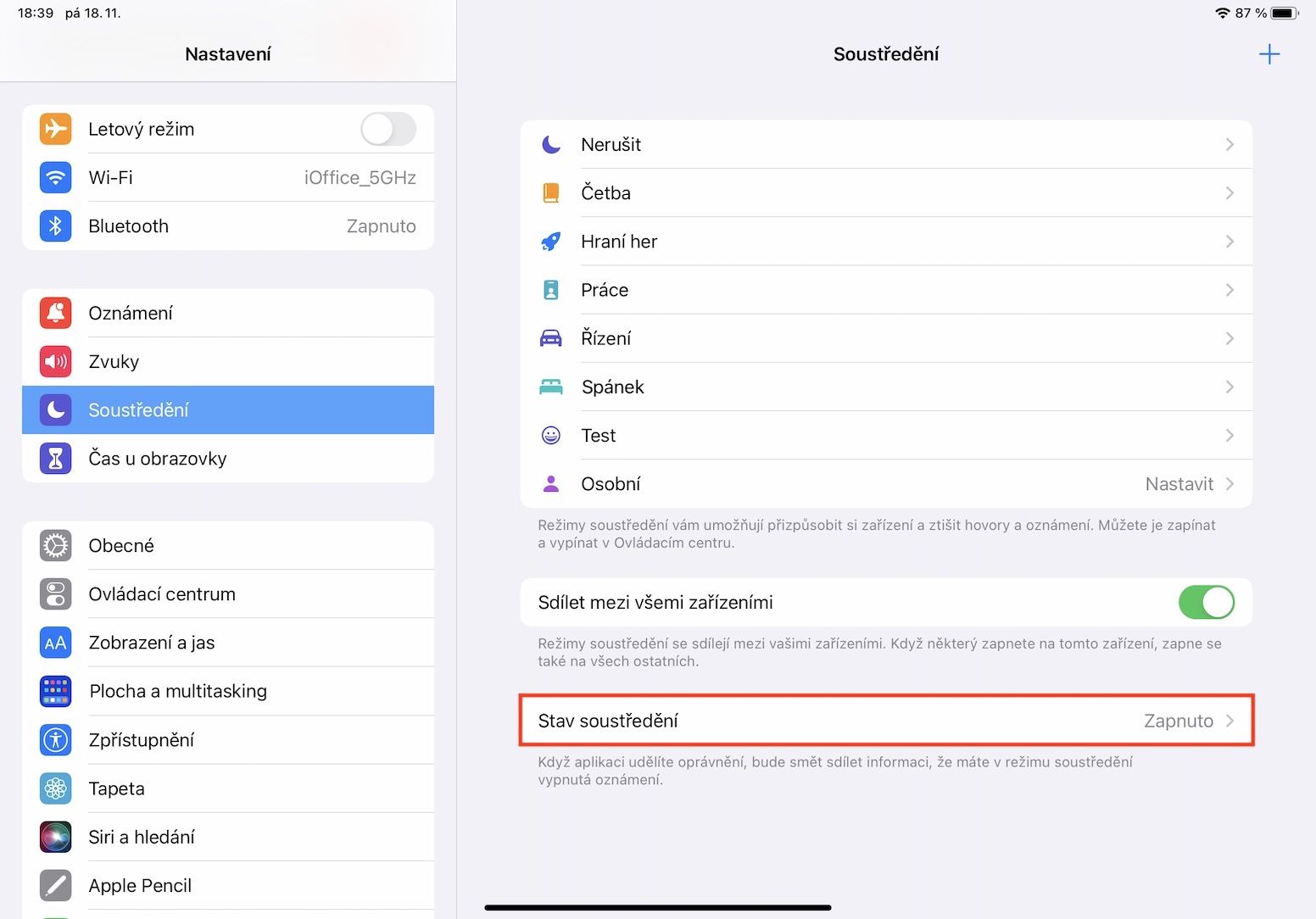 V případě, že máte aktivní režim soustředění, tak můžete nastavit, aby se vašim kontaktům v rámci konverzace v aplikaci Zprávy zobrazovalo upozornění na to, že máte ztišená oznámení. Druhá strana tak bude automaticky vědět, proč například zrovna ihned neodpovídáte. Doposud bylo možné tuto funkci nastavit plošně na všechny režimy soustředění, v novém iPadOS 16 už si však můžete přesně vybrat režimy, kde chcete sdílení stavu (de)aktivovat. Stačí přejít do Nastavení → Soustředění, kde otevřete kolonku Stav soustředění a pomocí přepínačů vše nastavte.