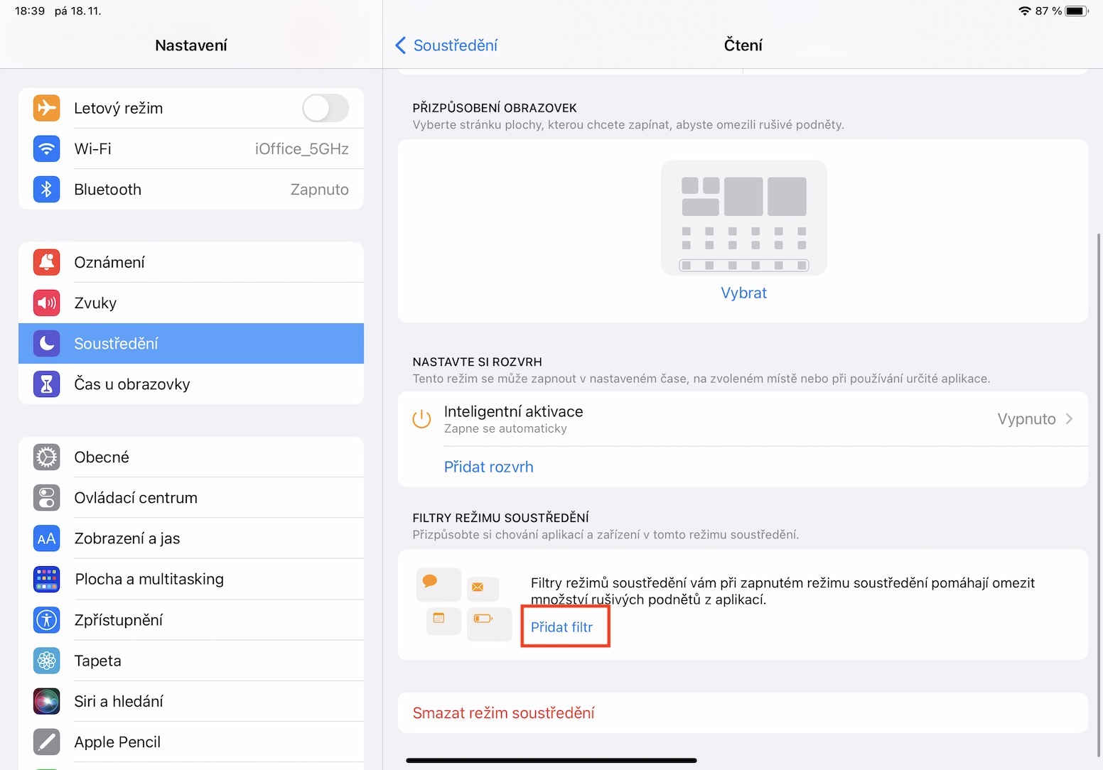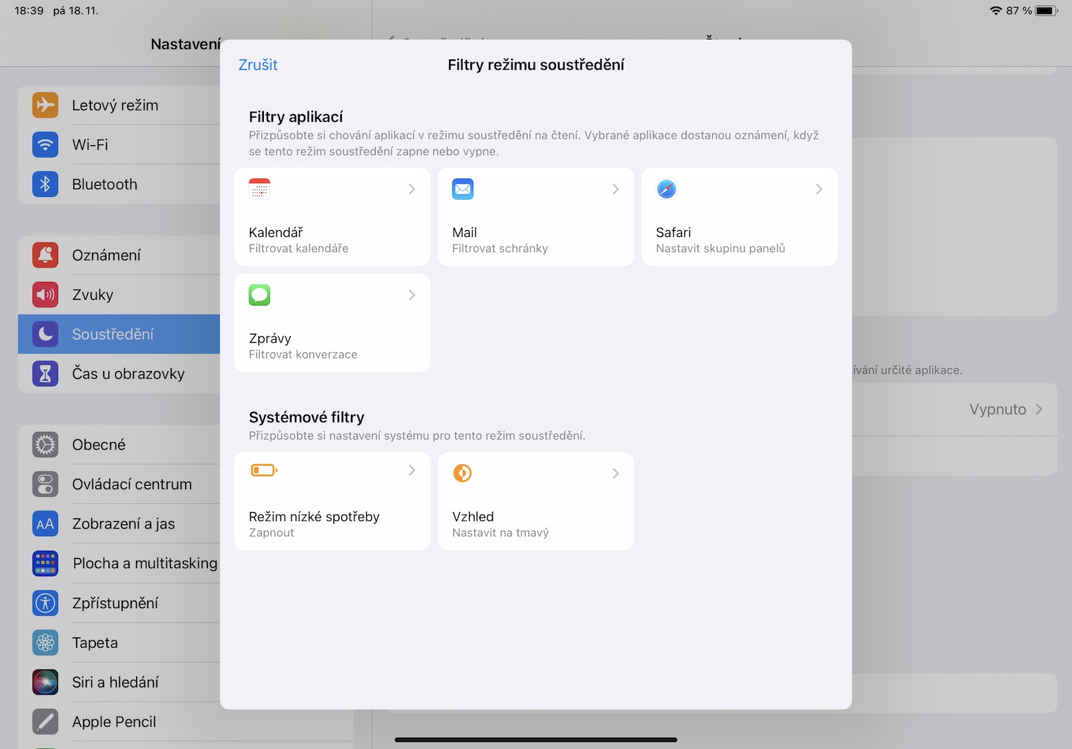 Jednou z hlavních novinek, která dorazila do soustředění na všech nových systémech, jsou filtry režimů soustředění. Ty mají za úkol jediné – omezit zobrazování obsahu v některých aplikacích, abyste se mohli lépe soustředit a nebyli jste zbytečně rušeni. Například v Kalendáři si díky filtrům můžete při práci nechat zobrazit jen pracovní kalendář, v Safari zase jen pracovní skupinu panelů apod. Postupně se tato novinka bude rozrůstat i do aplikací třetích stran – vývojáři mají k dispozici API. Pro nastavení režimů soustředění přejděte do Nastavení → Soustředění, kde otevřete konkrétní režim a níže v kategorii Filtry režimu soustředění klepněte na Přidat filtr.