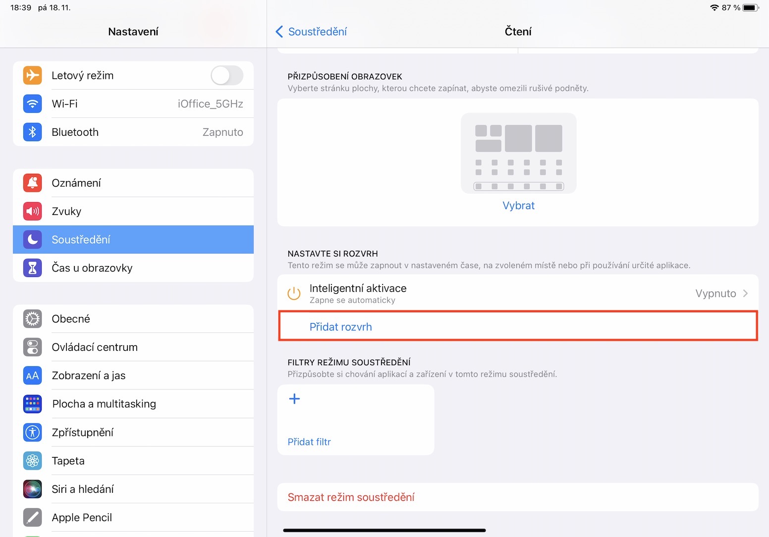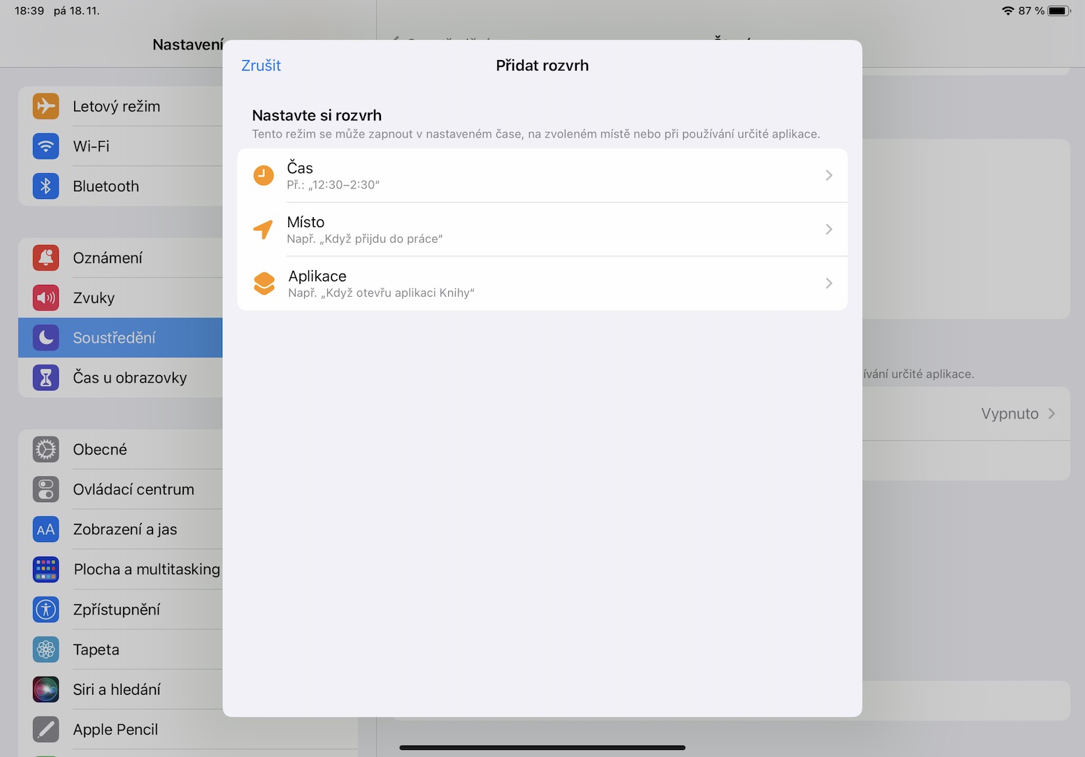 Veškeré režimy se v rámci iPadOS 16 mohou jednoduše aktivovat na základě rozvrhu. Ten se konkrétně může týkat času, místa a aplikace, tzn. k zapnutí režimu soustředění může dojít v určité časové rozmezí, na vybraném místě nebo po zapnutí aplikace. Pro nastavení stačí přejít do Nastavení → Soustředění, kde otevřete konkrétní režim, a poté v kategorii Nastavte si rozvrh klepněte na Přidat rozvrh.