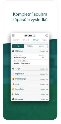 Pokud vám postačí ne tak podrobná data, zkuste aplikaci Sport.cz. Je kompletně v českém jazyce a velmi přehledná. Výhodou je fakt, že vám poslouží jakožto „sportovní zpravodaj“ i po konci mistroství světa. Nevýhodou, jak už zmiňuji v úvodní větě, bude možná nedostatek nejpodrobnějších informací. Také se dá počítat s jistou časovou prodlevou informačního toku. Pokud ale nehltáte každé zranění a prohlášení trenérů, je aplikace naprosto dostačující.
