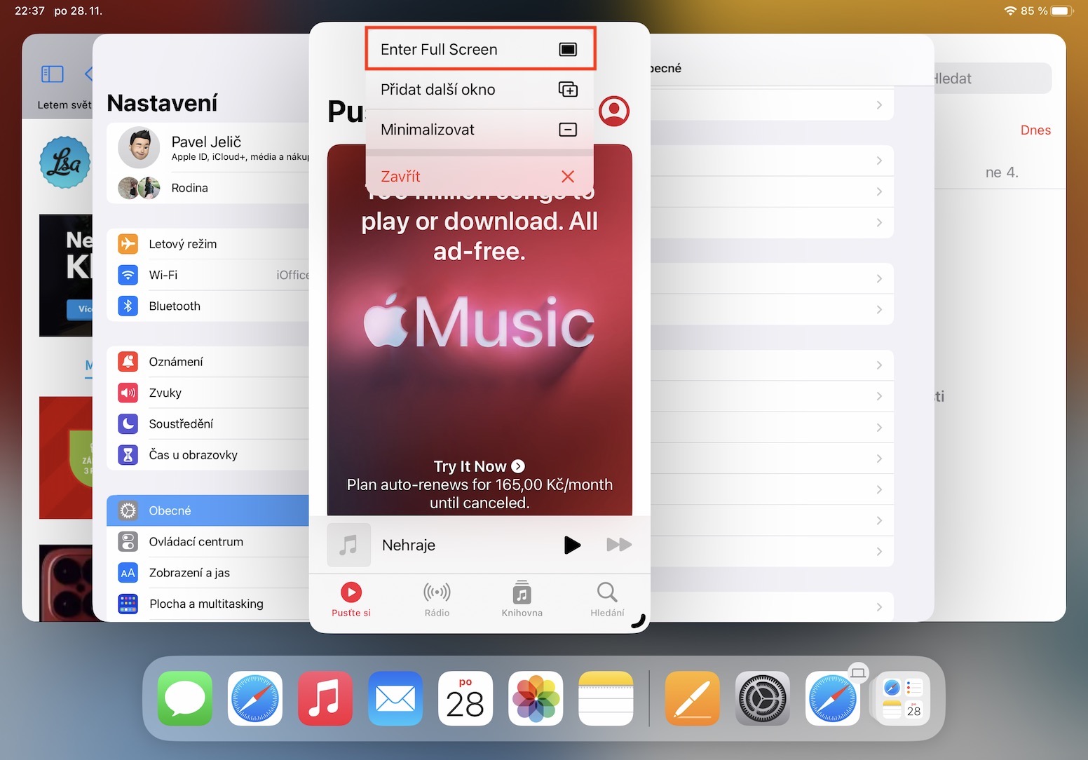 Chtěli byste se soustředit jen na jedno okno a přesunout ho do režimu celé obrazovky? Pokud ano, tak i tohle je možné – ve Stage Manageru rozhodně nejste prostorově limitováni okraji a s panelem s okny. V případě, že byste chtěli u aplikace režim celé obrazovky zapnout, tak v ní uprostřed nahoře klepněte na ikonu tří teček a zvolte možnost pro přejití do režimu celé obrazovky. Pro jeho vypnutí pak stačí zase změnit velikost okna, tedy zmenšit ho.
