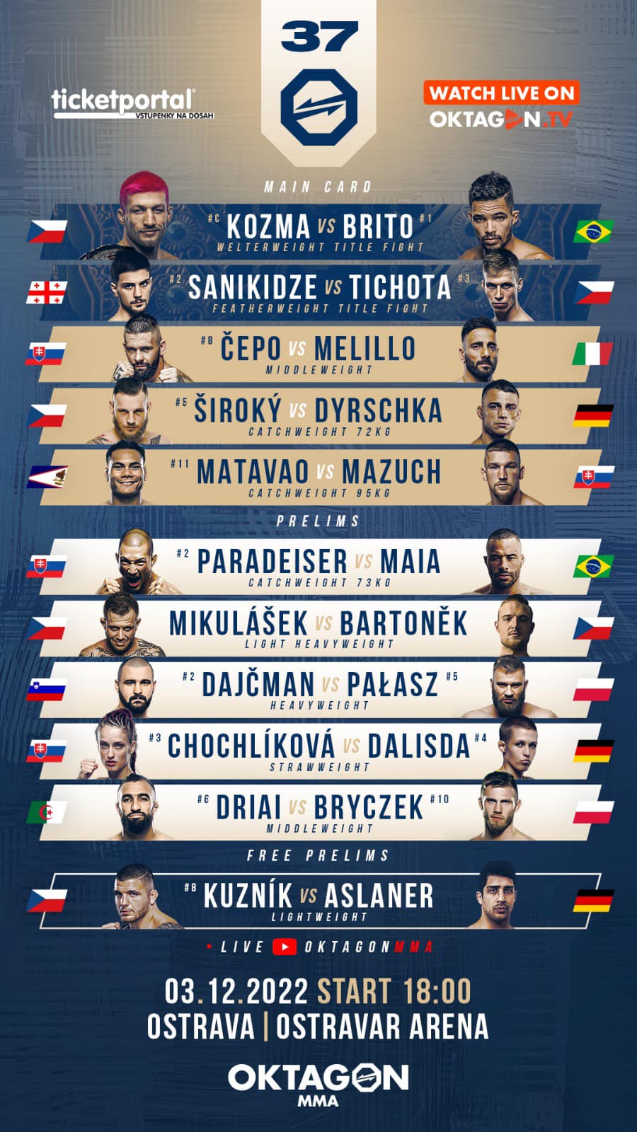 Oktagon 37 živě by dnes měl běžet na obrazovce naprosto každého fanouška MMA. Po několikatýdenním půstu tu totiž máme další turnaj domácí organizace OKTAGON MMA, který se navíc svou startovkou jeví více než zajímavě. (Tip: Oktagon online zdarma sledujte zde) O jeho hlavní zápas se postará Kozma s Britem v zápase o titul šampiona welterové divize. Těšit se ale můžete třeba i na Mikuláška, Tichotu, Kuzníka a mnoho dalších hvězd. Zatímco předešlé hvězdně obsazené turnaje včetně toho, na kterém se utkal Vémola s Véghem, byly vysílány mimo jiné na O2 TV Sport v Česku a na JOJ Plus na Slovensku, posledních několik turnajů včetně toho dnešního ve formě OKTAGON 37 běží jen na dvou platformách – konkrétně na OKTAGON.tv skrze Pay per view a na Tipsportu.