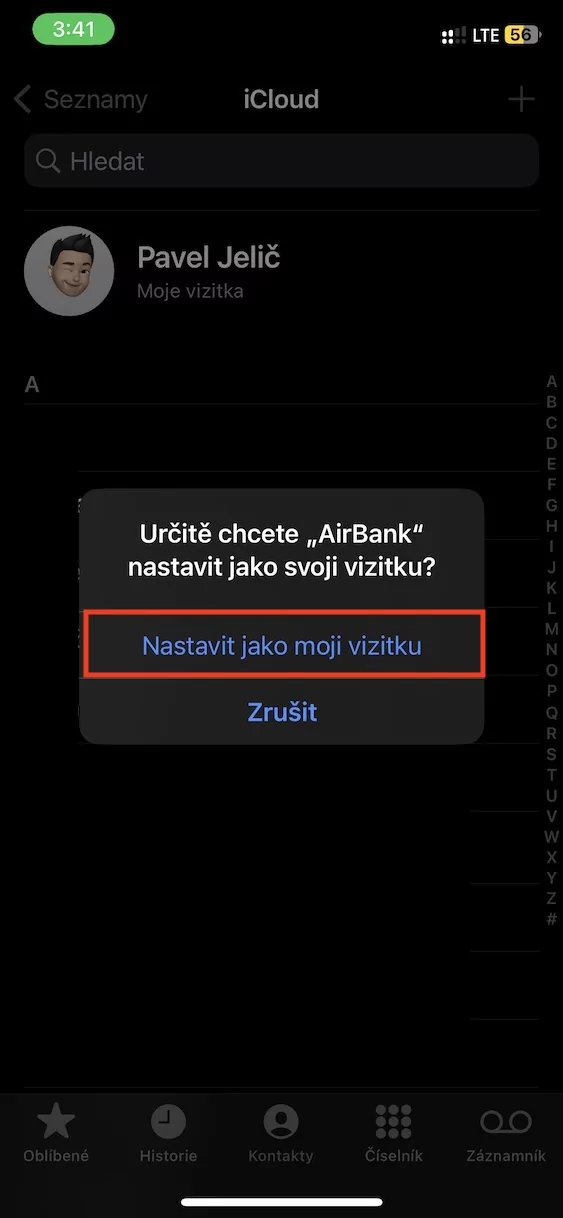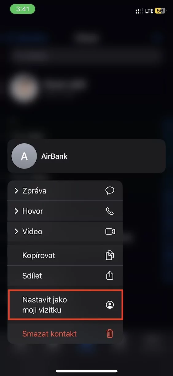 Jak na iPhone nastavit kontakt jako vlastní vizitku