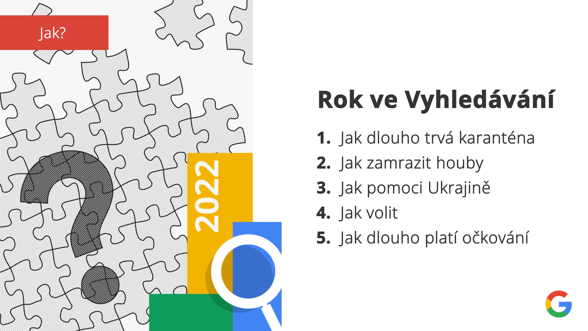 Žebříček „Jak“ poznamenala doznívající pandemie a Češi se tak ptali na to, jak dlouho trvá karanténa. Dokonce čtyři z deseti nejvyhledávanějších pojmů žebříčku byly spojené s koronavirem. Otázka „Jak pomoci Ukrajině?“ obsadila třetí příčku a naplno ukázala solidaritu Čechů s válkou zmítanou Ukrajinou.