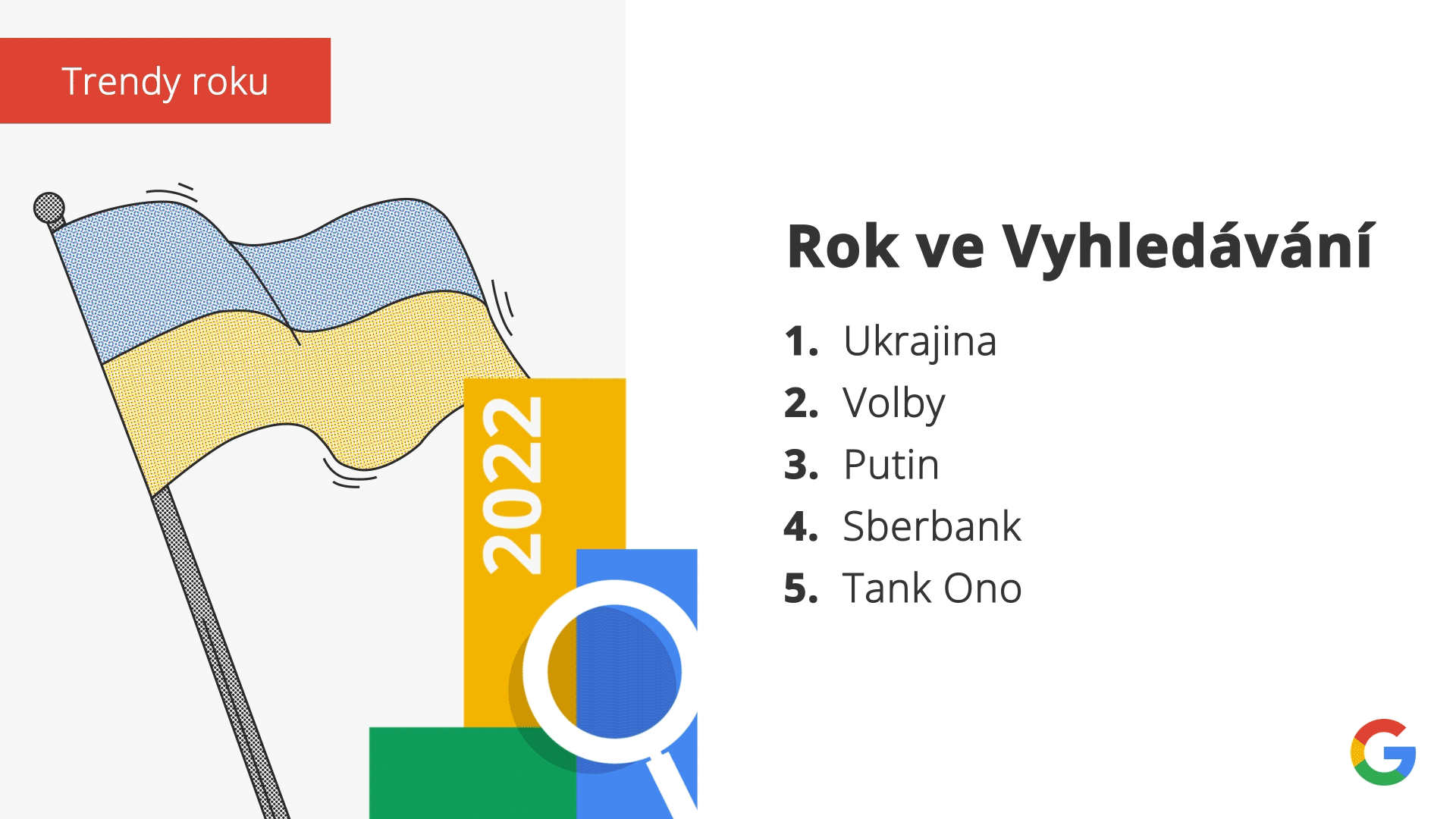Na předních příčkách seznamu výrazů, jejichž objem vyhledávání letos nejvíce vzrostl oproti předchozímu roku, se objevují témata spojená s válkou na Ukrajině, komunální a senátní volby, síť čerpacích stanic nabízející nejlevnější ceny benzínu Tank Ono nebo insolvence banky Sberbank. Do žebříčku TOP 10 se letos probojovala i česká reality show Survivor a seriál Devadesátky.