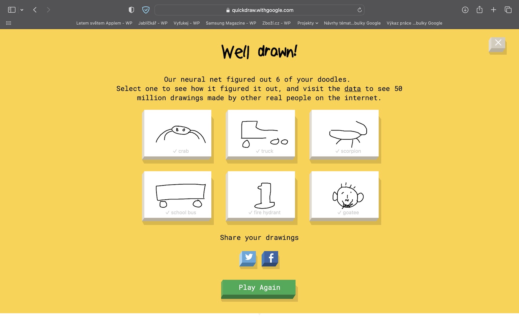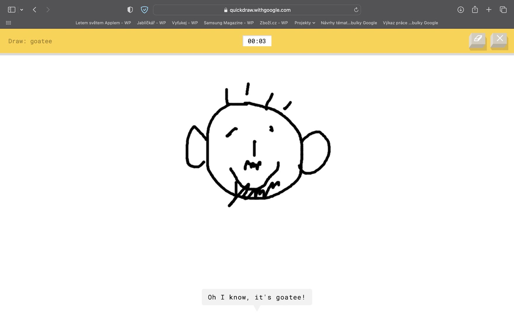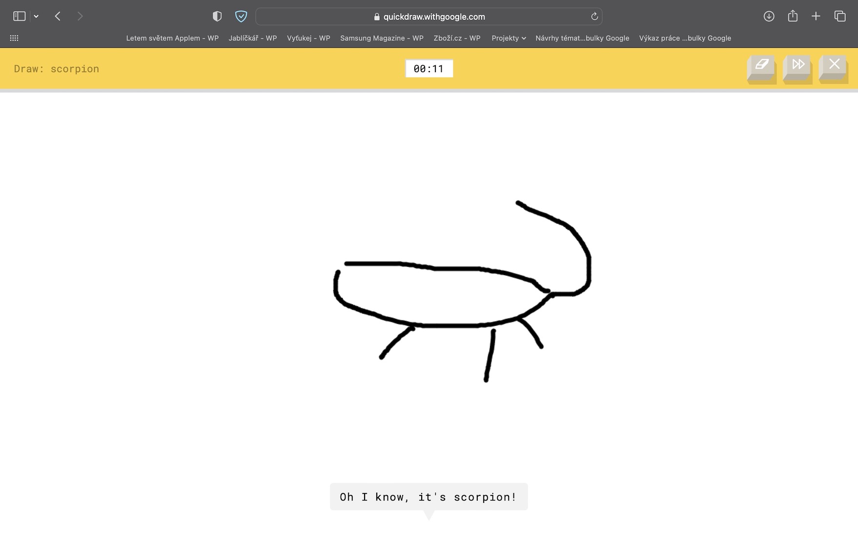 Na závěr jsem si pro vás připravil velmi jednoduchou hru, ve které si můžete ověřit, jak moc dokáže být umělá inteligence chytrá. Jedná se konkrétně o Quick, Draw!, což je nástroj, který dokáže na základě vašeho malování určit, co zrovna kreslíte. V praxi to funguje tak, že vám je zadáno nějaké slovo, které začnete kreslit s tím, že umělá inteligence hádá, co vlastně kreslíte. Na uhádnutí kreslené věci má Quick, Draw! rovných 20 sekund a zatím se mi ani jednou nestalo, že by něco neuhádl. Ve všech případech to zvládl během několika málo sekund, a to se z hlediska kreslení skutečně řadím mezi maximální antitalenty. Quick, Draw! je taktéž k dispozici zdarma a pro krátkodobé zabavení byste ho určitě měli využít.