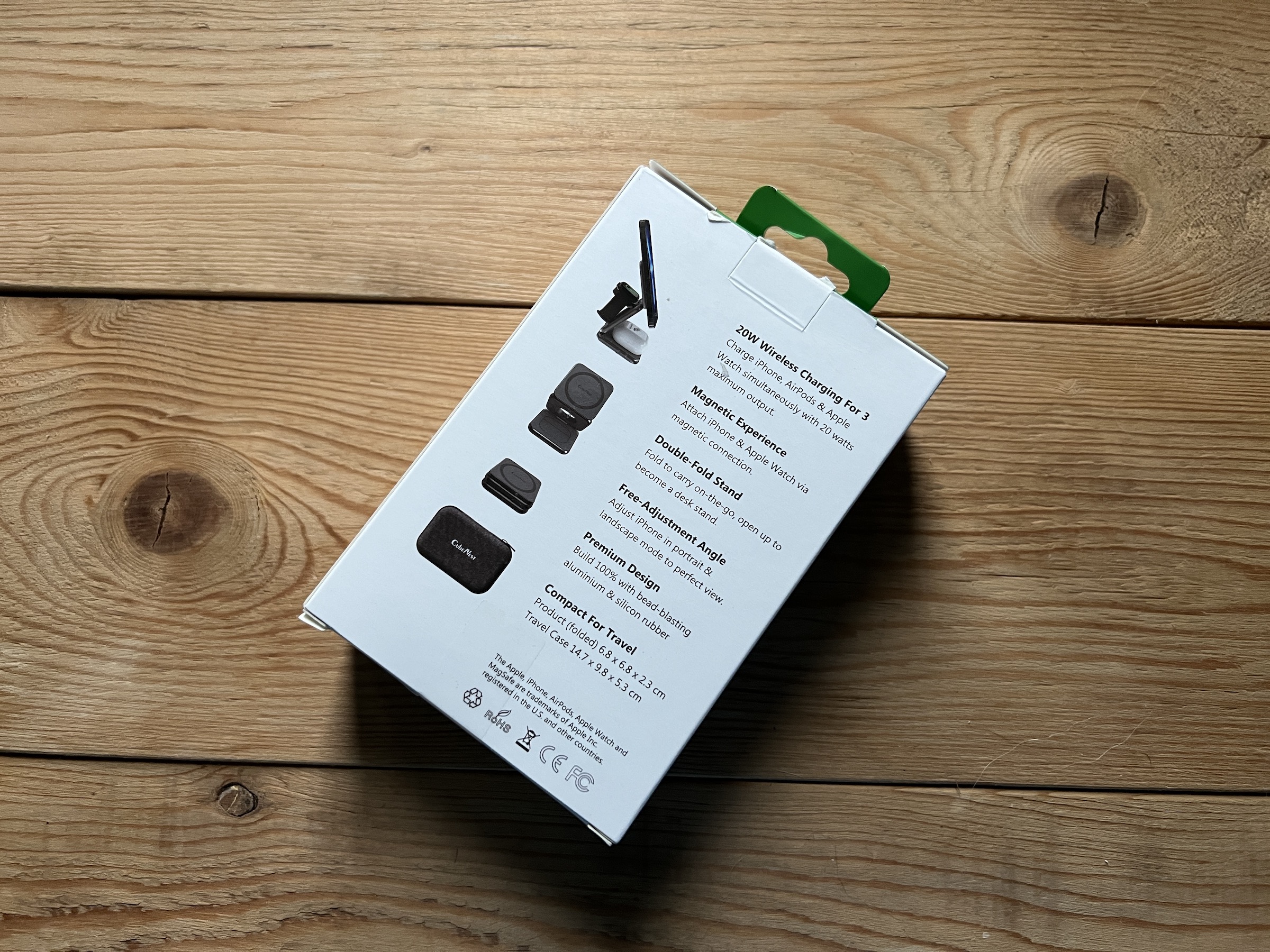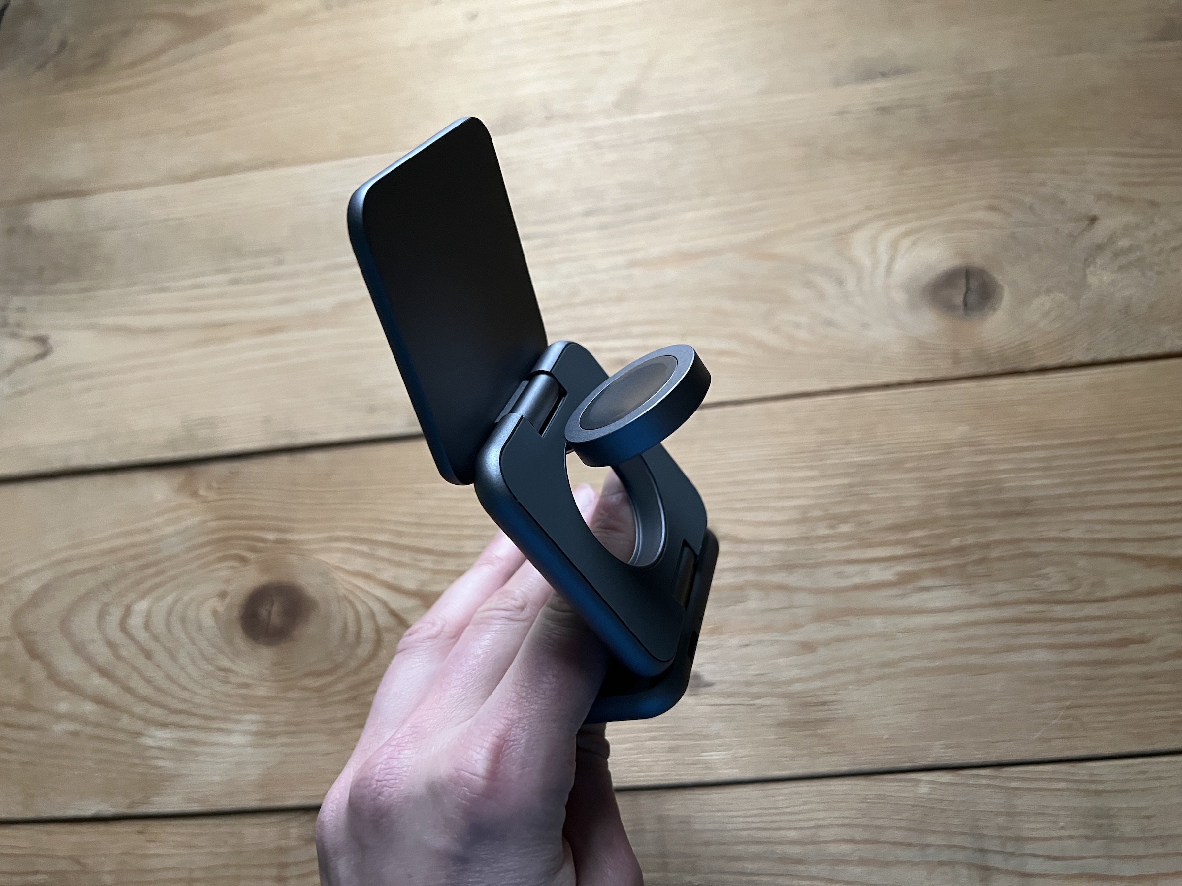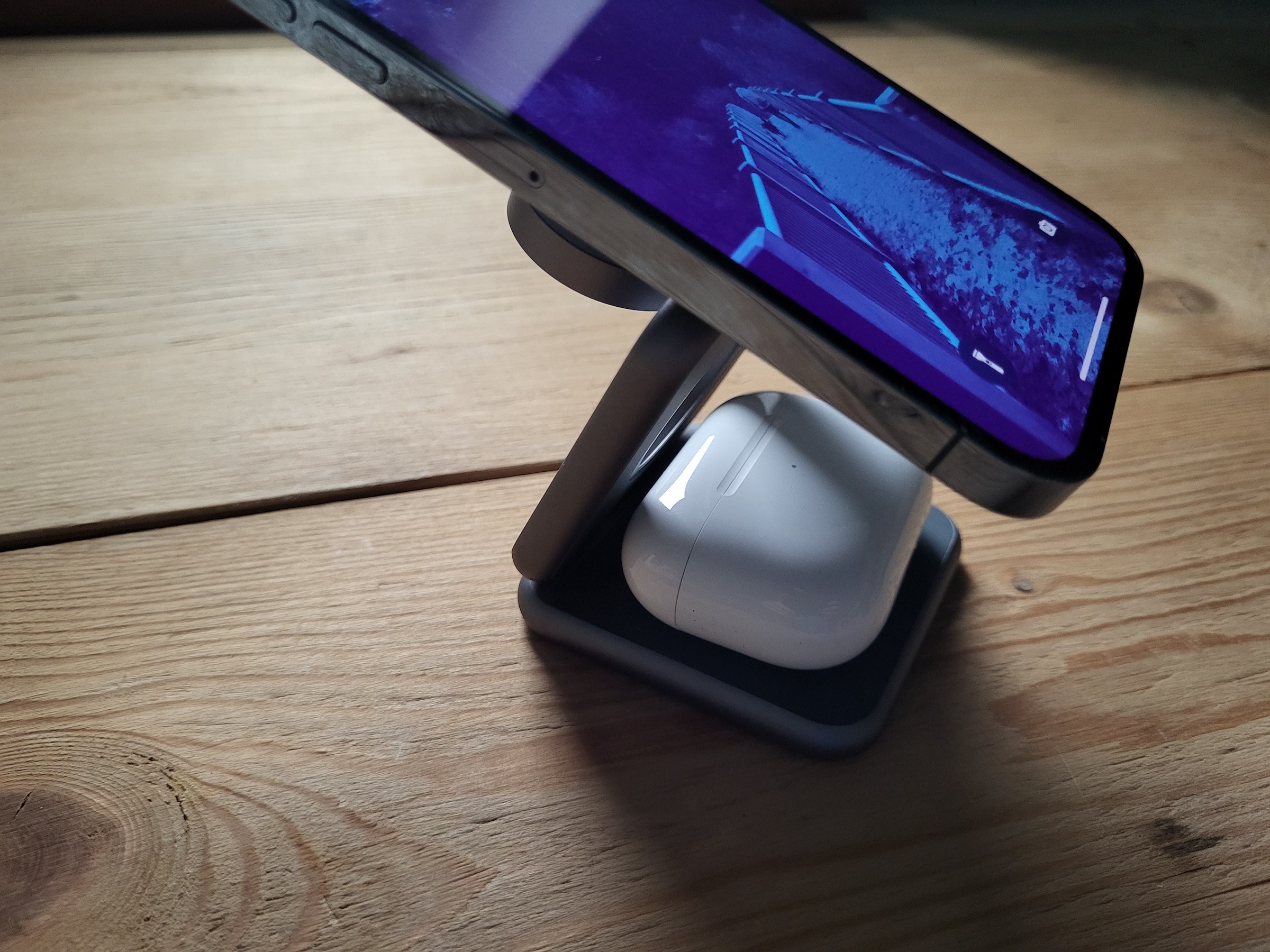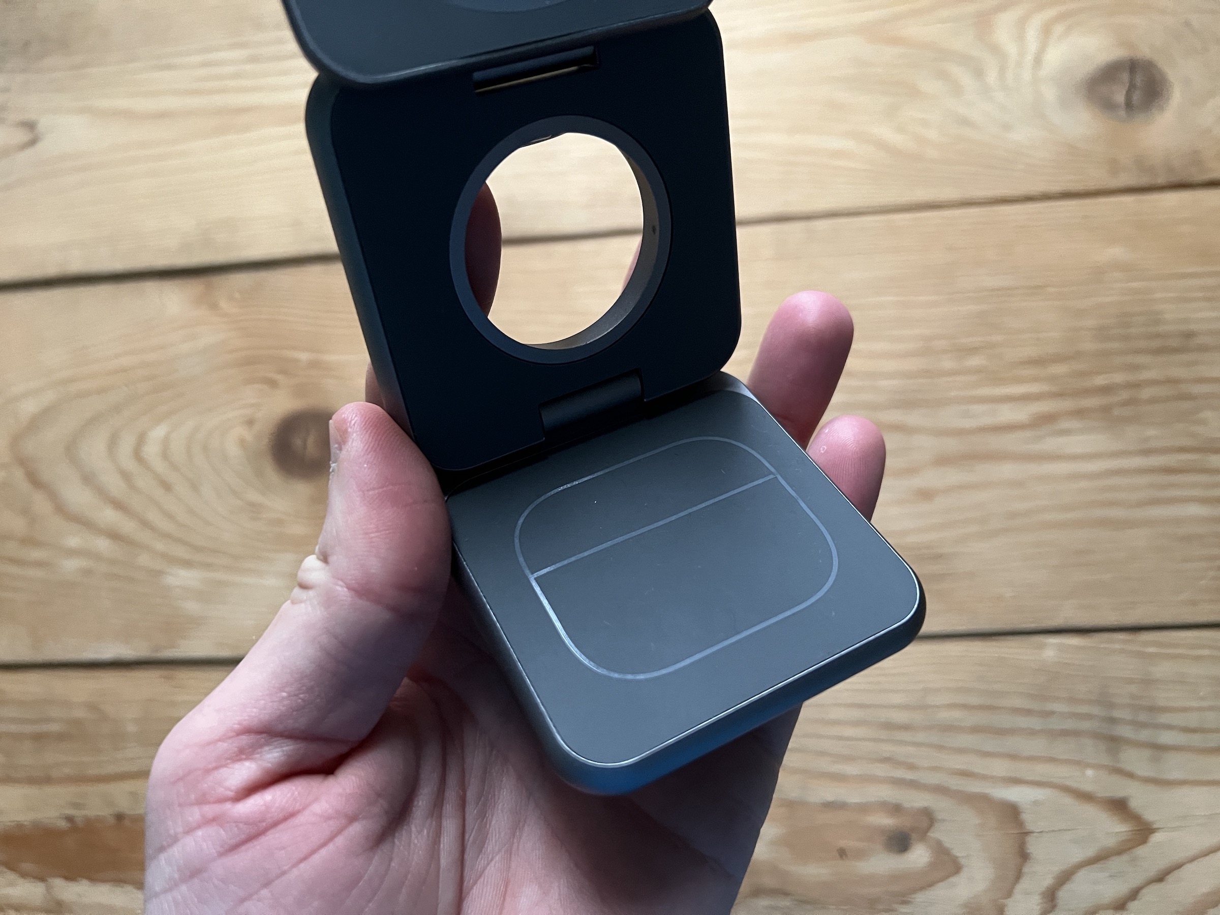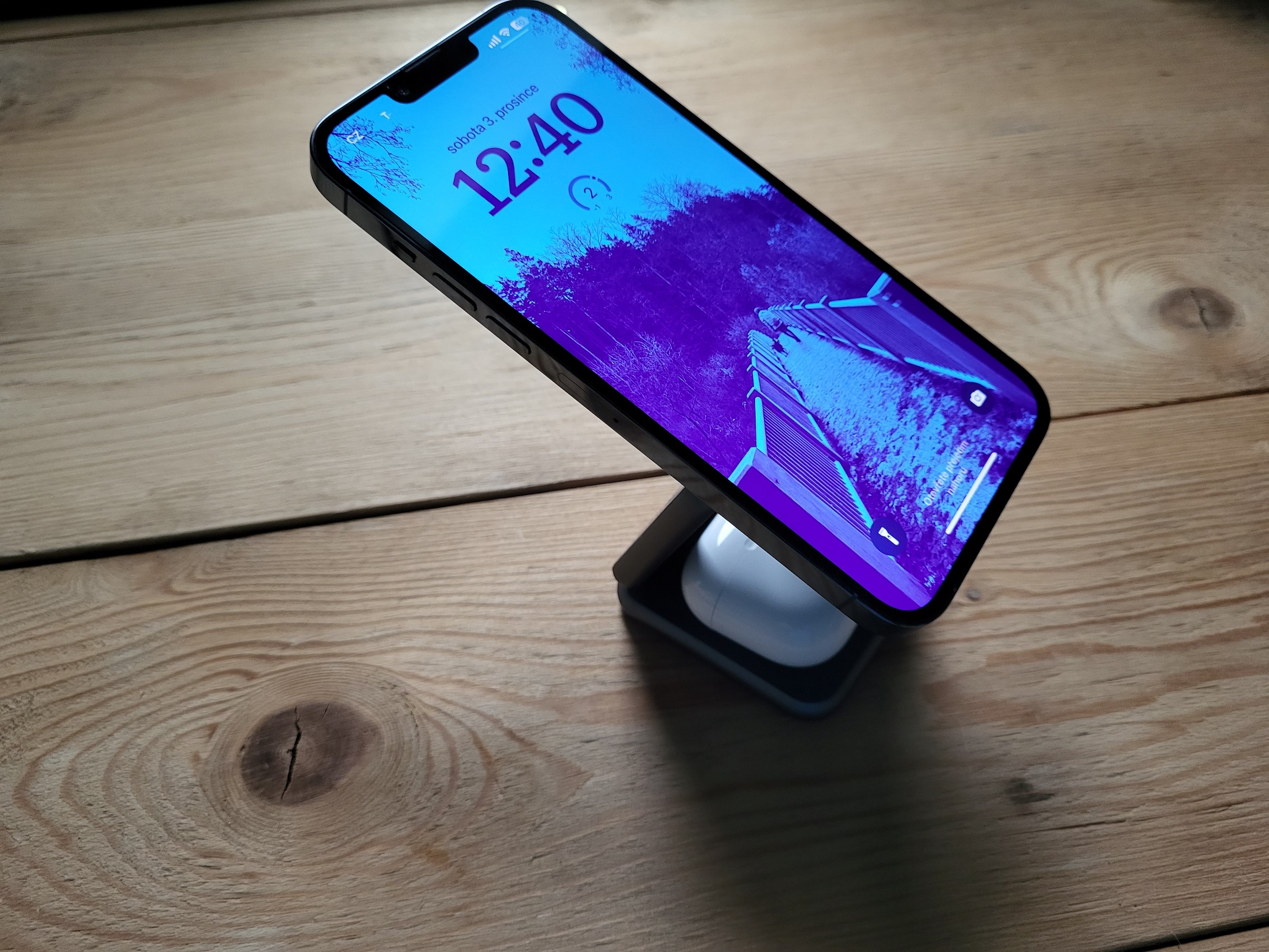Jedná se vlastně o bezdrátovou nabíječku, která poskytuje tři plochy k nabíjení vašich zařízení. Ta hlavní tedy slouží k nabíjení MagSafe iPhonů, ale zvládne klidně i Android telefony, jen musíte stojánek nastavit do vodorovné polohy. Prostřední část je určena výhradně Apple Watch. Nabíjecí puk lze nechat zarovnaný se stojanem, nebo jej můžete vyklopit a hodinky na něho položit nehledě na to, jaký u nich používáte řemínek nebo tah. Spodní plocha je pak určena pro nabíjení sluchátek, je přitom jedno, jestli to jsou AirPody, Galaxy Buds nebo nějaké jiné, které bezdrátové nabíjení podporují (konkrétně se jedná o AirPods 2. generace, AirPods 3. generace, AirPods Pro, AirPods Pro 2. generace a ostatní zařízení s podporou nabíjecího standardu Qi).