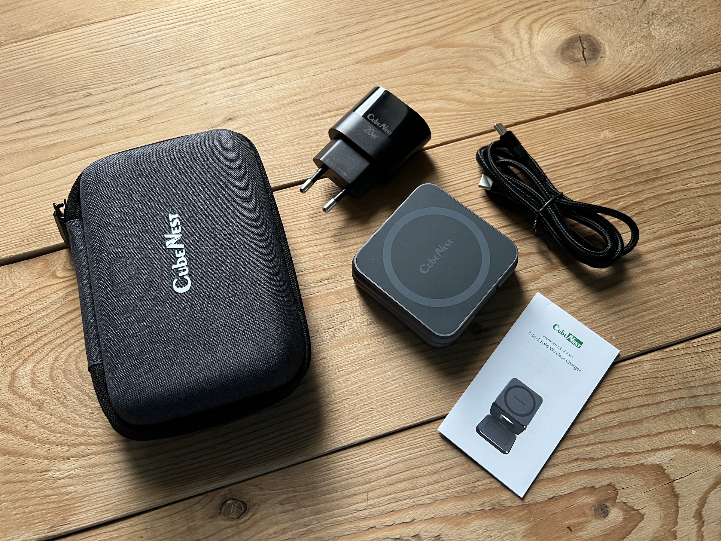 Pokud máte iPhone, Apple Watch a AirPody, tak abyste všechna zařízení nabíjeli v jeden čas, potřebujete tři adaptéry a tři kabely, nebo jednu CubeNest 3v1 bezdrátovou MagSafe nabíječku S312. Ta je určena především pro všechny cestovatele, na což se myslelo už v samotném balení. Vyjma nabíječky zde totiž najdete i 20W PD adaptér, 1m nylonem opletený USB-C na USB-C kabel a cestovní pouzdro, do kterého všechno elegantně uložíte.