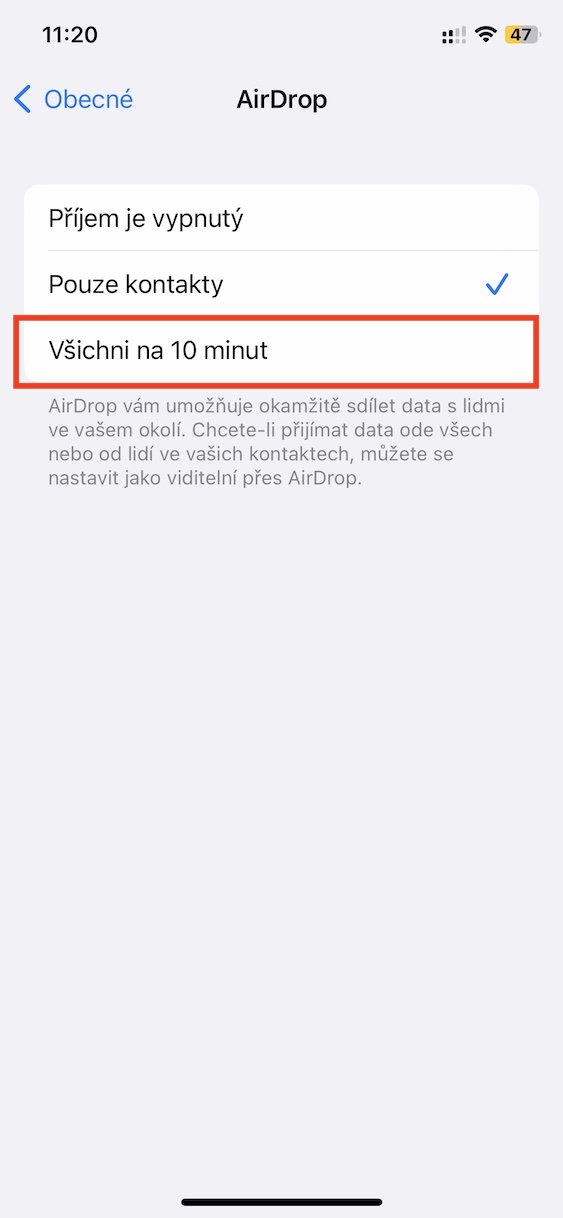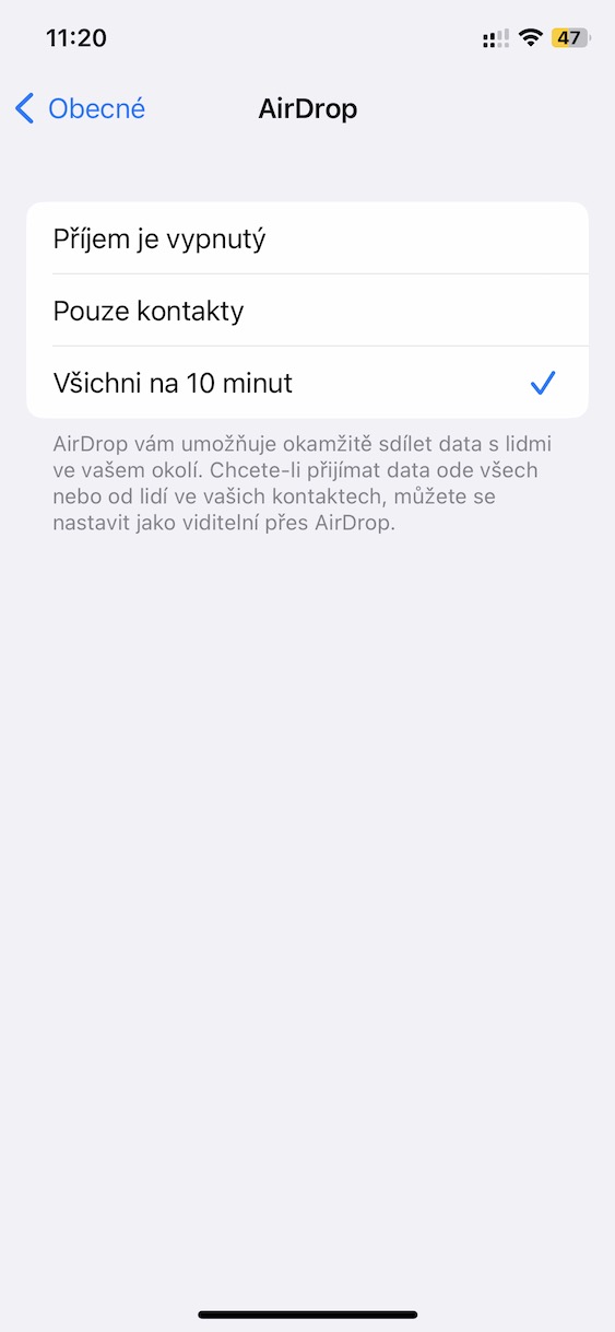Výše uvedeným způsobem lze tedy na iPhonu jednoduše a rychle změnit nastavení viditelnosti AirDropu. Jakmile zmíněných 10 minut uběhne, tak dojde k automatickému přepnutí viditelnosti zpět na Pouze pro kontakty. V praxi to mimo jiné znamená, že na veřejných místech přijdeme o (rizikovou) zábavu v podobě posílání různých obrázků náhodným lidem. Případně můžete samozřejmě nastavení viditelnosti AirDropu změnit v Nastavení → Obecné → AirDrop.