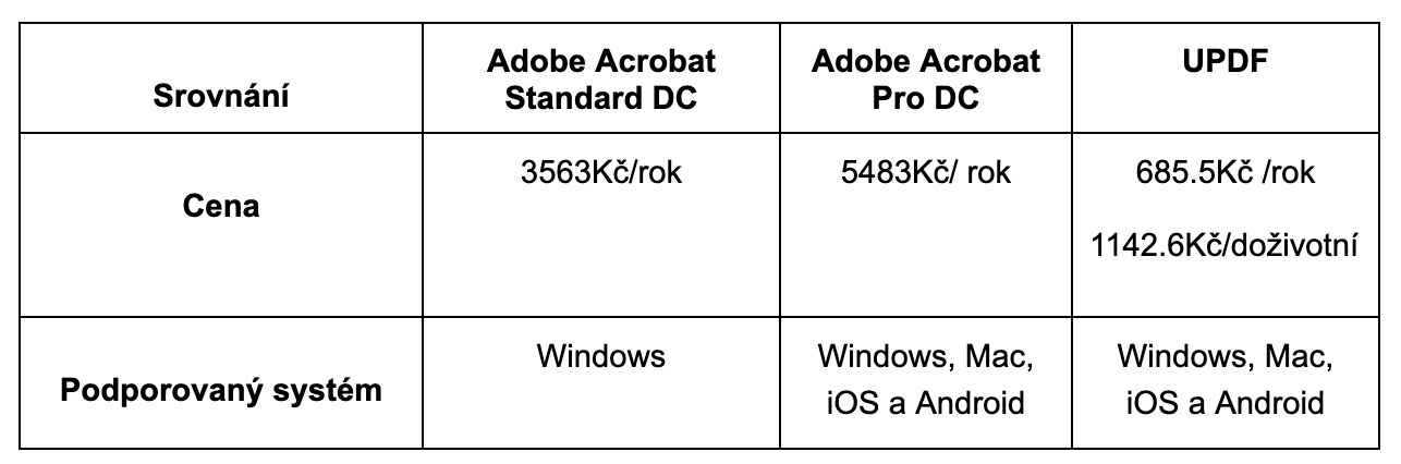 Určitě také nesmíme zapomenout na kompatibilitu. K čemu by nám byl totiž software, kdybychom jej nemohli nainstalovat na zařízení, se kterým pracujeme. To je částečně problém řešení Adobe Acrobat. Přestože Adobe Acrobat Pro je k dostání pro Windows, Mac, iOS i Android, verze Standard funguje pouze na Windows. Pokud se tedy řadíte mezi jablíčkáře, jste prakticky nuceni k pořízení dražší varianty. Naopak UPDF nabízí plnou podporu napříč všemi platformami. Hravě software spustíte jak na Macu či iPhonu, tak i v rámci systémů Windows a Android. pokud se chcete dozvědět více o srovnání, můžete zkontrolovat: srovnání mezi UPDF a Adobe Acrobat Pro DC.
