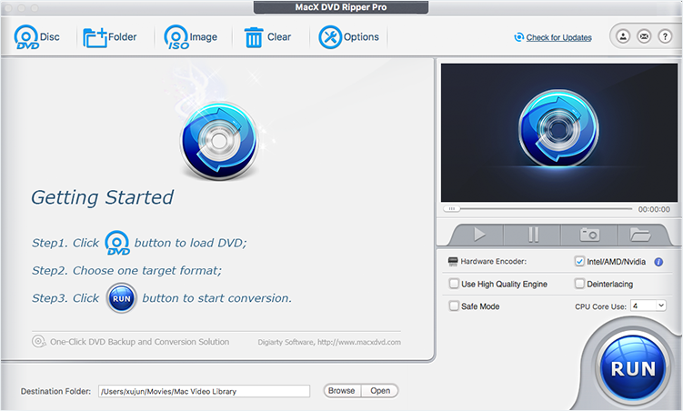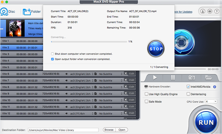 Zajímá vás, jakým způsobem lze jednoduše s využitím MacX DVD Ripper Pro převést DVD do MP4? Pokud ano, tak v tomto odstavci celý postup najdete. Prvně je samozřejmě nutné, abyste aplikaci spustili a do Macu vložili disk – využít můžete buď interní mechaniku u starších počítačů, anebo můžete připojit externí. Případně samozřejmě můžete vyhledat, kde se nachází obraz disku, tedy soubor ISO. Po načtení DVD či obrazu disku už si jen stačí zvolit výstupní video a audio formát, společně s dalšími podrobnostmi. Nezapomeňte se ujistit, že máte aktivní hardwarovou akceleraci (ve výchozím nastavení je zapnutá). Nakonec si zvolte, kam se má uložit výsledný soubor a stiskněte tlačítko RUN, čímž se spustí převod. Následně už jen stačí vyčkat na dokončení převodu.