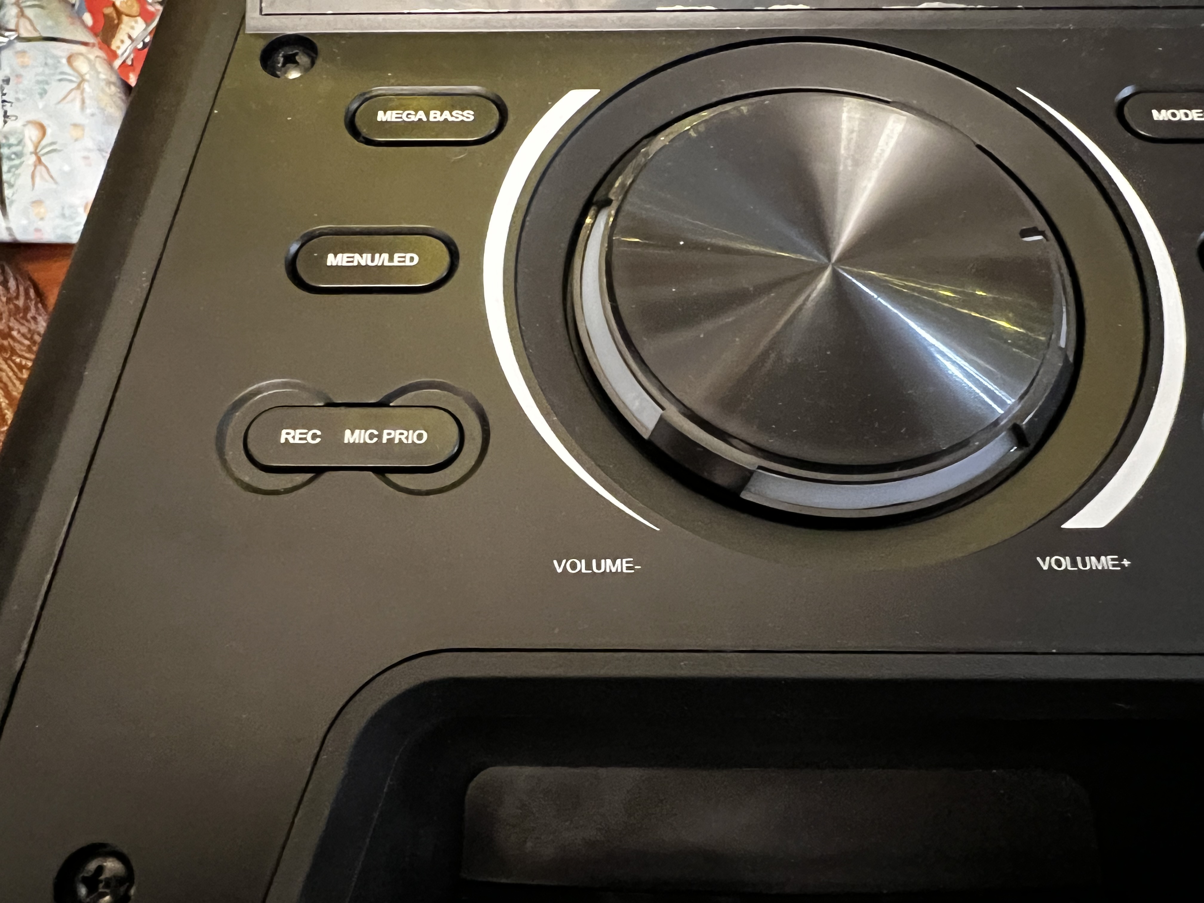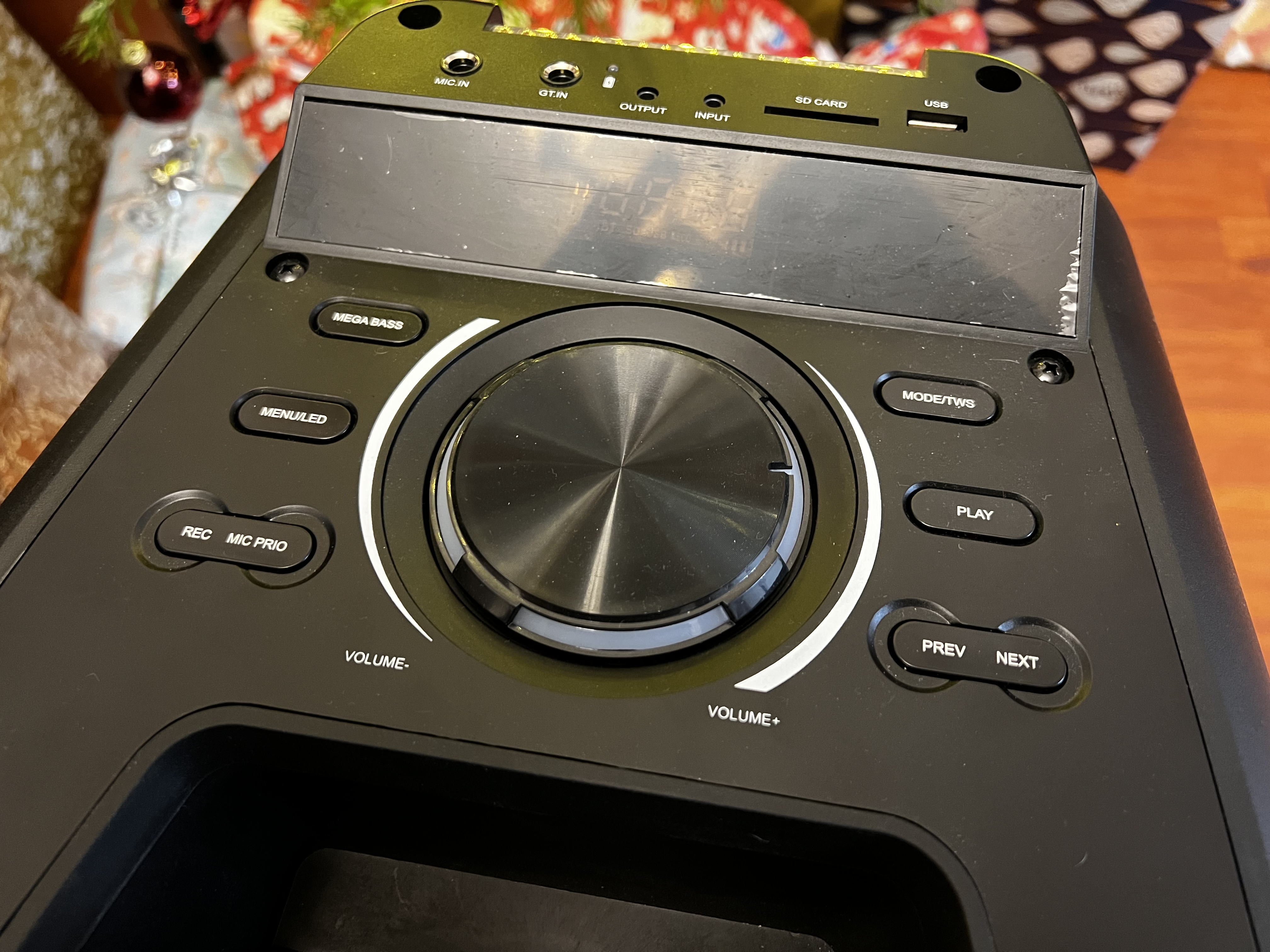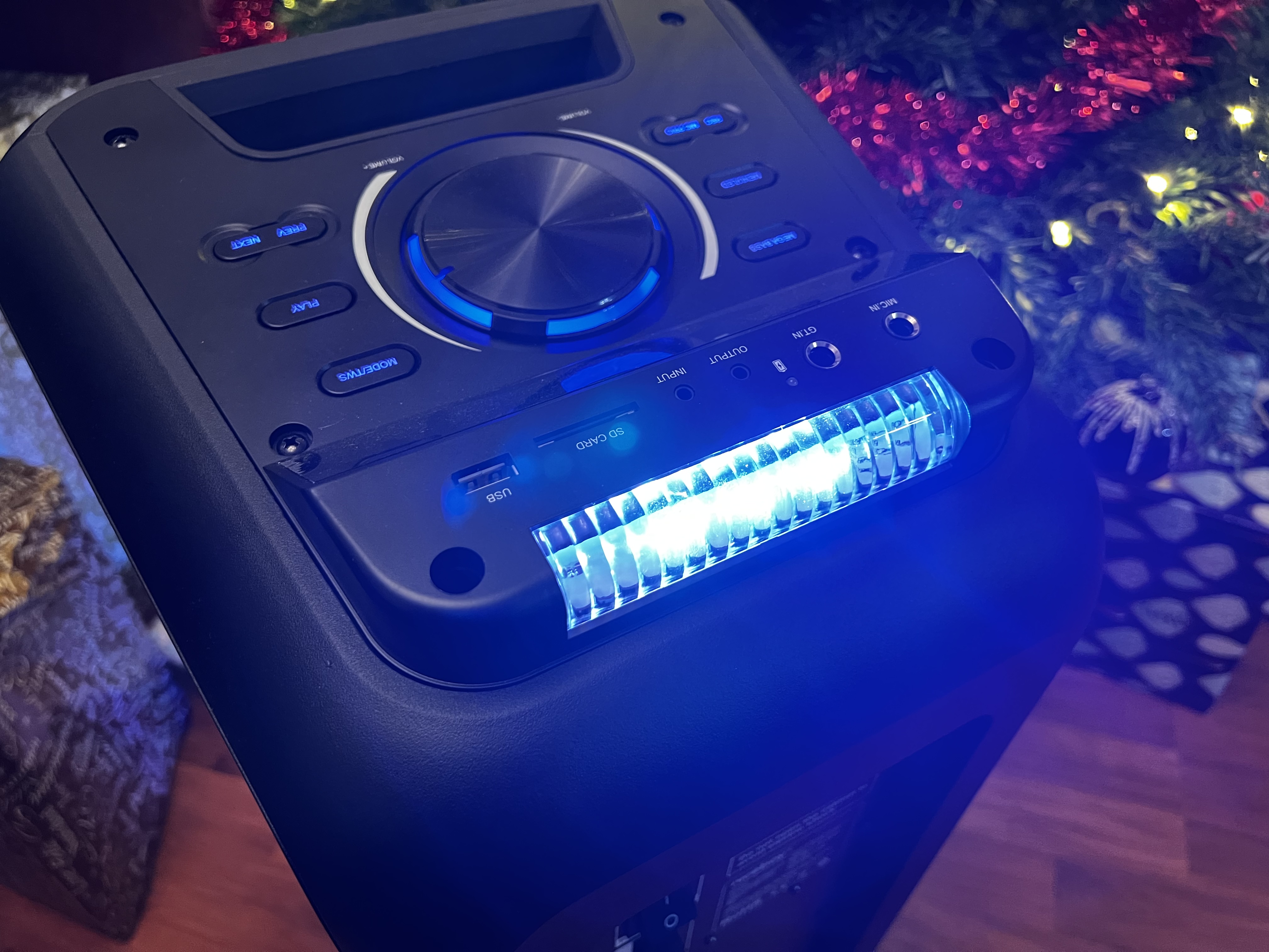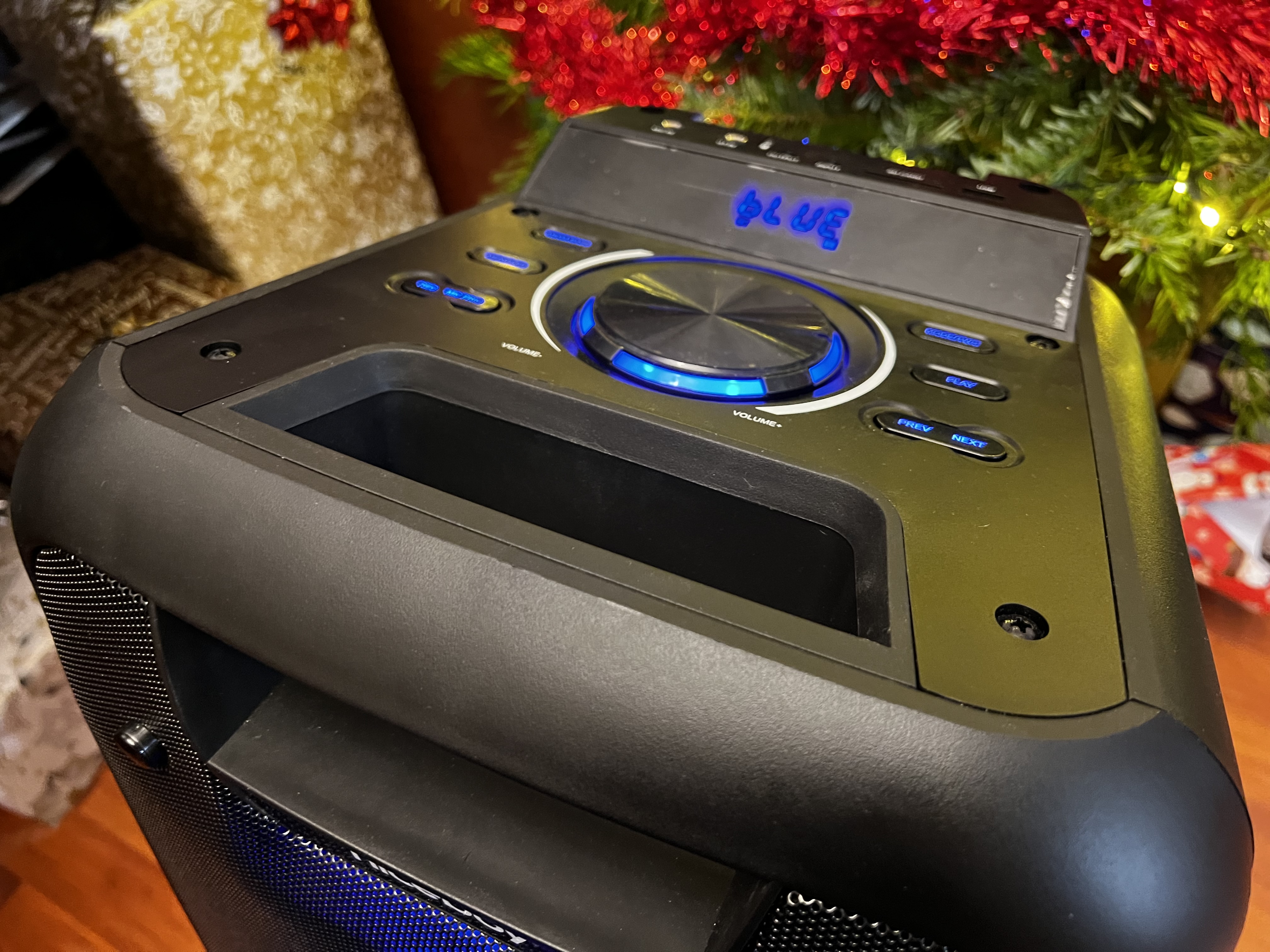 Veškeré ovládací centrum je ale na horní straně, kde naleznete taktéž madlo pro „snadnější“ přenos. Celému ovládacímu panelu vévodí velké a podsvícené tlačítko pro ovládání hlasitosti. V horní části panelu naleznete dvojici 6,3 mm jacků pro mikrofon a kytaru, vstup a výstup pro 3,5 mm jack, slot na SD kartu a USB-A konektor. Hudbu tedy nemusíte nutně pouštět skrze Bluetooth. Dále je na horním panelu k nalezení displej, který zobrazuje navolené režimy, aktuální hlasitost apod. Tlačítky pod displejem budete ovládat basy, rádio, přeskakování skladeb, světla, basy, výšky, echo efekt u mikrofonu, hlasitost mikrofonu apod. Podobné záležitosti můžete ovládat i skrze dodávaný ovladač. U tohoto reproduktoru se zkrátka bez manuálu neobejdete a minimálně v prvních krocích jej budete muset mít po ruce.